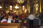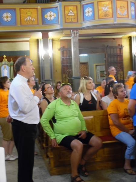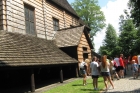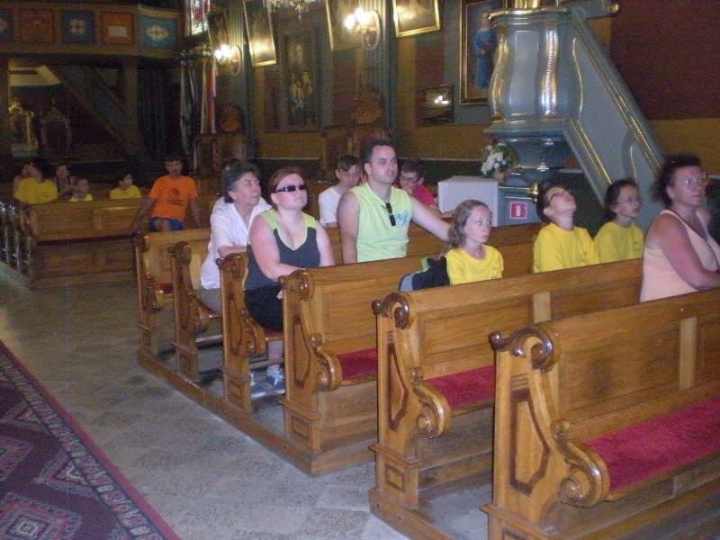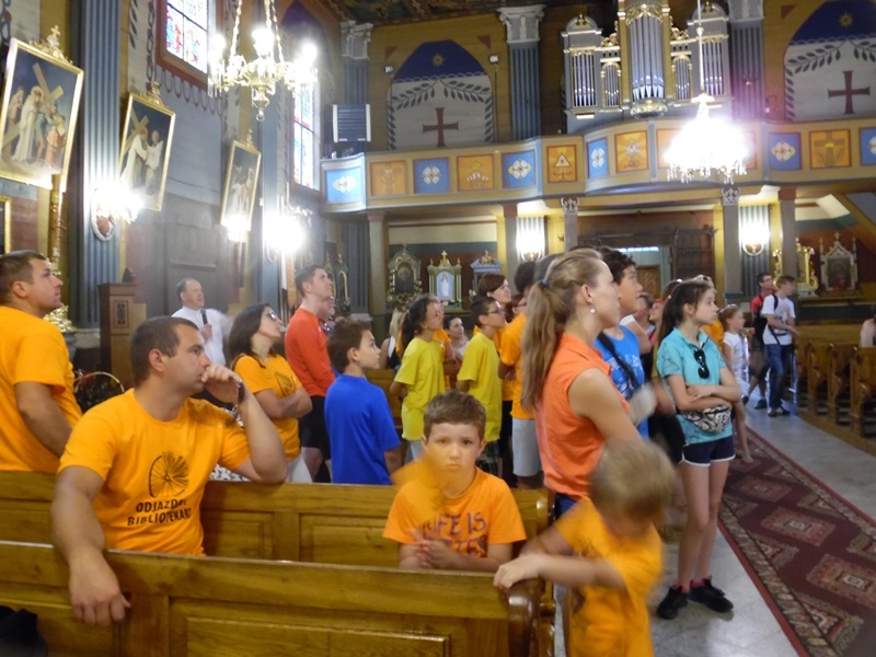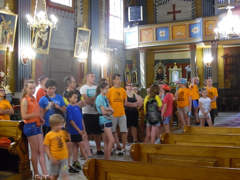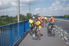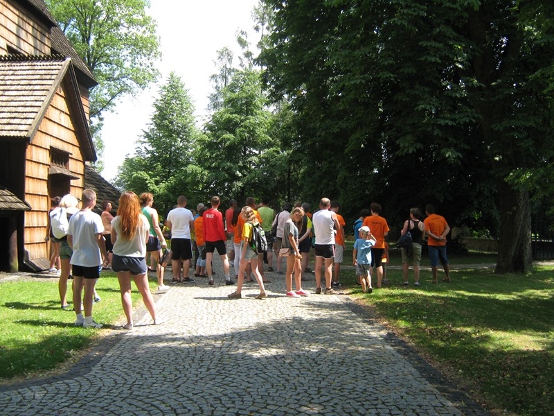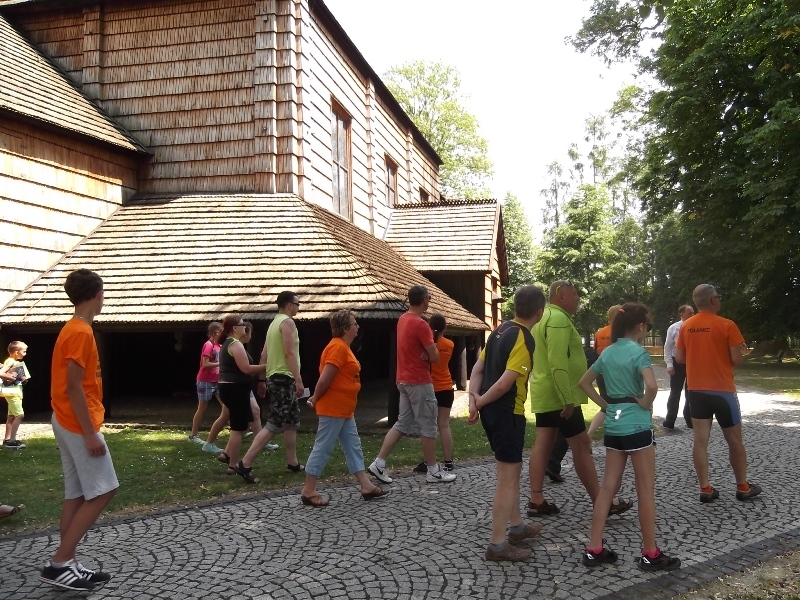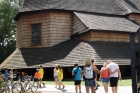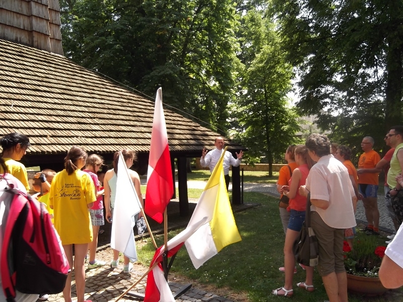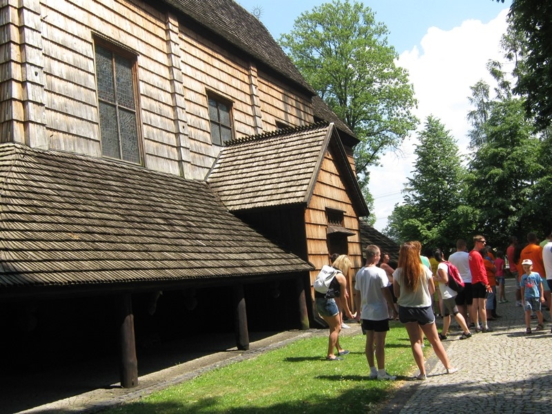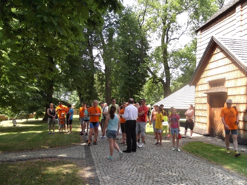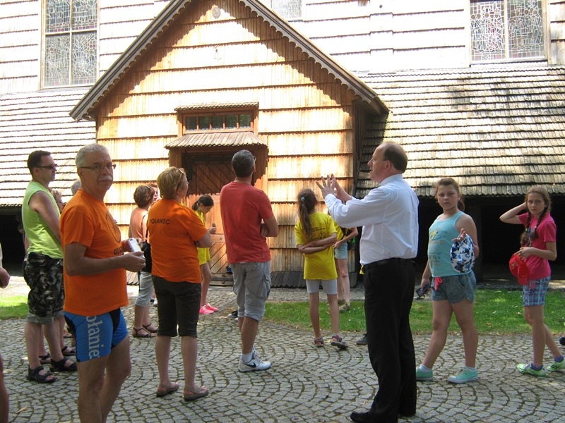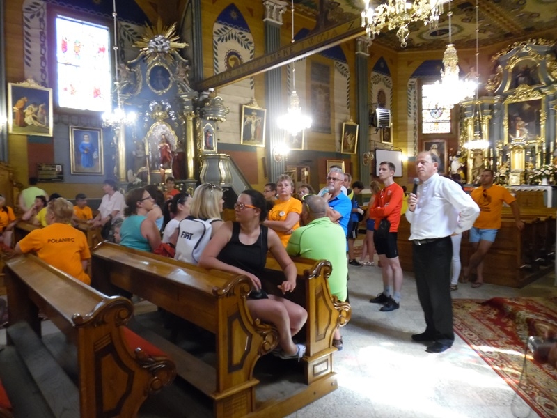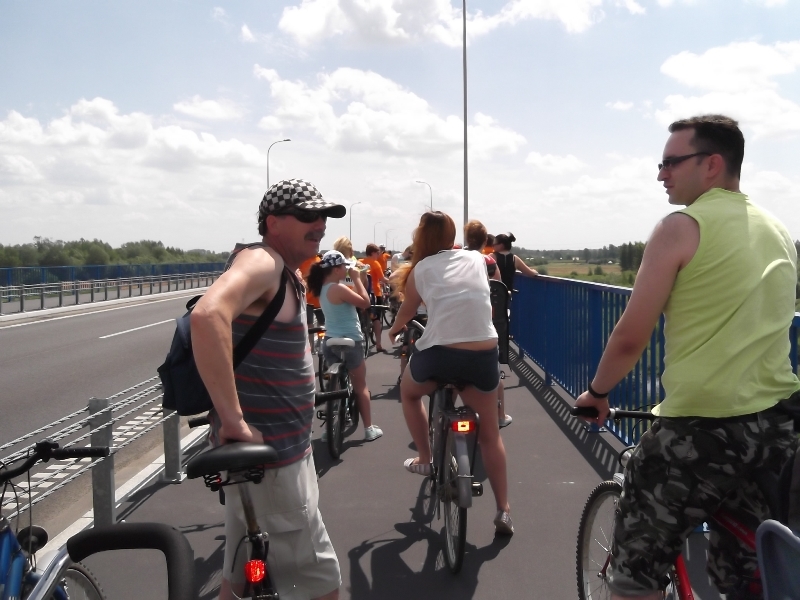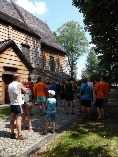 i pozostawiając za sobą Kopiec Kościuszki skierował się w stronę Winnicy. Dalej bocznymi drogami kolarze dotarli do pierwszej przeprawy mostowej – kładki na rzece Czarnej. Należało zsiąść z rowerów i przeprowadzić je na drugą stronę. Po chwili na horyzoncie pojawił się zarys mostu na Wiśle łączącego województwo świętokrzyskie z podkarpackim. Dojazd do niego był bardzo przyjemny, ponieważ mieliśmy wspaniały widok na pola usiane makami. Niemal dwukilometrowy przejazd przez trzy mosty na Wiśle, Brniu i Wisłoce także okazał się przyjemny i bezpieczny dzięki wydzielonej ścieżce rowerowej. Rzut beretem za mostami były już nasze docelowe Gawłuszowice. Miejscowość, jak to bywa w dzień wolny od pracy, powitała nas w sennym nastroju. Po dotarciu do parku otaczającego kościół parafialny pod wezwaniem św. Wojciecha był czas na krótki odpoczynek. Po nim przywitanie przez księdza proboszcza Witolda Szczura, który oprowadził nas po kościele, bardzo ciekawie i niezwykle barwnie opowiadając przy tym o dziejach świątyni i gawłuszowickiej parafii, obchodzącej w tym roku jubileusz 800-lecia istnienia. Kościół, który jest drugim co do wielkości drewnianym obiektem kultu religijnego w Polsce, na wszystkich zrobił ogromne wrażenie. Uczestników rajdu zachwyciło zarówno wnętrze, jak i fasada kościoła, z jego charakterystycznymi „sobotami”, które dawały schronienie wiernym przybywającym z odległych wiosek w przeddzień niedzielnego porannego nabożeństwa. Po pamiątkowym wpisie w księdze gości i wspólnej fotografii wszyscy powoli zaczęli zbierać się do drogi powrotnej. Trasa prowadziła nieco innymi drogami, także bardzo atrakcyjnymi i o małym natężeniu ruchu. Mimo zachowania ostrożności jedna z uczestniczek złapała „gumę” i jej dalszy udział w rajdzie stanął pod dużym znakiem zapytania. Na szczęście udało się szczęśliwie pokonać trudności i pechową cyklistkę dowieźć na metę.