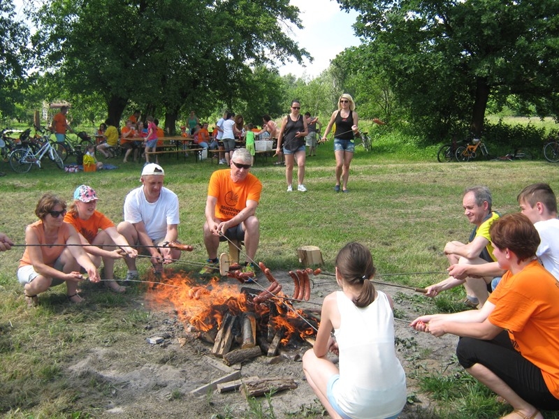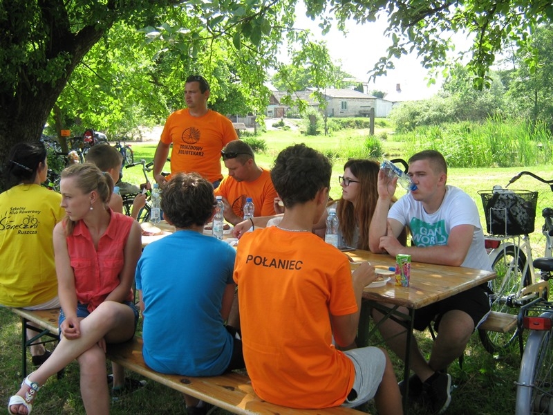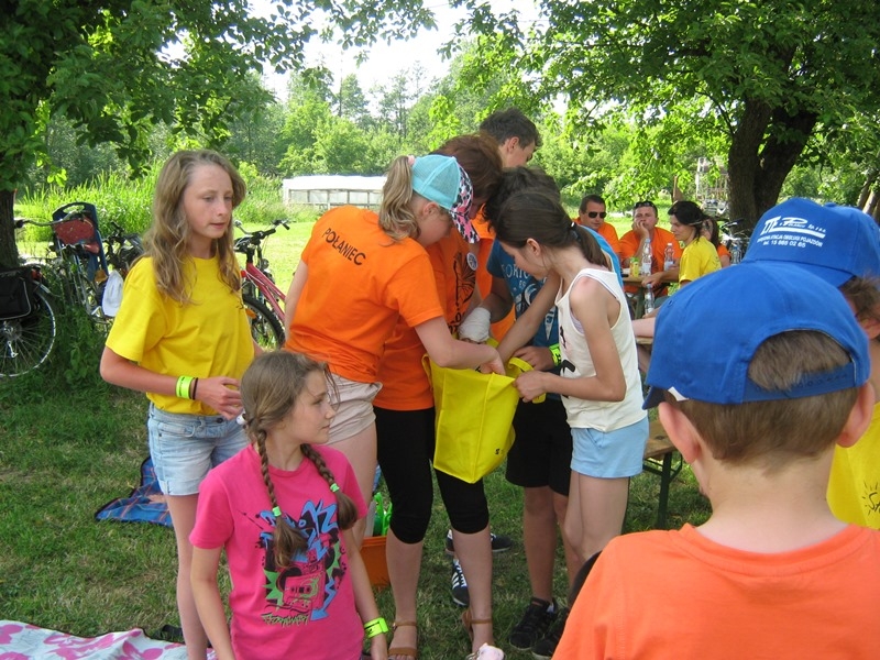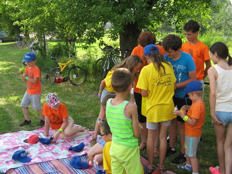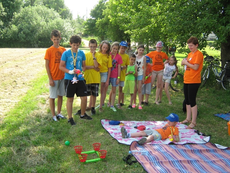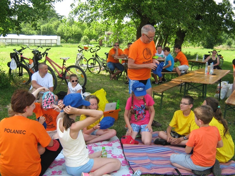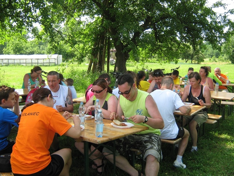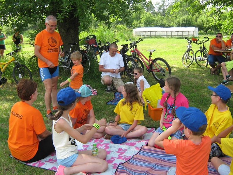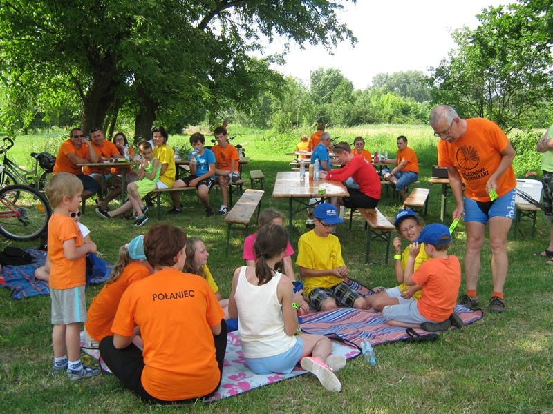 A na mecie rajdu, w Winnicy, na wszystkich czekało drewno do rozpalenia ogniska, kiełbaski i napoje. Dla dzieci przygotowano także soki owocowe. Kolarze mogli odpocząć w cieniu drzew, poleniuchować na kocykach i zjeść upieczoną na ognisku kiełbaskę. Maluchom w pieczeniu kiełbasek pomagali oczywiście dorośli. Był czas na rozmowę i wymienienie się wrażeniami z wyprawy. Najmłodsi chętnie brali udział w zabawach umysłowych i ruchowych przygotowanych przez bibliotekarzy, a w nagrodę otrzymali książki, foldery o Połańcu i gadżety: czapki z daszkiem, odblaski, notatniki, maskotki, breloczki, smycze do telefonów.