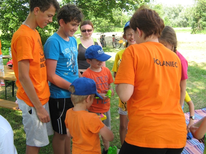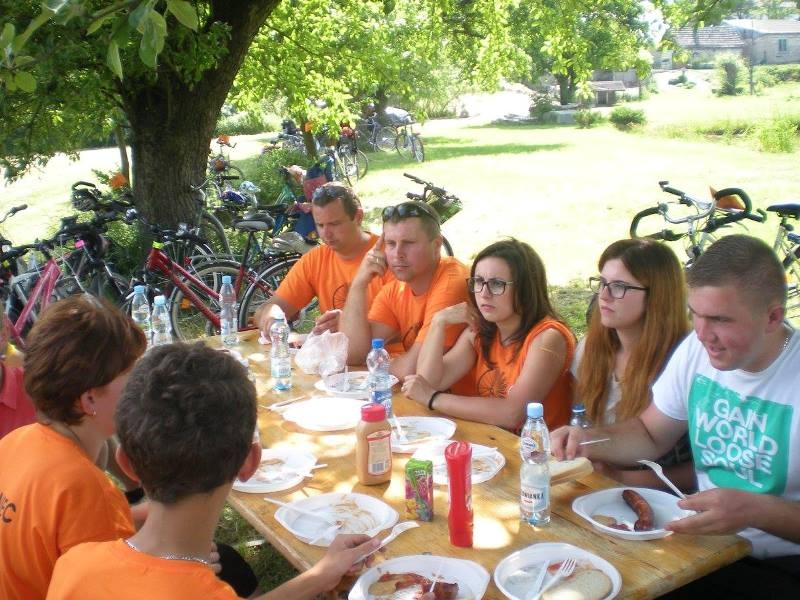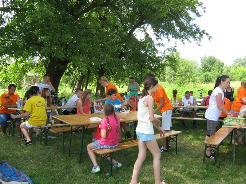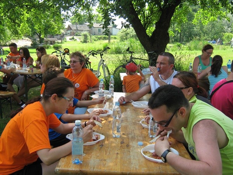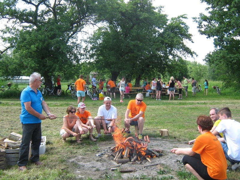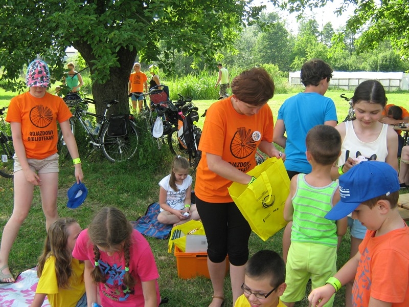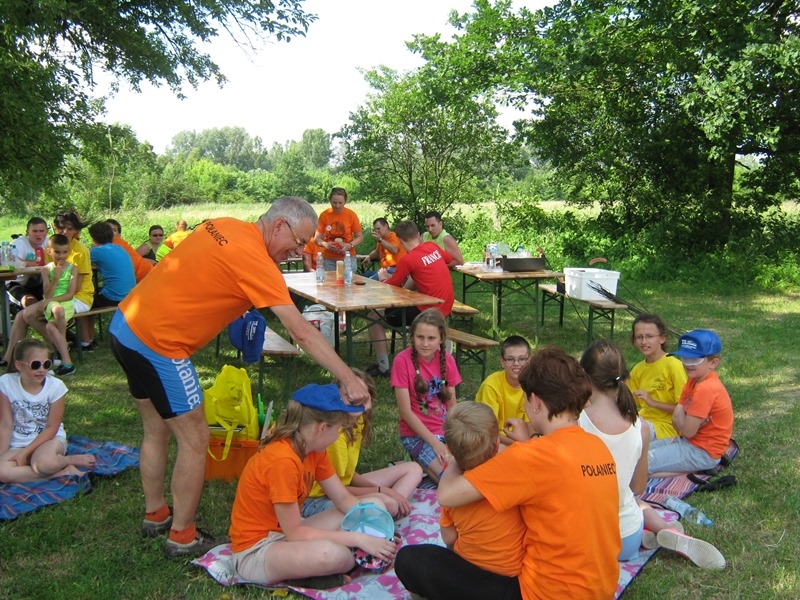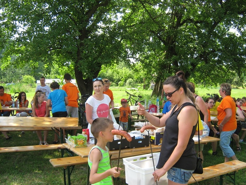A na mecie rajdu, w Winnicy, na wszystkich czekało drewno do rozpalenia ogniska, kiełbaski i napoje. Dla dzieci przygotowano także soki owocowe. Kolarze mogli odpocząć w cieniu drzew, poleniuchować na kocykach i zjeść upieczoną na ognisku kiełbaskę. Maluchom w pieczeniu kiełbasek pomagali oczywiście dorośli. Był czas na rozmowę i wymienienie się wrażeniami z wyprawy. Najmłodsi chętnie brali udział w zabawach umysłowych i ruchowych przygotowanych przez bibliotekarzy, a w nagrodę otrzymali książki, foldery o Połańcu i gadżety: czapki z daszkiem, odblaski, notatniki, maskotki, breloczki, smycze do telefonów.