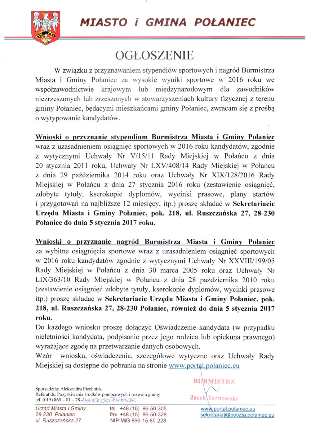 Po odbiór nagród zapraszamy do Urzędu Miasta i Gminy w Połańcu w dniu