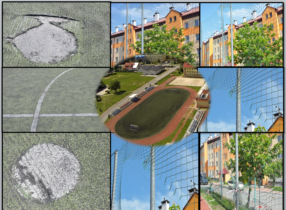 a) Boisko do piłki nożnej o wymiarach 60x30 m oraz dwa zakola za bramkami, wokół boiska bieżnia o szerokości 6m z odcinkiem prostej o długości 100 m. Istniejący teren, na którym znajduje się boisko jest płaski. Zakres prac obejmował wymianę nawierzchni z trawy syntetycznej na nowa na boisku do piłki nożnej oraz odtworzenie wszystkich linii istniejącego boiska.