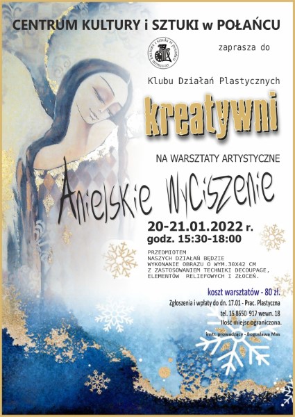 Zapraszamy 20 - 21 stycznia do Klubu Działań Plastycznych "Kreatywni" w CKiSz na warsztaty artystyczne "Anielskie wyciszenie". Zapewnimy świetną, twórczą atmosferę i fachową pomoc przy powstawaniu "anielskiego obrazu". Koszt warsztatów: 80,00 zł