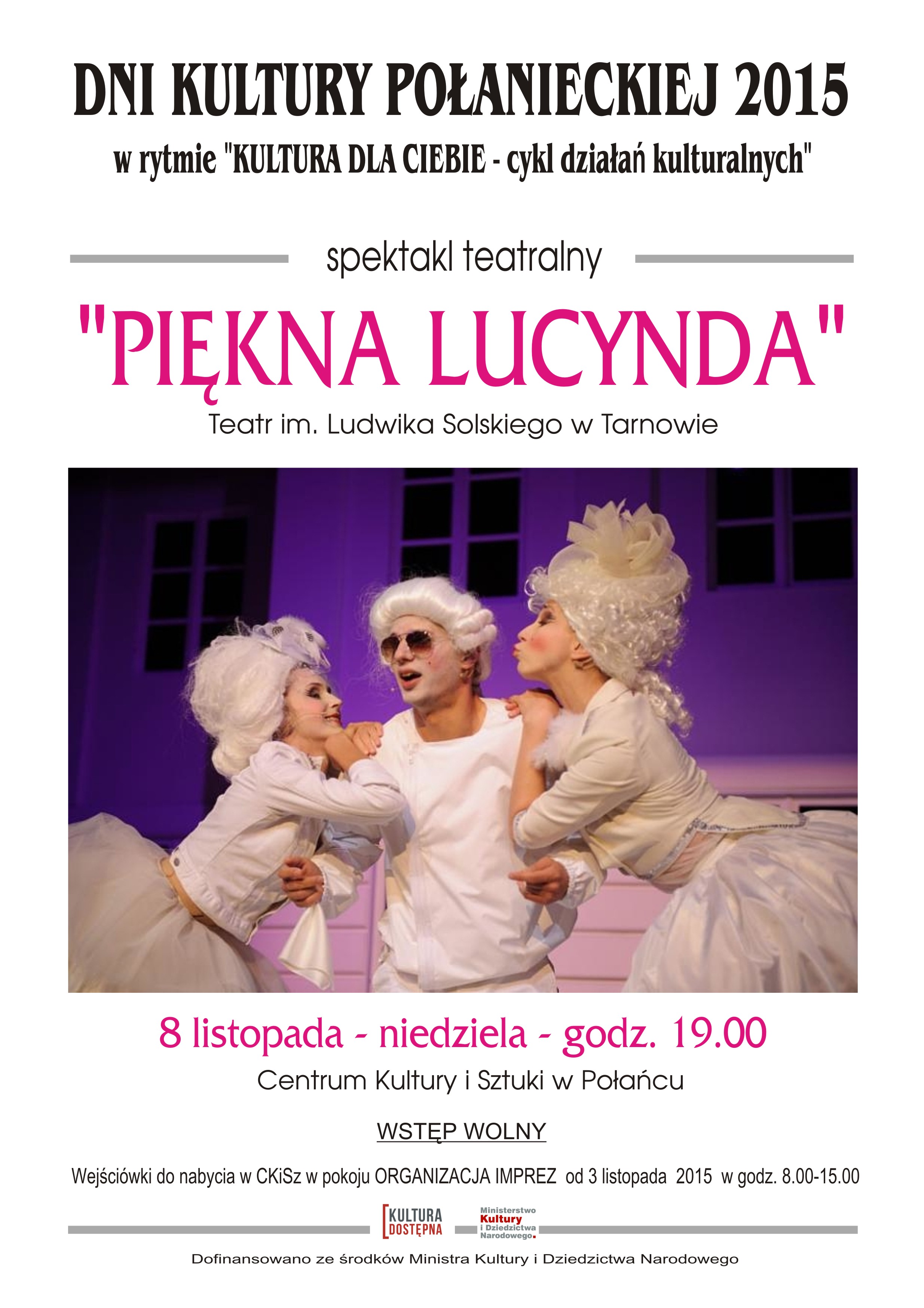 Dni Kultury Połanieckiej w rytmie "KULTURA DLA CIEBIE - cykl działań kulturalnych" tym razem w teatralnej odsłonie. Już 8 listopada o godz. 19.00 zapraszamy do Centrum Kultury i Sztuki w Połańcu nakomedię muzyczną "Piękna Lucynda" w wykonaniu aktorów Teatru im. Ludwika Solskiego w Tarnowie. "Piękna Lucynda" to tryskający komizmem i dowcipem pastisz błahej komedyjki obyczajowej "Natręci" Józefa Bielawskiego. To zaproszenie do XVIII-wiecznej Warszawy i świata arystokratycznych intryg. W podróży widzowi towarzyszyć będą błyskotliwe piosenki i pełna humoru fabuła. Zasmakuj w teatralnej arystokracji i weź udział w projekcie dofinansowanym ze środków Ministra Kultury i Dziedzictwa Narodowego. Wstęp wolny za okazaniem wejściówki .... Po odbiór wejściówek zapraszamy od 3 listopada do Centrum Kultury i Sztuki w Połańcu w godz. 8.00 - 16.00 (pokój Organizacja Imprez).
