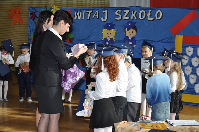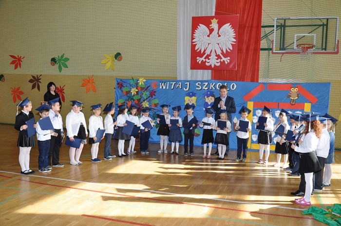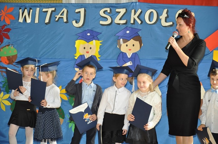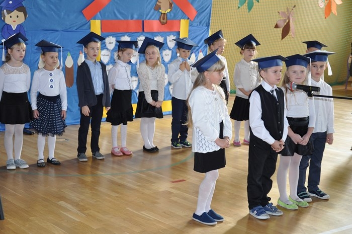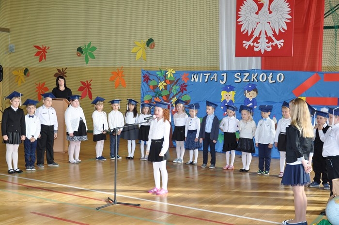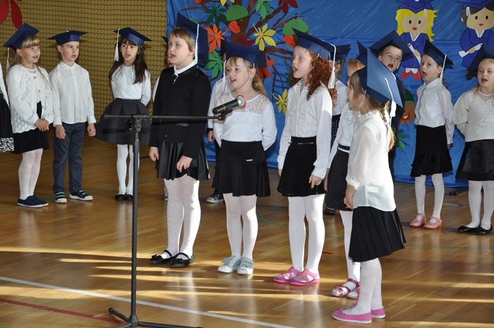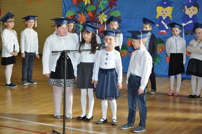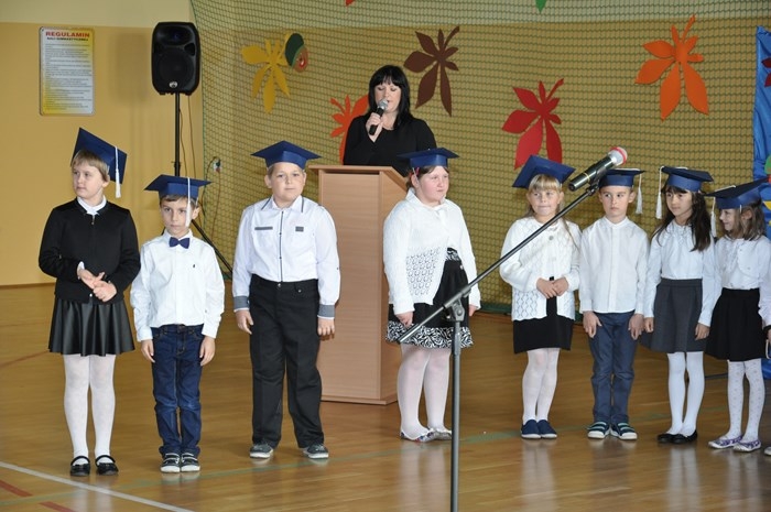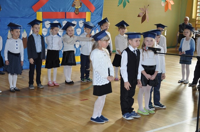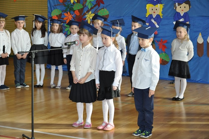 Uczniowie wykazali się dobrą pamięcią, wiedzą, umiejętnościami śpiewu i deklamacji. Występ dzieci spotkał się bardzo ciepłym przyjęciem i został nagrodzony gromkimi brawami. Następnie pierwszoklasiści złożyli uroczyste ślubowanie i zostali pasowani na uczniów symbolicznym wielkim ołówkiem. Na pamiątkę tego ważnego wydarzenia już jako prawdziwi uczniowie szkoły otrzymali pamiątkowe dyplomy i inne upominki. Uroczystość dostarczyła dzieciom, ich rodzicom i zaproszonym gościom wiele miłych przeżyć i wzruszeń. Po części oficjalnej dzieci i goście zostali zaproszeni na słodki poczęstunek przygotowany przez rodziców.