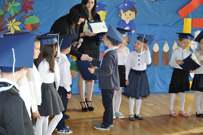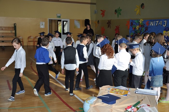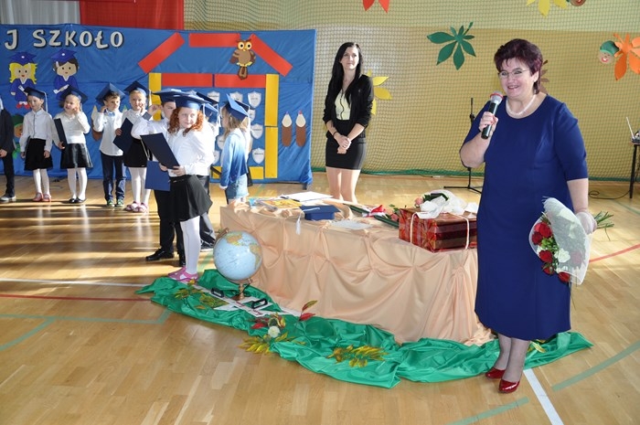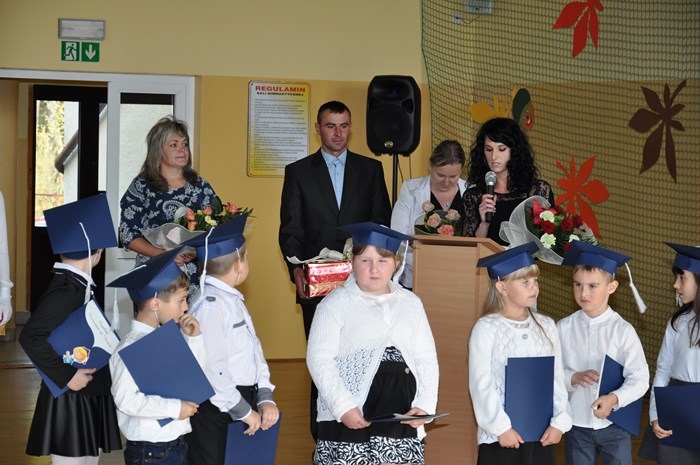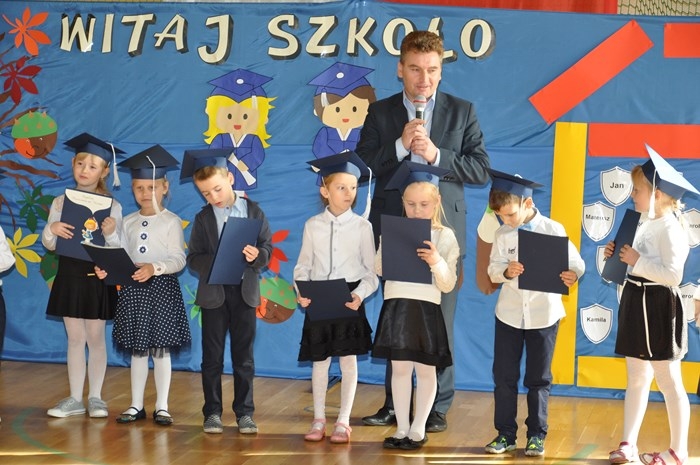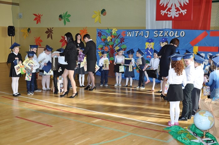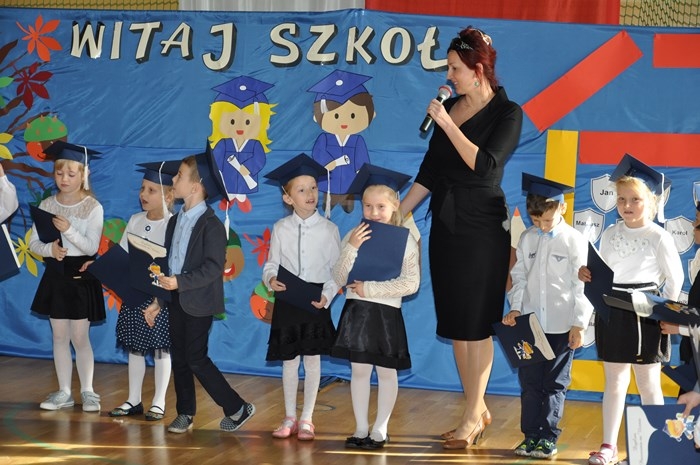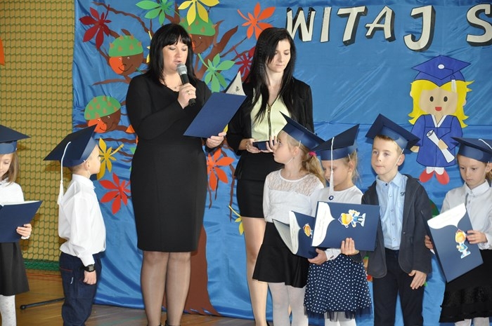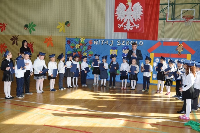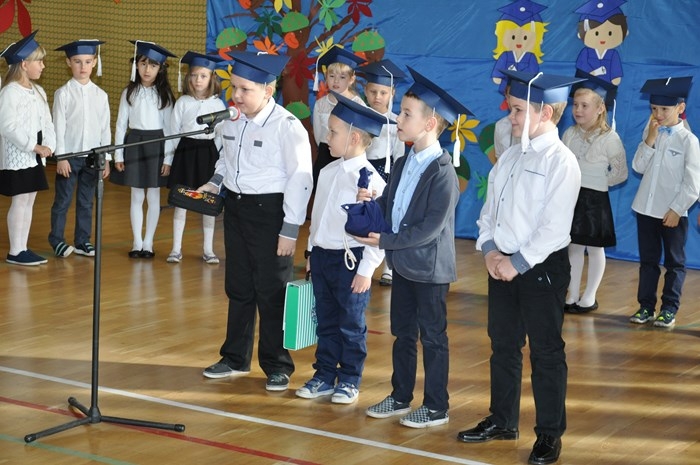 Uczniowie wykazali się dobrą pamięcią, wiedzą, umiejętnościami śpiewu i deklamacji. Występ dzieci spotkał się bardzo ciepłym przyjęciem i został nagrodzony gromkimi brawami. Następnie pierwszoklasiści złożyli uroczyste ślubowanie i zostali pasowani na uczniów symbolicznym wielkim ołówkiem. Na pamiątkę tego ważnego wydarzenia już jako prawdziwi uczniowie szkoły otrzymali pamiątkowe dyplomy i inne upominki. Uroczystość dostarczyła dzieciom, ich rodzicom i zaproszonym gościom wiele miłych przeżyć i wzruszeń. Po części oficjalnej dzieci i goście zostali zaproszeni na słodki poczęstunek przygotowany przez rodziców.