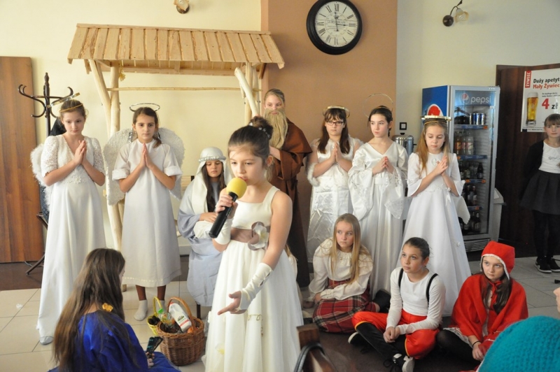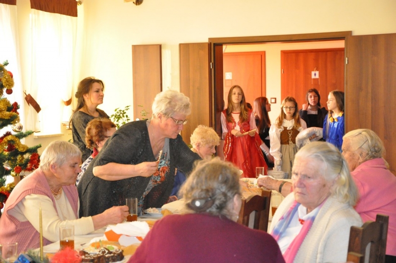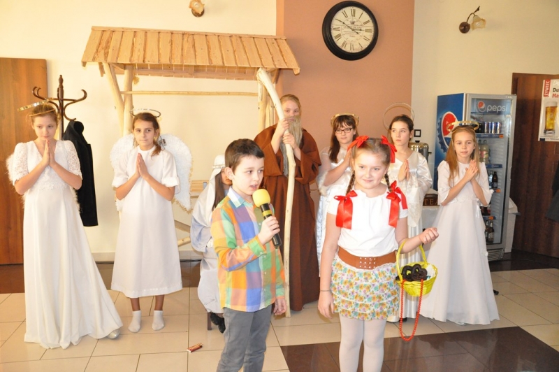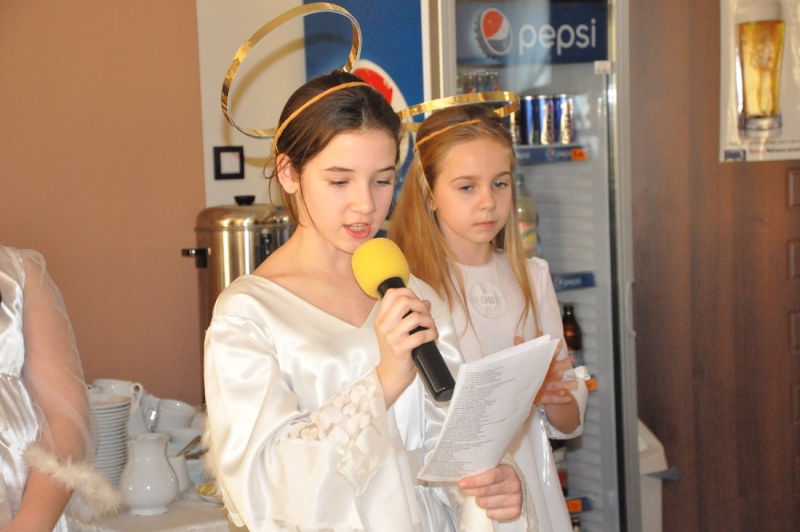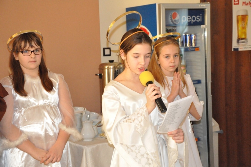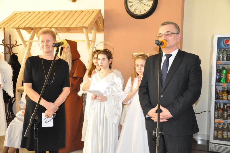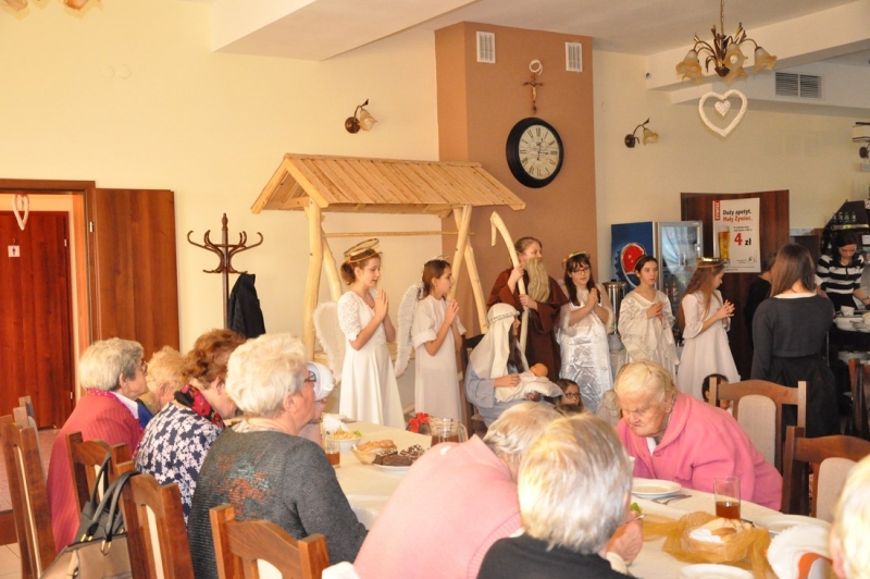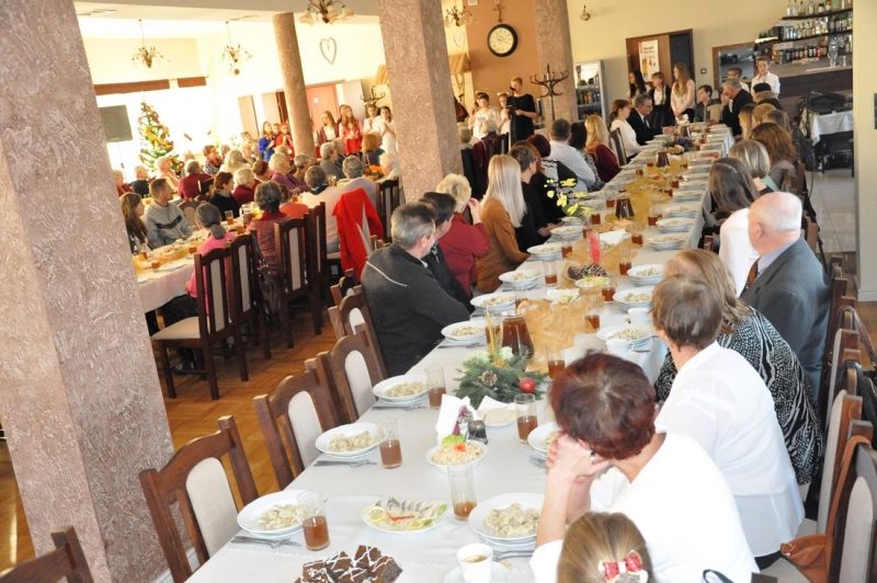 Wszystkich przybyłych na przedświąteczne spotkanie powitała Pani Anna Wolska – kierownik Ośrodka Pomocy Społecznej, która złożyła życzenia świąteczne. Następnie życzenia złożył Przewodniczący Rady Miejskiej – Stanisław Lolo, Radna – Joanna Witek i Burmistrz- Jacek Tarnowski, życząc Radosnych Świąt Bożego Narodzenia i Szczęśliwego Nowego 2016 roku. Ksiądz – Józef Grabda odczytał fragment Ewangelii i poświęcił opłatek. Następnie wszyscy uczestnicy Wigilii połamali się opłatkiem składając sobie wzajemnie życzenia.Część artystyczną uświetniły baśniowe „Jasełka” i kolędy w wykonaniu uczniów Publicznej Szkoły Podstawowej w Połańcu przygotowanych pod okiem pani Agaty Nowakowskiej i Marzeny Drożdżowskiej. Dla każdej osoby biorącej udział w świątecznym spotkaniu dzieci przygotowały ręcznie robione kartki z życzeniami. Spotkanie przebiegło w życzliwej i świątecznej atmosferze.