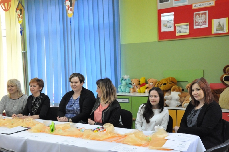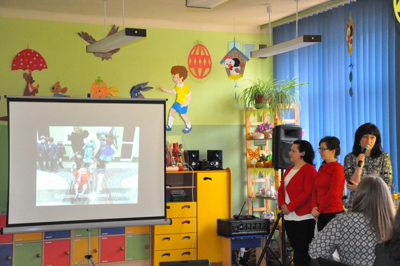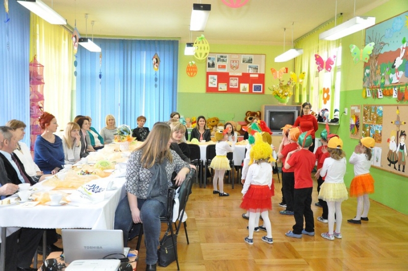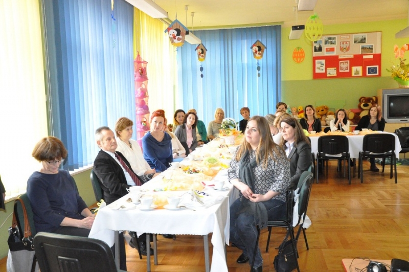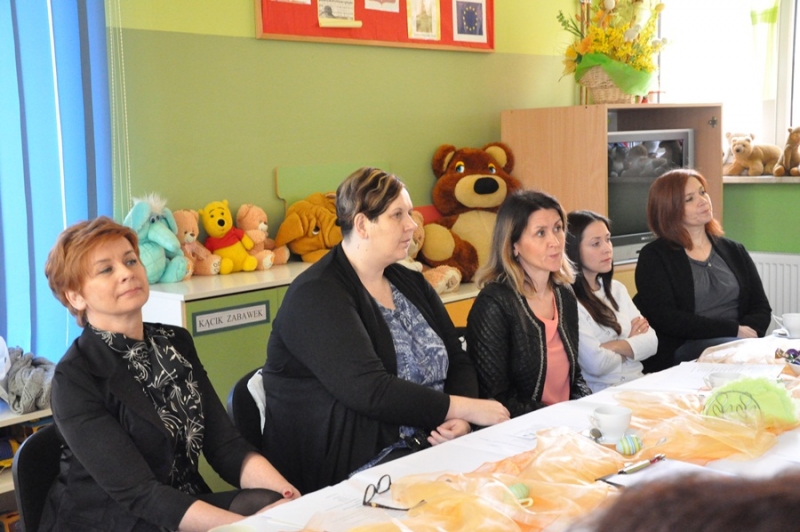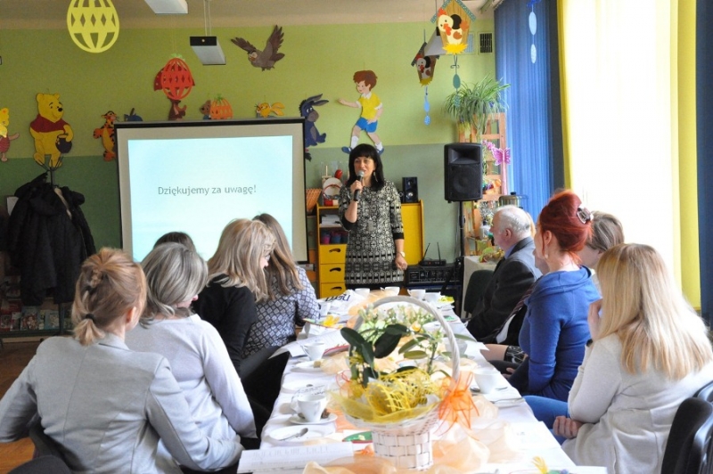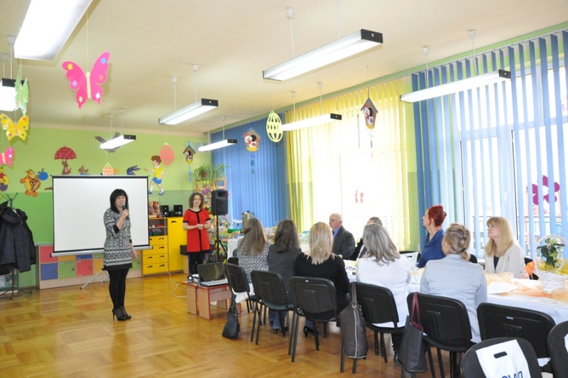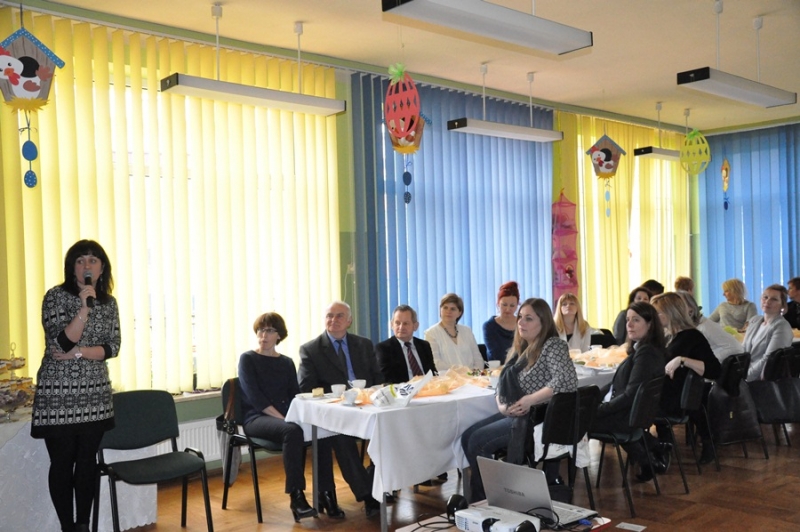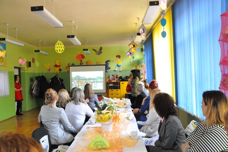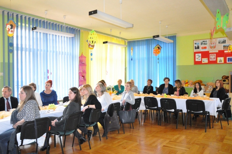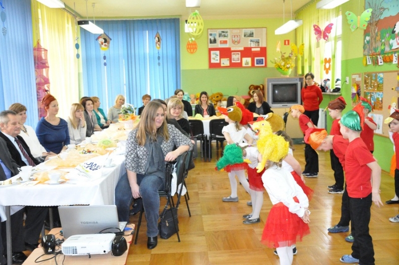 Na początku spotkania głos zabrała Pani Anna Kaniszewska – Dyrektor Przedzkola Publicznego w Połańcu, która gorąco powitała zaproszonych gości i zaprosiła do obejrzenia prezentacji filmowej związanej z działalnością przedszkola. Myślą przewodnią prezentacji było motto przedszkola: „Dajmy dzieciom słońce, żeby łez nie było, dajmy dzieciom radość, dajmy dzieciom miłość”. Film został przygotowany przez Panią Ewelinę Wojnarowską. Spotkanie uświetniły występy przedszkolaków. Dzieci z grupy „Słoneczka” zatańczyły rytmiczną „Poleczkę”, a w atmosferę zbliżających się Świat Wielkanocnych wprowadziły gości dzieci z grupy „Smerfy” prezentując inscenizację „Wieziemy kogucika” oraz taniec „ Kurnik”. Przedszkolaki przekazały również życzenia z okazji zbliżających się świąt i wręczyły wszystkim zgromadzonym symboliczne upominki. Występy wszystkich dzieci zostały nagrodzone brawami oraz słodkim poczęstunkiem. Kolejnym punktem spotkania była prezentacja multimedialna dotycząca „Odimiennej metody nauki czytania” autorstwa dr Ireny Majchrzak, którą od kilku lat realizujemy w naszym przedszkolu. Prezentację przygotowały: Wicedyrektor Przedszkola Publicznego w Połańcu - Pani Beata Mika oraz Pani Monika Szywała. Celem prezentacji było zapoznanie uczestników spotkania z założeniami metody, z jej poszczególnymi etapami, narzędziami oraz sposobami realizacji. Odimienna metoda nauki czytania należy do innowacyjnych projektów edukacyjnych, zatwierdzonych przez MENiS. Pozwala na kształcenie umiejętności czytania już z dziećmi trzyletnimi. Nauczyciel prowadząc zabawy i gry prowokuje dziecko do samodzielnego rozumowania alfabetycznego szyfru. Początkiem jest imię dziecka, które staje się słowem otwierającym świat pisma.