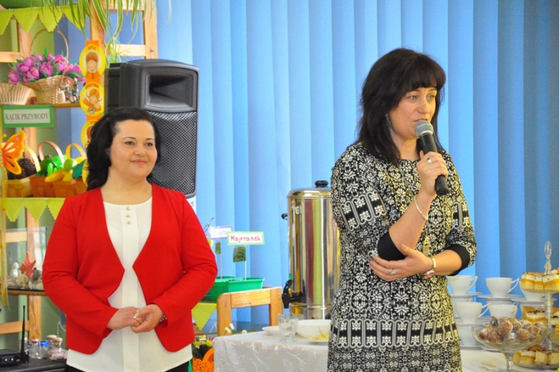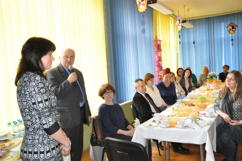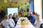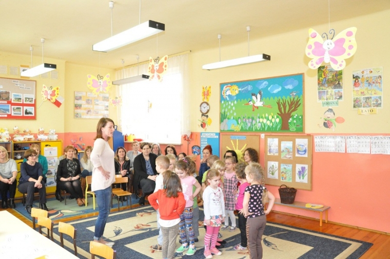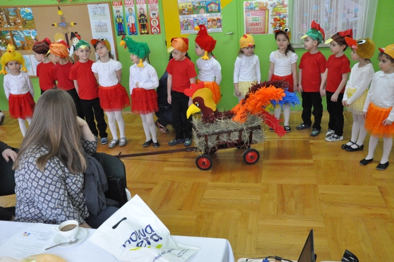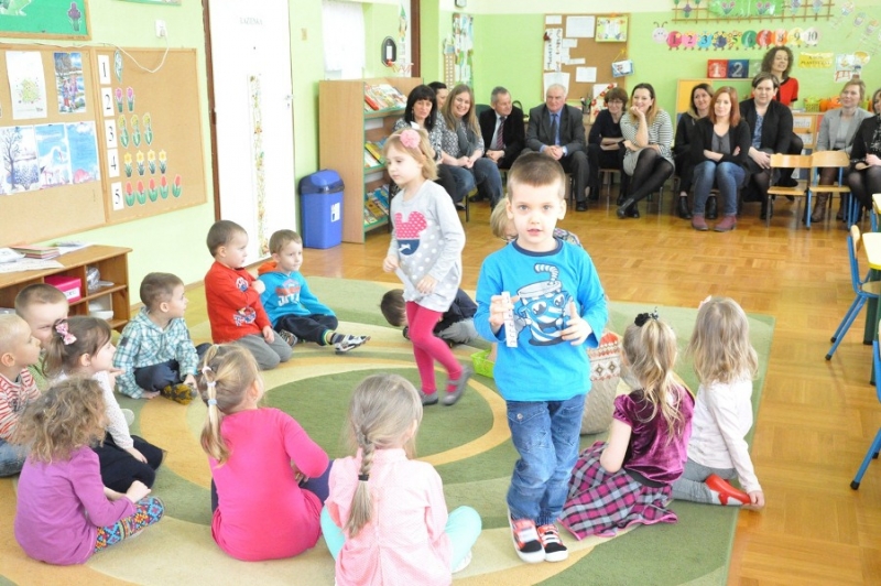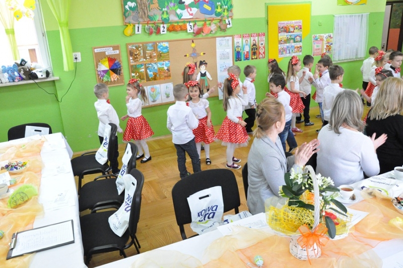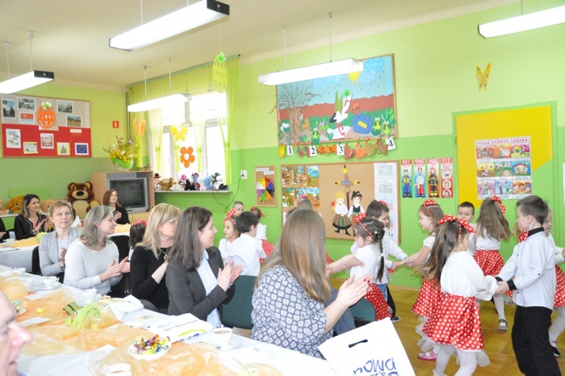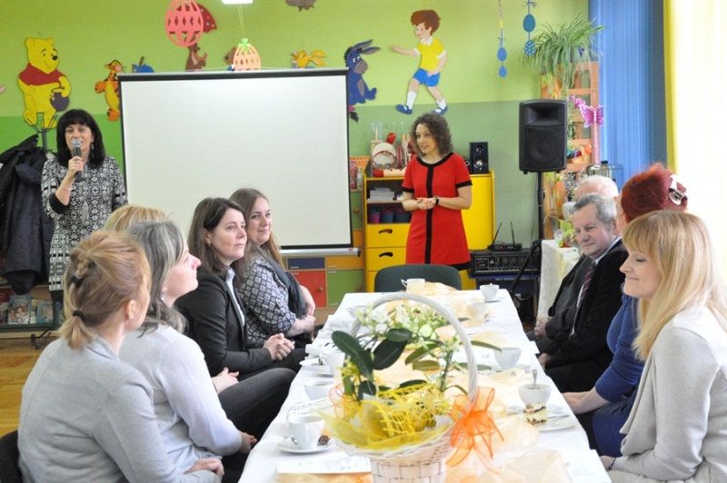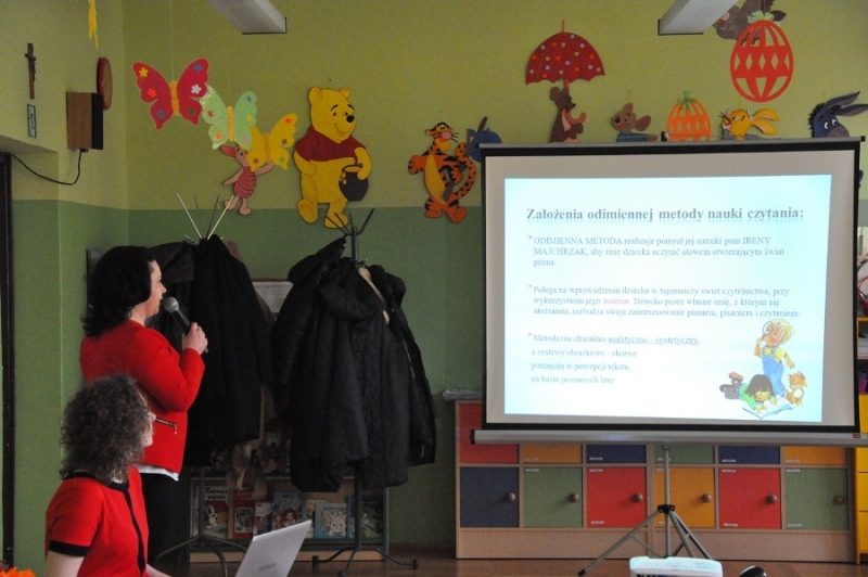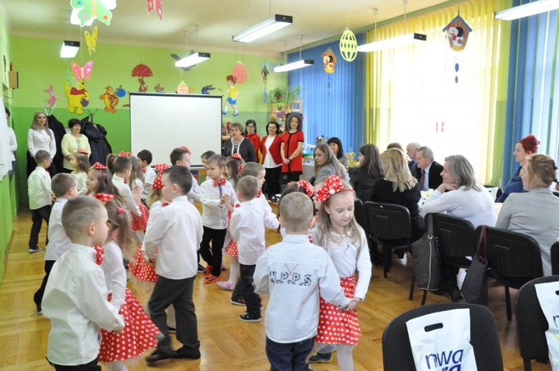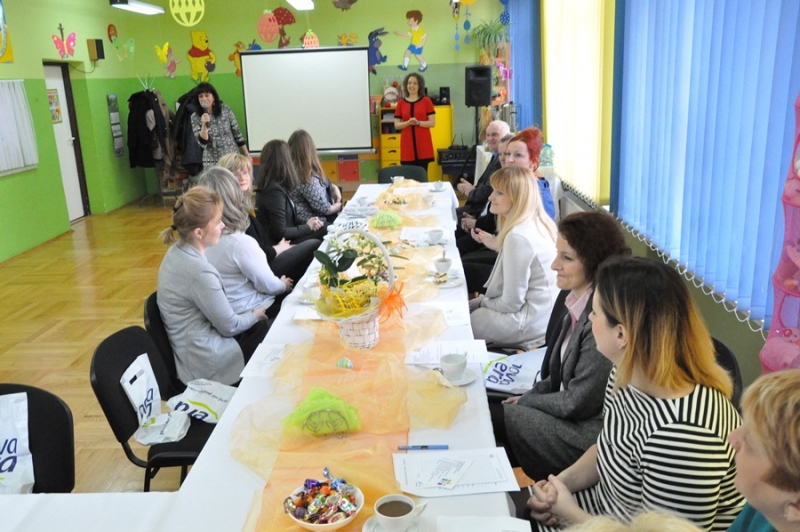 Na początku spotkania głos zabrała Pani Anna Kaniszewska – Dyrektor Przedzkola Publicznego w Połańcu, która gorąco powitała zaproszonych gości i zaprosiła do obejrzenia prezentacji filmowej związanej z działalnością przedszkola. Myślą przewodnią prezentacji było motto przedszkola: „Dajmy dzieciom słońce, żeby łez nie było, dajmy dzieciom radość, dajmy dzieciom miłość”. Film został przygotowany przez Panią Ewelinę Wojnarowską. Spotkanie uświetniły występy przedszkolaków. Dzieci z grupy „Słoneczka” zatańczyły rytmiczną „Poleczkę”, a w atmosferę zbliżających się Świat Wielkanocnych wprowadziły gości dzieci z grupy „Smerfy” prezentując inscenizację „Wieziemy kogucika” oraz taniec „ Kurnik”. Przedszkolaki przekazały również życzenia z okazji zbliżających się świąt i wręczyły wszystkim zgromadzonym symboliczne upominki. Występy wszystkich dzieci zostały nagrodzone brawami oraz słodkim poczęstunkiem. Kolejnym punktem spotkania była prezentacja multimedialna dotycząca „Odimiennej metody nauki czytania” autorstwa dr Ireny Majchrzak, którą od kilku lat realizujemy w naszym przedszkolu. Prezentację przygotowały: Wicedyrektor Przedszkola Publicznego w Połańcu - Pani Beata Mika oraz Pani Monika Szywała. Celem prezentacji było zapoznanie uczestników spotkania z założeniami metody, z jej poszczególnymi etapami, narzędziami oraz sposobami realizacji. Odimienna metoda nauki czytania należy do innowacyjnych projektów edukacyjnych, zatwierdzonych przez MENiS. Pozwala na kształcenie umiejętności czytania już z dziećmi trzyletnimi. Nauczyciel prowadząc zabawy i gry prowokuje dziecko do samodzielnego rozumowania alfabetycznego szyfru. Początkiem jest imię dziecka, które staje się słowem otwierającym świat pisma.