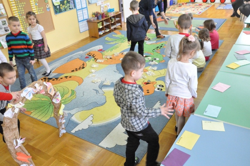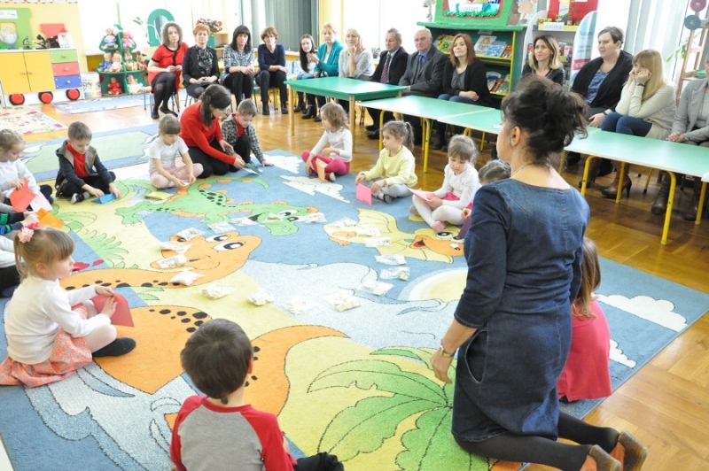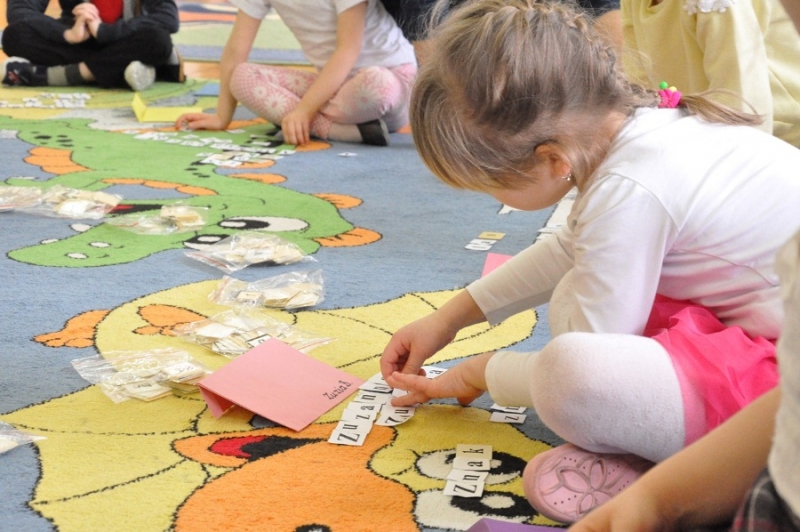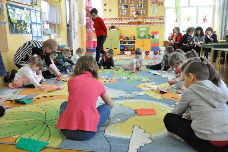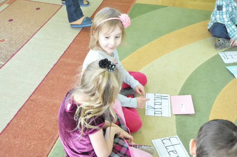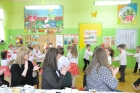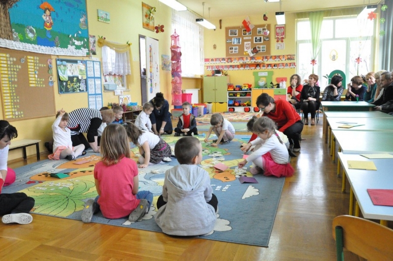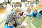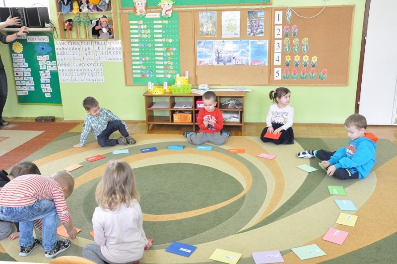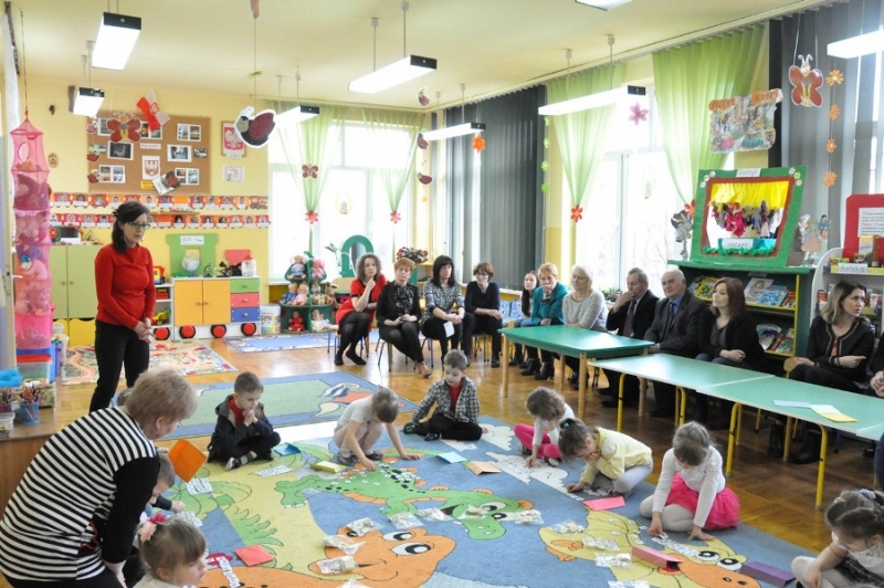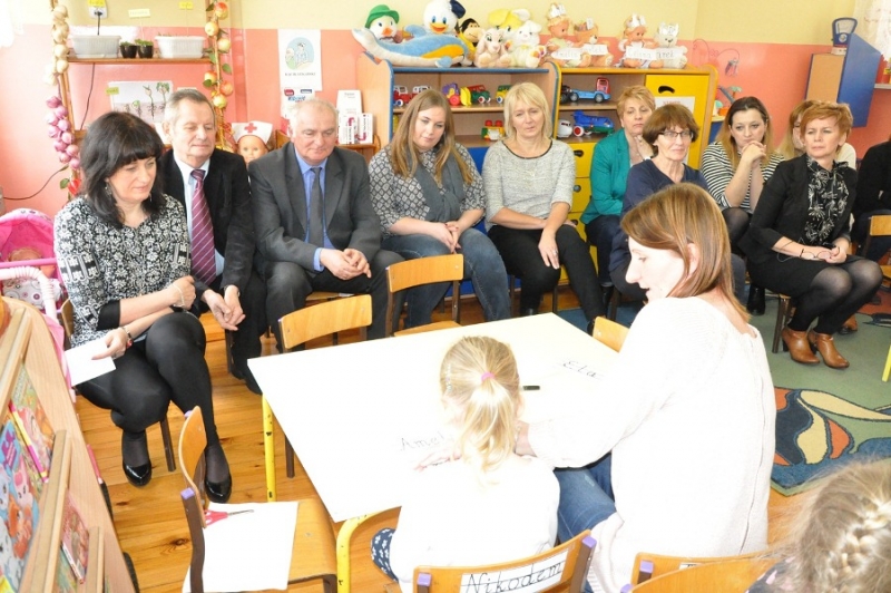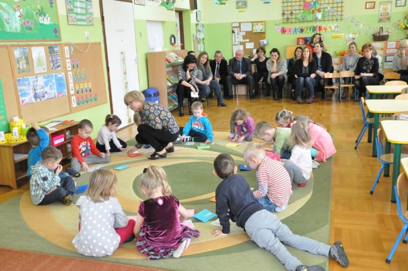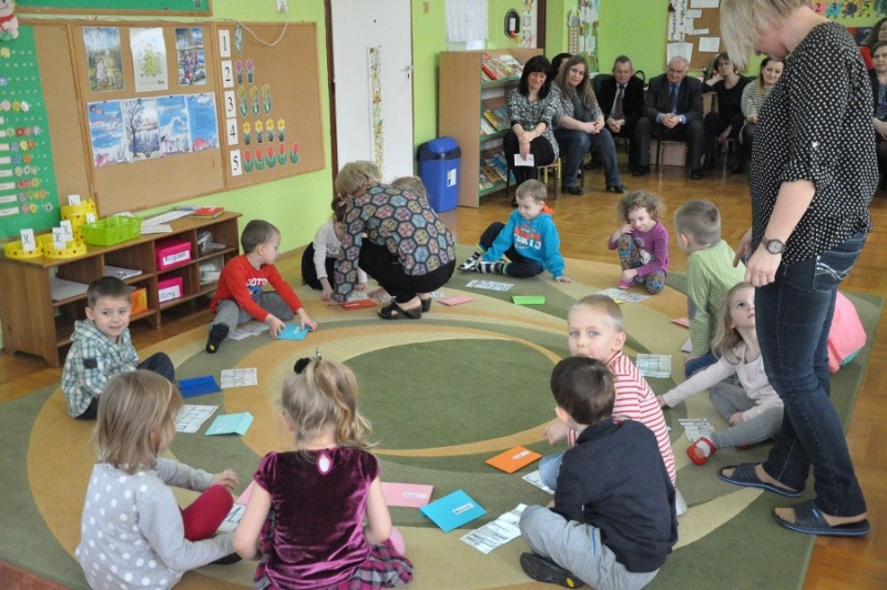 Następnie uczestnicy spotkania mogli zobaczyć efekty zaprezentowanej metody uczestnicząc w zajęciach z dziećmi w różnych grupach wiekowych. Zajęcia w grupie dzieci 4-letnich „Kotki” prowadzone przez Panią Elżbietę Prajs były prezentacją początkowych etapów nauki czytania: „Inicjacji” (prezentacja dziecku zapisu jego imienia), prezentacji „Ściany pełnej liter” oraz zabaw z wizytówkami dzieci. Zajęcia prowadzone pod kierunkiem Pani Joanny Sałagaj w grupie dzieci 4-letnich „Leśne Ludki” ukazały kolejne etapy nauki czytania. Było to wprowadzenie litery „K” oraz ćwiczenia i zabawy z wykorzystaniem nowo poznanej litery i wizytówek dzieci. Dzieci 5 –letnie z grupy „Smerfy” były już gotowe do kolejnego ważnego etapu jakim jest „Targ liter”. Pod kierunkiem swoich nauczycieli - Pani Grażyny Poniewierskiej oraz Pani Eweliny Wojnarowskiej zaprezentowały zabawę, której celem było tworzenie nowych słów na podstawie swojego imienia oraz wykupowanie brakujących liter od nauczyciela.