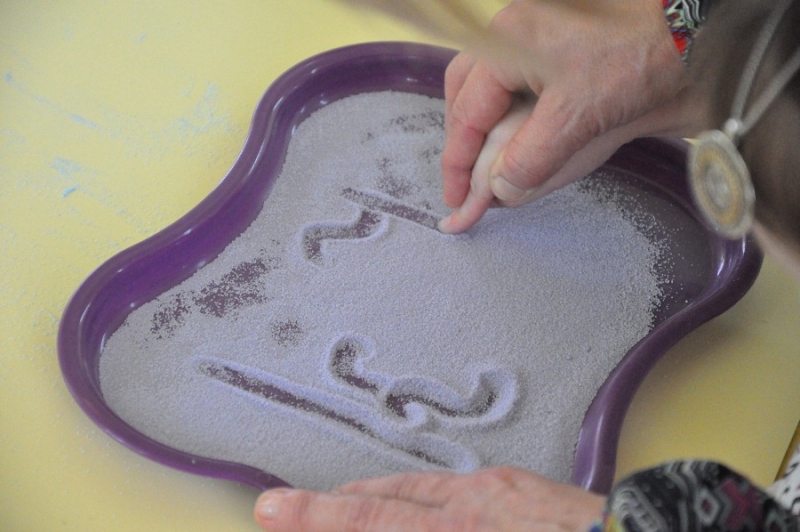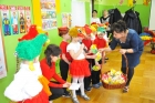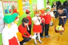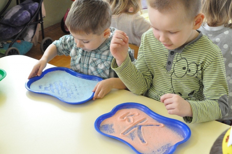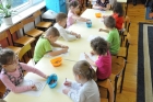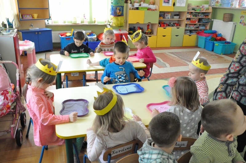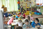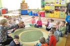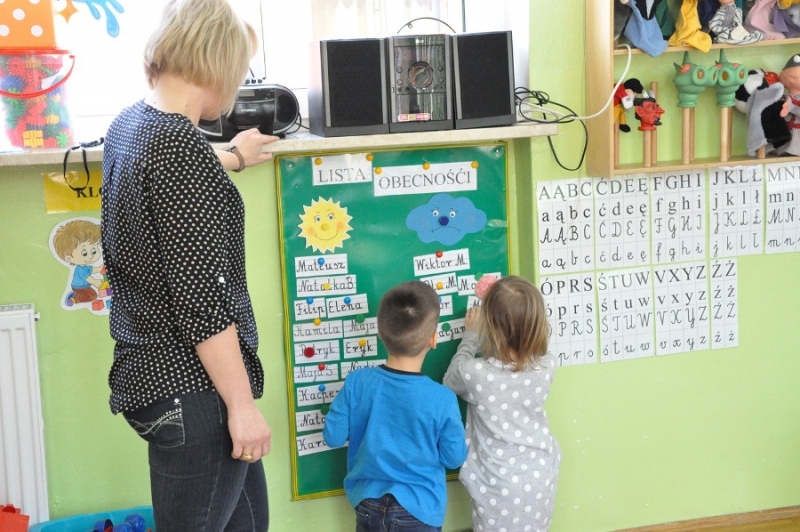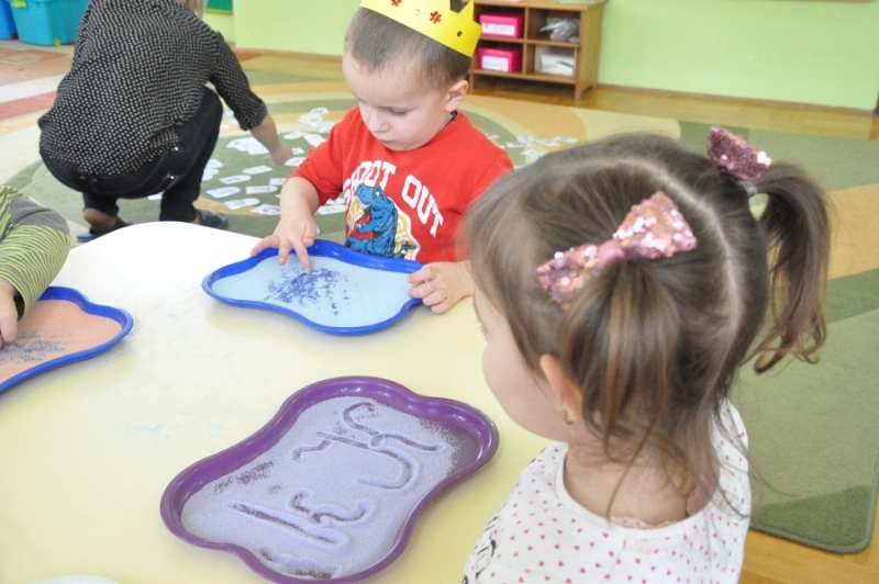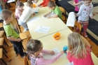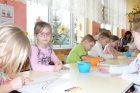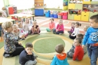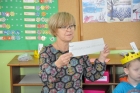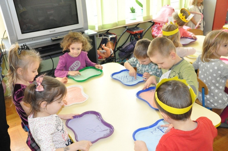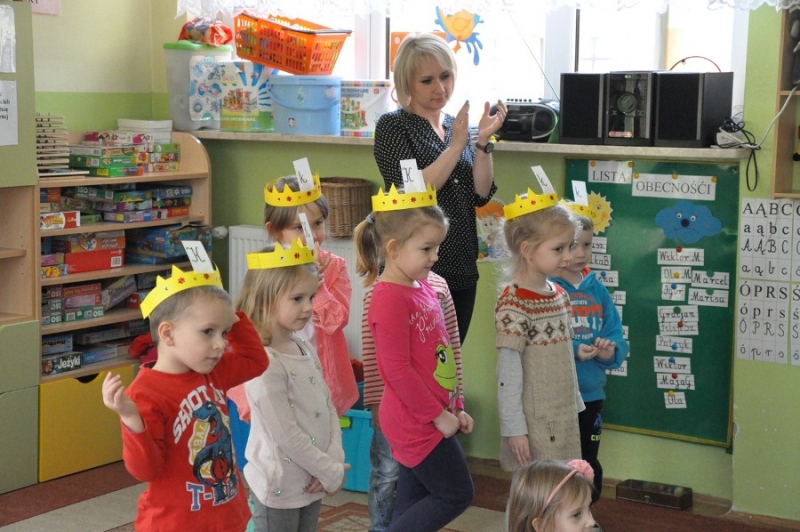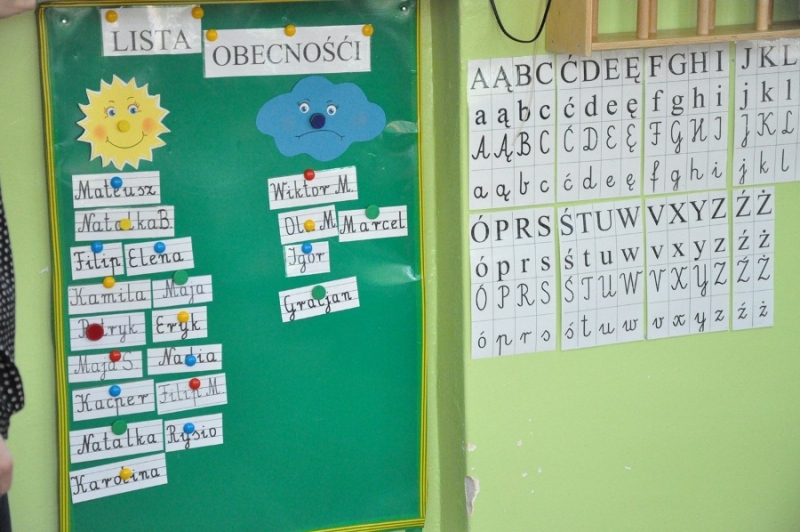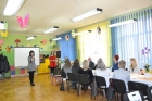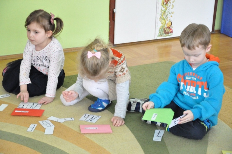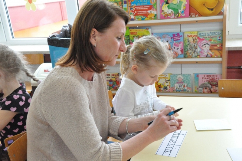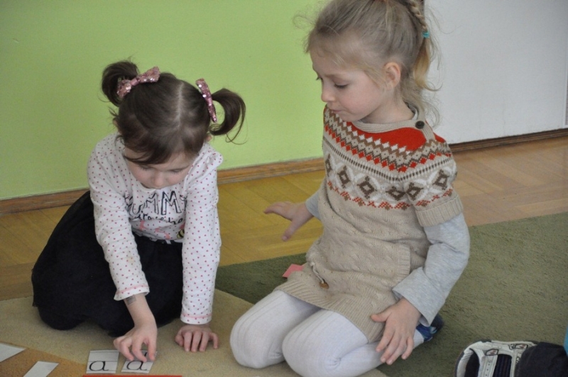 Następnie uczestnicy spotkania mogli zobaczyć efekty zaprezentowanej metody uczestnicząc w zajęciach z dziećmi w różnych grupach wiekowych. Zajęcia w grupie dzieci 4-letnich „Kotki” prowadzone przez Panią Elżbietę Prajs były prezentacją początkowych etapów nauki czytania: „Inicjacji” (prezentacja dziecku zapisu jego imienia), prezentacji „Ściany pełnej liter” oraz zabaw z wizytówkami dzieci. Zajęcia prowadzone pod kierunkiem Pani Joanny Sałagaj w grupie dzieci 4-letnich „Leśne Ludki” ukazały kolejne etapy nauki czytania. Było to wprowadzenie litery „K” oraz ćwiczenia i zabawy z wykorzystaniem nowo poznanej litery i wizytówek dzieci. Dzieci 5 –letnie z grupy „Smerfy” były już gotowe do kolejnego ważnego etapu jakim jest „Targ liter”. Pod kierunkiem swoich nauczycieli - Pani Grażyny Poniewierskiej oraz Pani Eweliny Wojnarowskiej zaprezentowały zabawę, której celem było tworzenie nowych słów na podstawie swojego imienia oraz wykupowanie brakujących liter od nauczyciela.