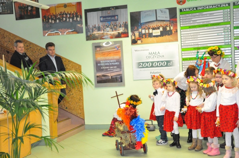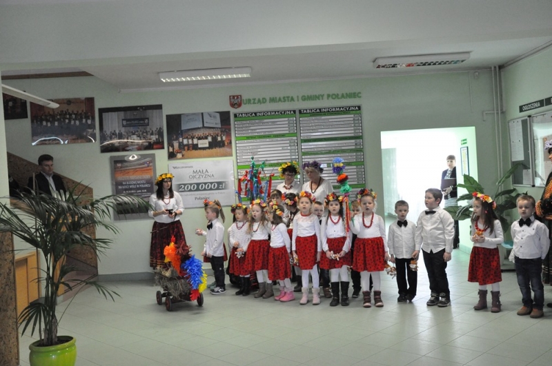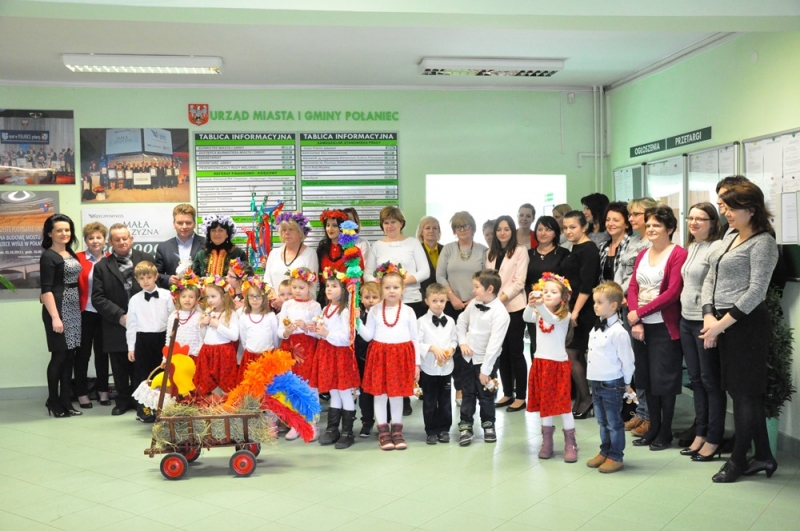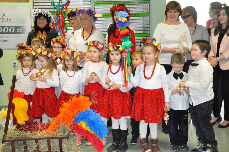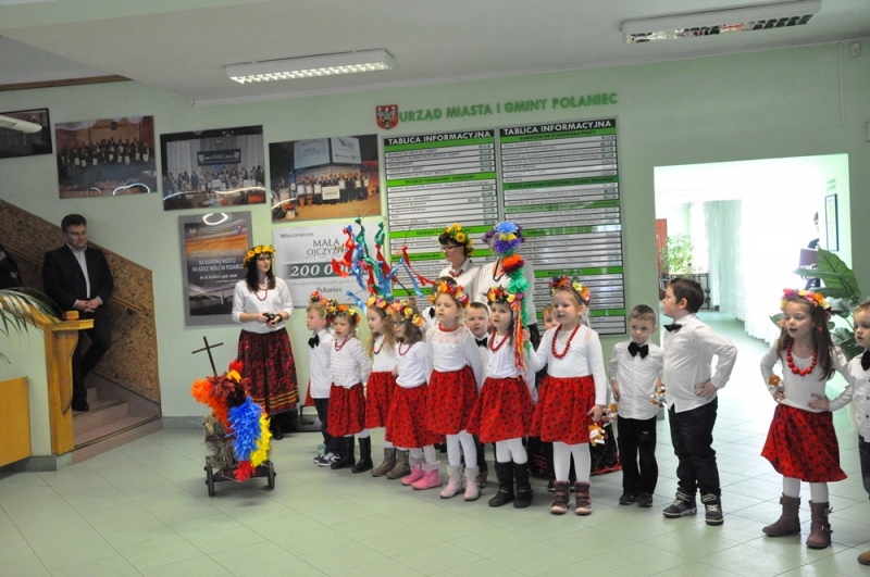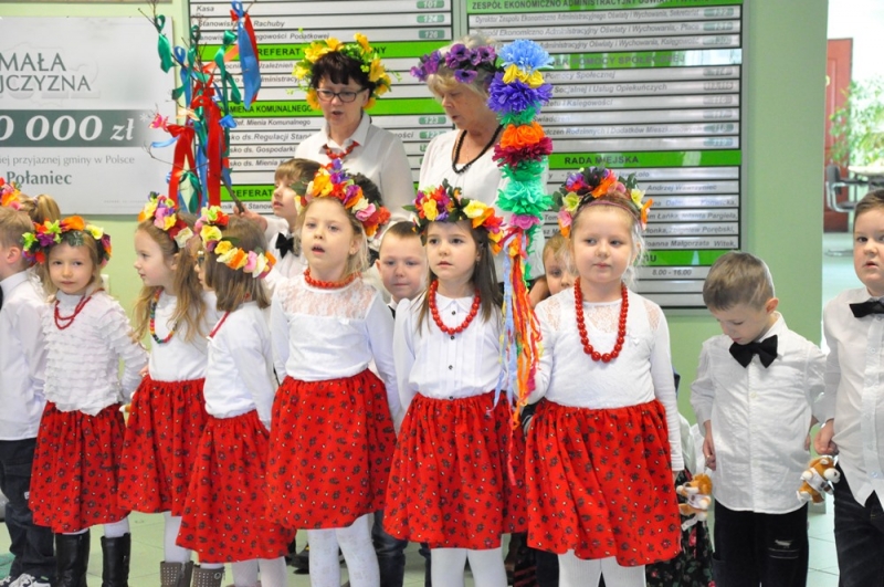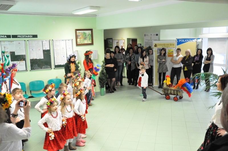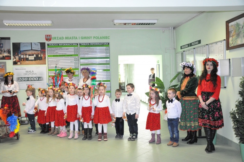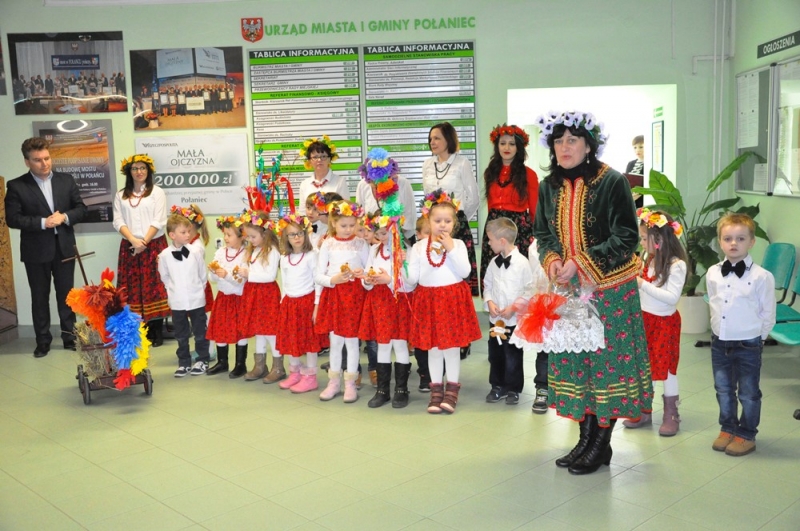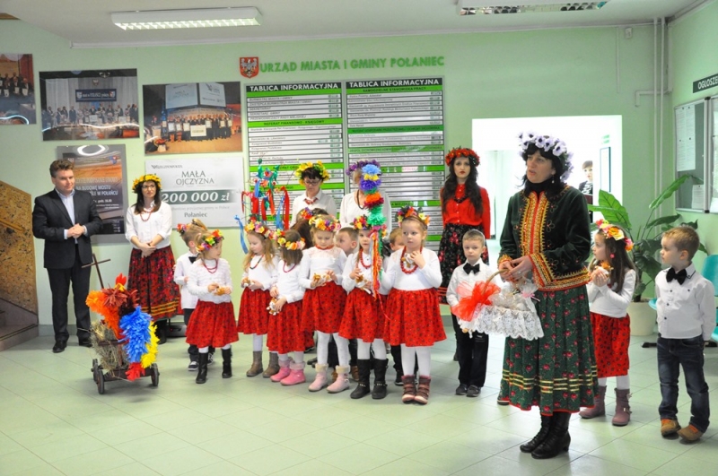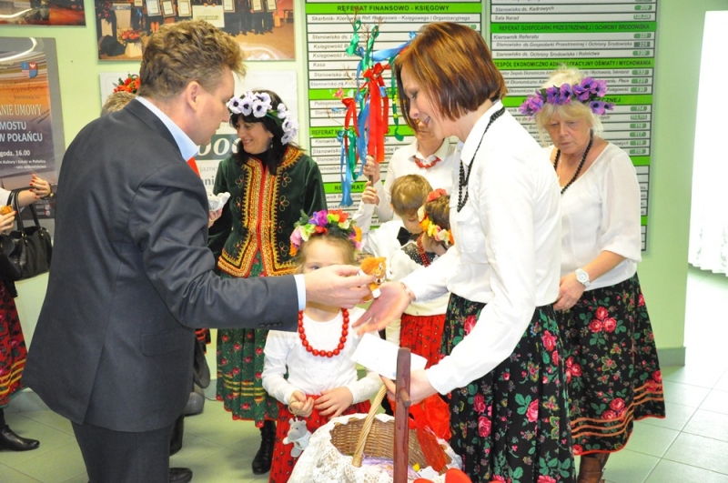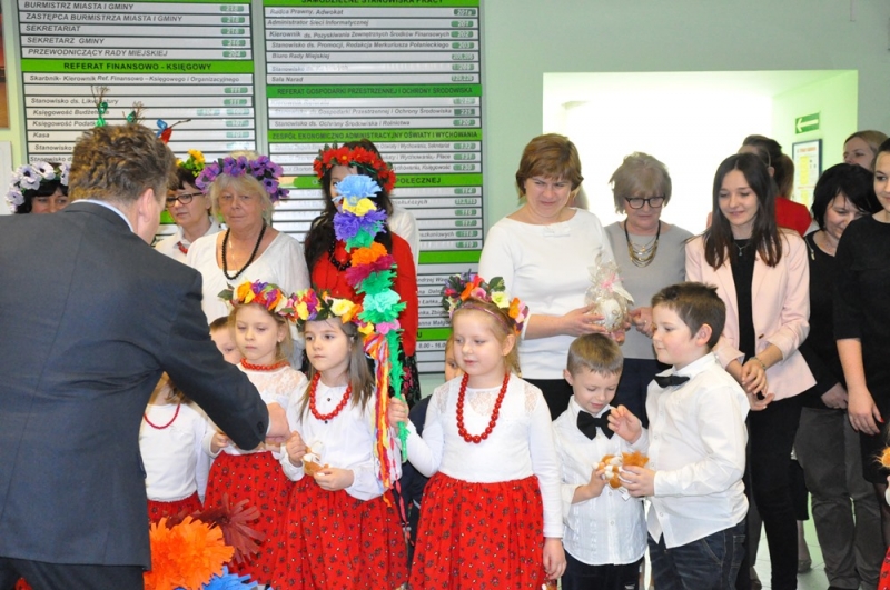 Wszystko wskazuje na to, że święta tuż, tuż... Wzrosła liczba osób, które do urzędu przychodzą ze świątecznymi życzeniami, na parterze można podziwiać wystawę świątecznych prac wykonanych przez uczestników Środowiskowego Domu Samopomocy lub nabyć przepiękne stroiki przygotowane własnoręcznie przez podopiecznych Warsztatów Terapii Zajęciowej. Jako pierwsi do urzędu z życzeniami zawitały 17 marca przedszkolaki w barwnych strojach wraz z panią dyrektor Anną Kaniszewską i opiekunkami.