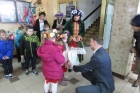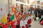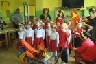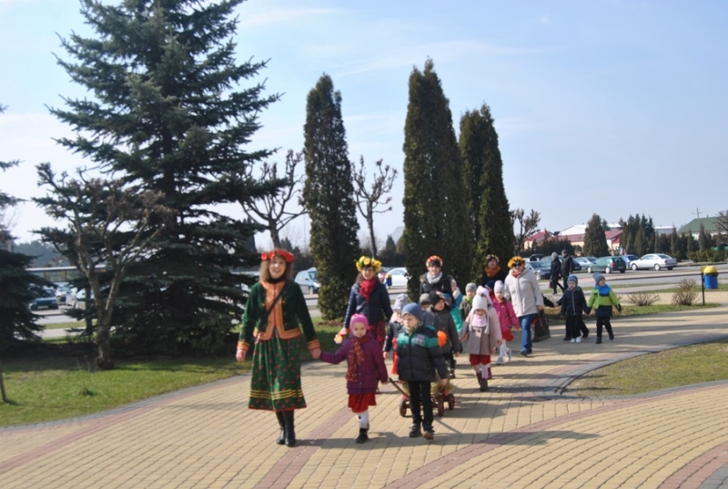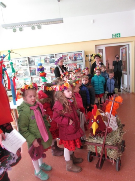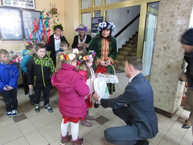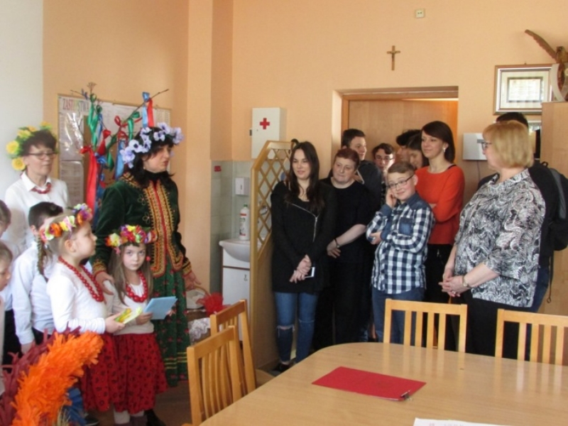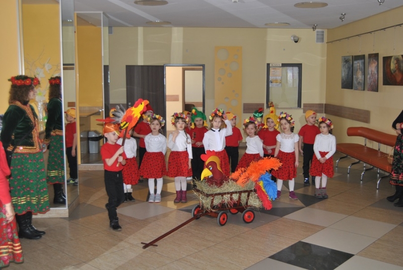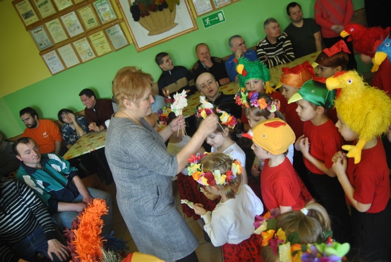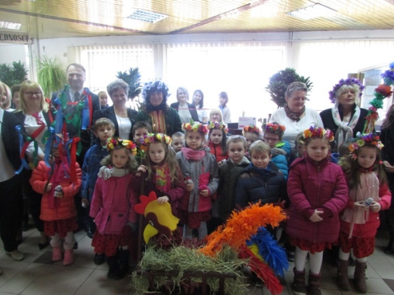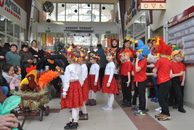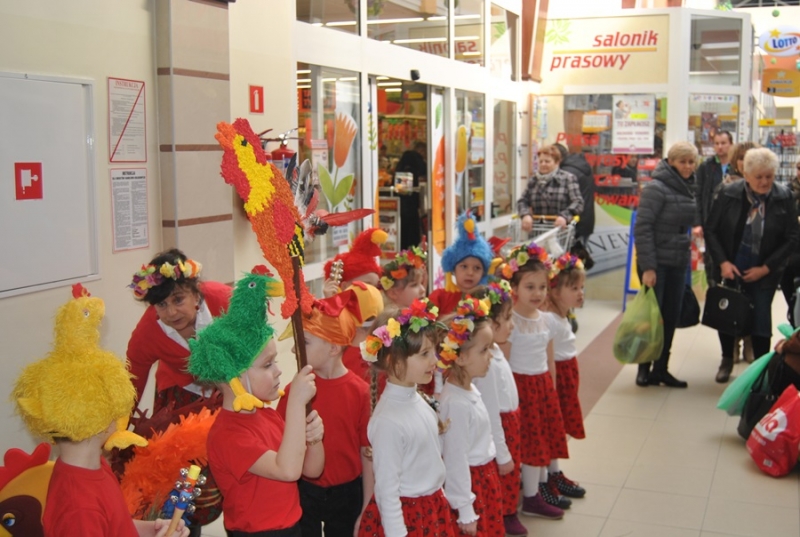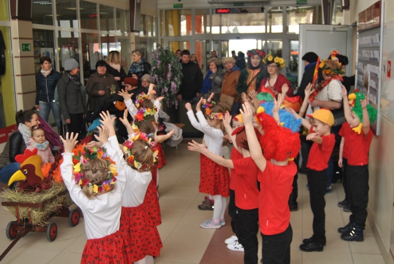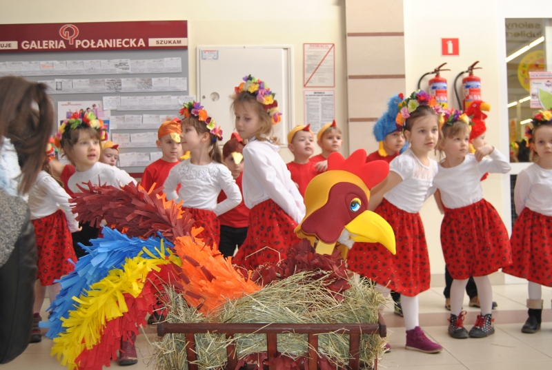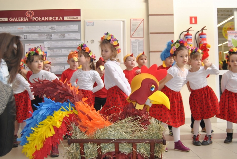 Barwnie przebrane dzieci i ich opiekunki wyruszyły z kogutem na wózku do zaprzyjaźnionych placówek i instytucji. Życzenia wielkanocne przekazane wierszem i piosenką w wykonaniu przedszkolaków sprawiły odbiorcom wiele radości i uśmiechu. Przez dwa dni dzieci z grupy „Kotki” i „Smerfy” zdołały odwiedzić: ŚDS ,WTZ, Urząd Miasta i Gminy. Bank Spółdzielczy, Publiczną Szkołę Podstawową, Publiczne Gimnazjum ,Bibliotekę Publiczną, Centrum Kultury i Sztuki ,Galerię Połaniecką i różne sklepiki. Za świąteczne życzenia dzieci otrzymały gorące brawa, maskotki i słodkie upominki, które sprawiły im wiele radości i zadowolenia.