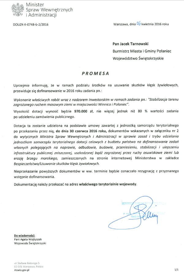 Dziś samorząd Połańca jest już w posiadaniu opracowania dokumentacji projektowo – budowlanej celem realizacji zadania inwestycyjnego polegającego na stabilizacji terenu, któremu grozi ruch masowy ziemi w Winnicy i Połańcu. W kwietniu bieżącego roku otrzymaliśmy również kolejną promesę na to zadanie z Ministerstwa Spraw Wewnętrznych i Administracji. Został ogłoszony przetarg na zabezpieczenie osuwiska, które obejmuje wykonanie następujących głównych robót wg ich kolejności: