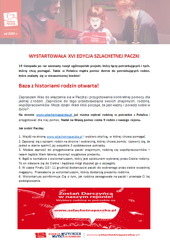 23 listopada 2016 roku w Centrum Kultury i Sztuki w Połańcu odbyło się spotkanie seniorów z Miasta i Gminy Połaniec. Organizatorami byli: Burmistrz Miasta i Gminy Połaniec, Przewodniczący Rady Miejskiej, Środowiskowy Dom Samopomocy oraz Centrum Kultury i Sztuki w Połańcu. W spotkaniu oprócz starszych mieszkańców uczestniczyli również członkowie rodzin zaproszonych seniorów. W ten sposób powstał dialog międzypokoleniowy a wspomnienia zostaną ocalone od zapomnienia na kolejne lata.
