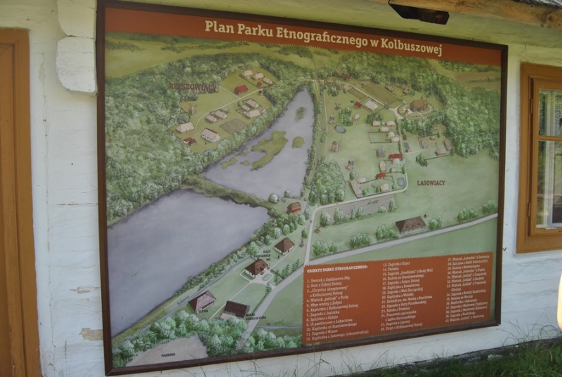 Na niemal 30 hektarach eksponowane jest ponad 80 obiektów dużej i małej architektury drewnianej. Są wśród nich chałupy, budynki inwentarskie (stajnie, obory, chlewy, kurniki), stodoły, spichlerze, maneż, bróg, budynki przemysłów wiejskich, jak młyn wodny, wiatraki, kuźnie, olejarnia i garncarnia, wreszcie budynki użyteczności publicznej – szkoła, karczma i remiza strażacka, a także okazały kościół p.w. św. Marka Ewangelisty. Do najstarszych obiektów należy m.in.: spichlerz dworski z Bidzin z 1784, chałupa z Markowej z 1804 r.oraz kościół z Mielca-Rzochowa postawiony w 1842 r.