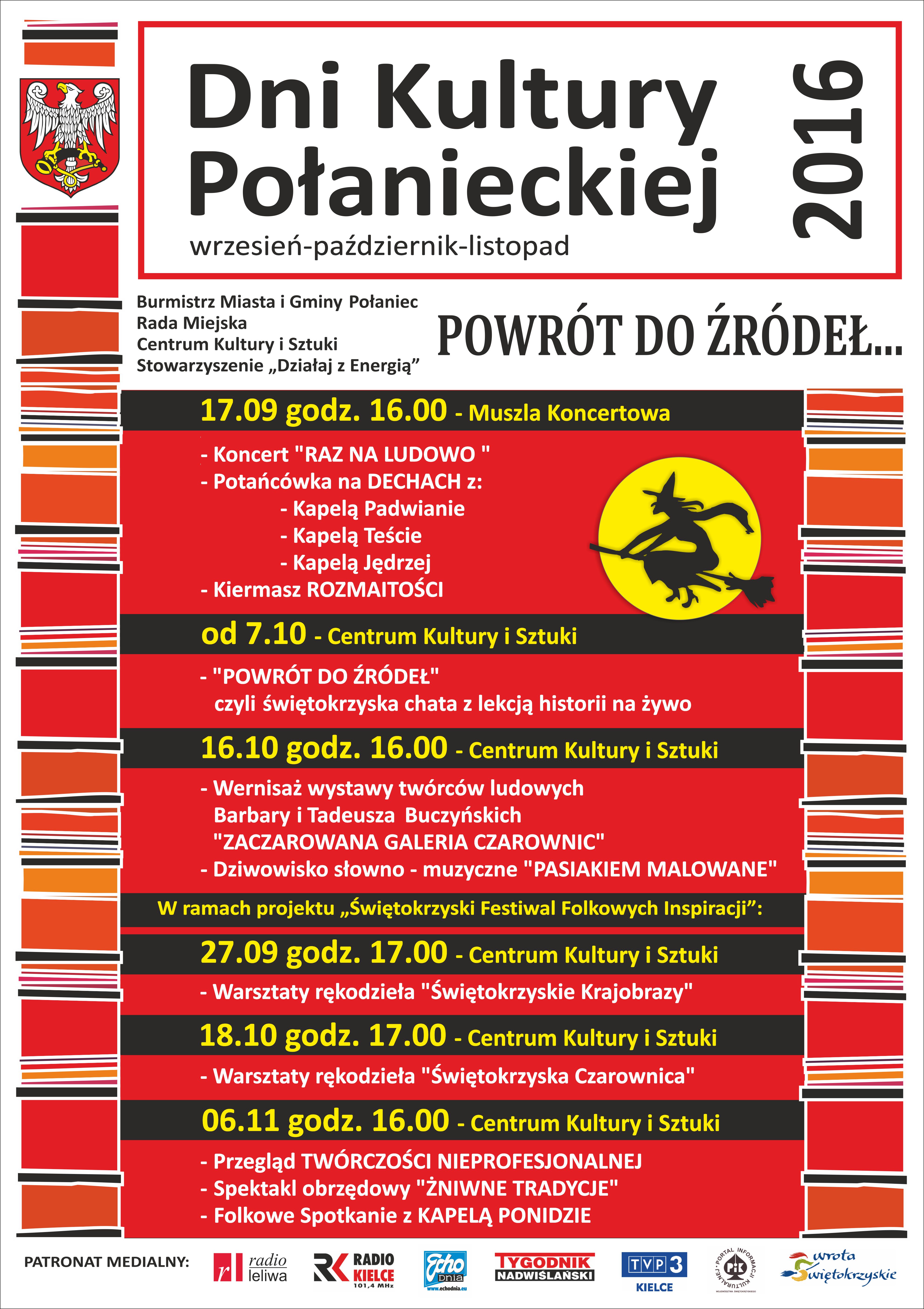 Już wkrótce .....pełne magii ziemi świętokrzyskiej Dni Kultury Połanieckiej i tym razem"Powrót do źródeł".17 września zaprosimy Was na Muszlę koncertową na Potańcówkę na dechach z extra Kapelami: „Teście”, „Jedrzej”, „Padwianie”, Kiermasz Rozmaitości i świetny Koncert „Raz na ludowo”. Świętokrzyskie czarownice zachwycą Was bliskimi sercu pejzażami podczas wrześniowo - październikowych warsztatów rękodzieła artystycznego. Spotkamy się również w Zaczarowanej Galerii Czarownic twórców ludowych Barbary i Tadeusza Buczyńskich oraz podczas Przeglądu Twórczości Nieprofesjonalnej z niezwykle interesującymi i nietuzinkowymi ludźmi, dla których folk i ludowizna jest sposobem na piękne, artystyczne życie. Ciekawą lekcją historii na żywo przeniesiemy Was do świętokrzyskiej chaty, czasów gdy nie było telewizora i komputerów. Zaprosimy Was także na Dziwowisko „Pasiakiem Malowane”, „Żniwne tradycje” i folkowe spotkanie z Kapelą Ponidzie.