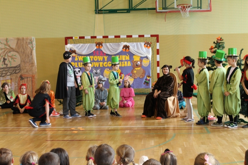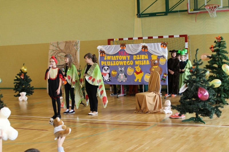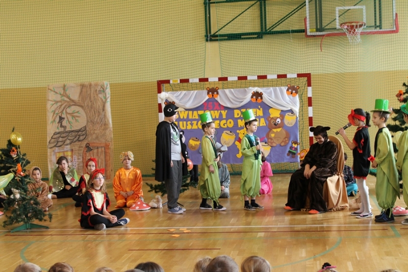 Jak co roku nasza szkoła, ku uciesze młodszych uczniów i przedszkolaków, włączyła się również w obchody tego święta. Wszystkie dzieci przyniosły z domu ulubione misie i razem z nimi wysłuchały opowieści o historii powstania pluszowego misia, jak również obejrzały inscenizację pt.” Urodziny Kubusia Puchatka”. Inscenizację przygotowała klasa IV z wychowawcą. Wszystkie dzieci otrzymały nalepki w kształcie misiów zaprojektowane i wykonane przez Panią Karolinę, oraz słodką niespodziankę - ciasteczko z misiem. Świętowanie Dnia Misia miało na celu rozwijanie zainteresowań czytelniczych oraz integrację społeczności uczniowskiej.