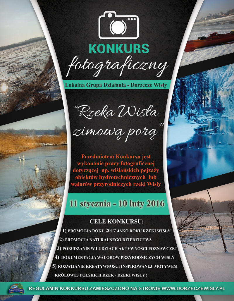 Lokalna Grupa Działania - Dorzecze Wisły zaprasza do wzięcia udziału w Konkursie "Rzeka Wisła zimową porą". Przedmiotem Konkursu jest wykonanie pracy fotograficznej wiślańskich pejzaży, obiektów hydrotechnicznych (mosty, progi, regulacje rzeki) lub walorów przyrodniczych rzeki Wisły (zwierzęta, rośliny, skałki, itp.) na odcinku rzeki płynącym na obszarze LGD – Dorzecze Wisły.