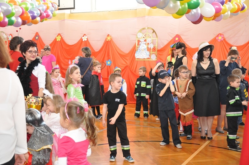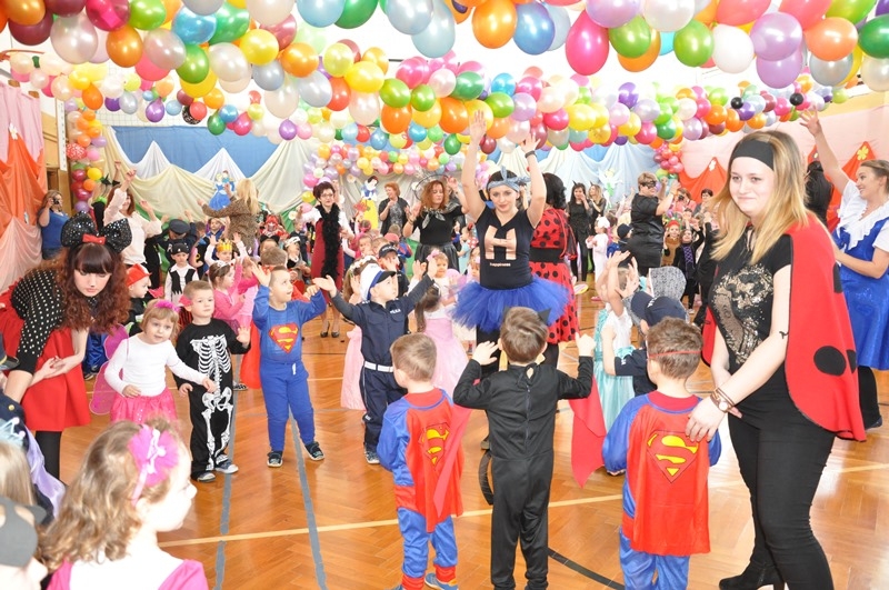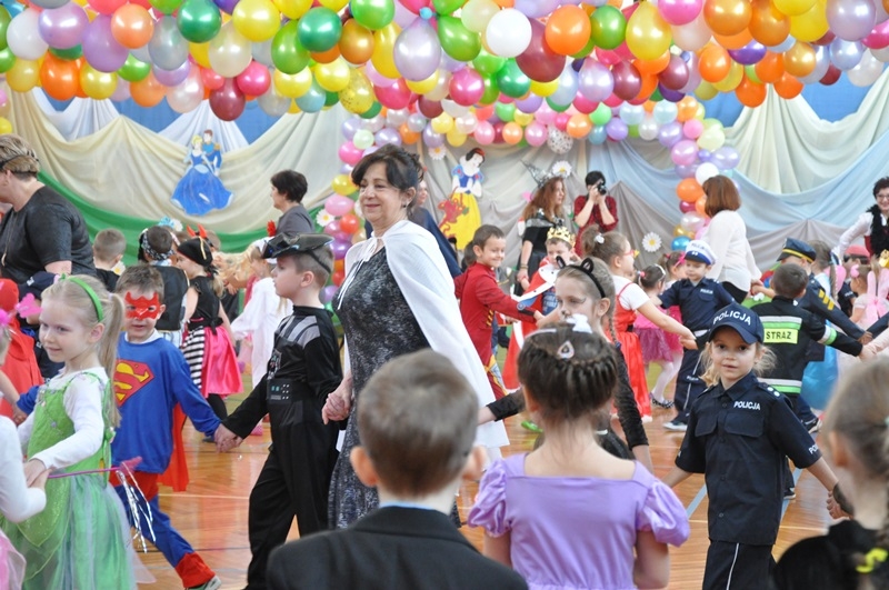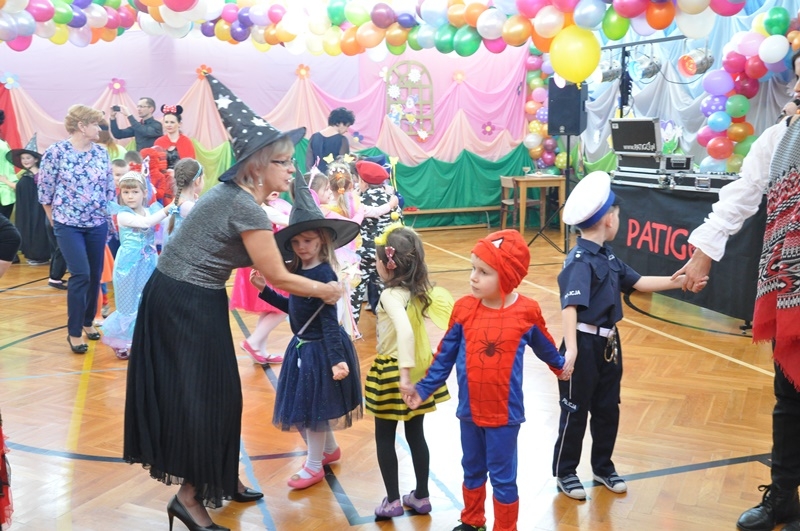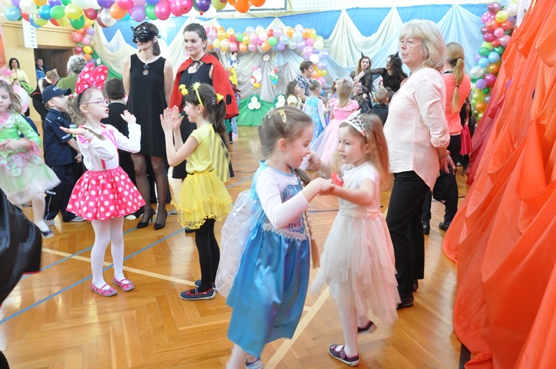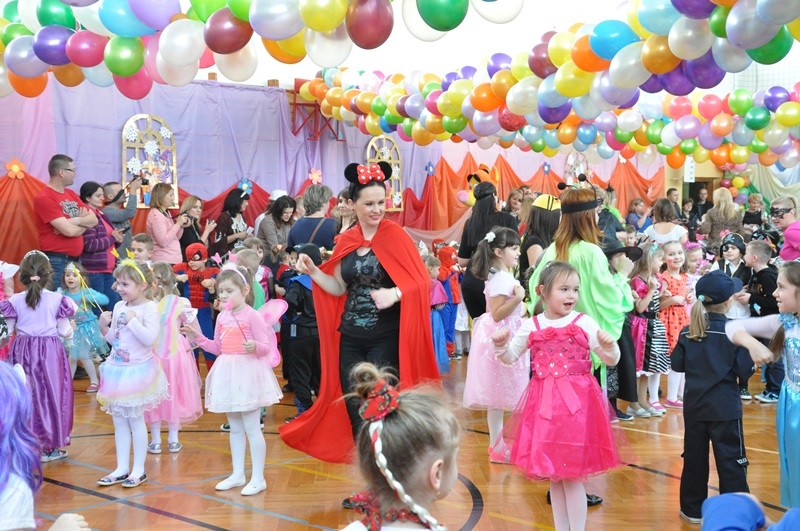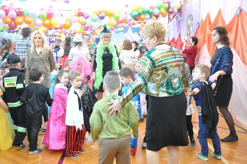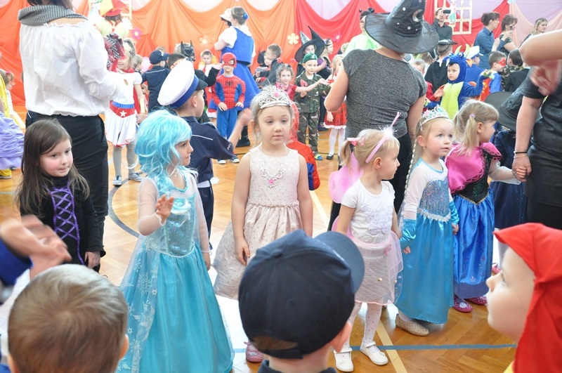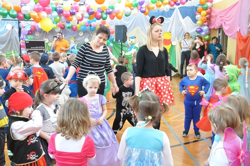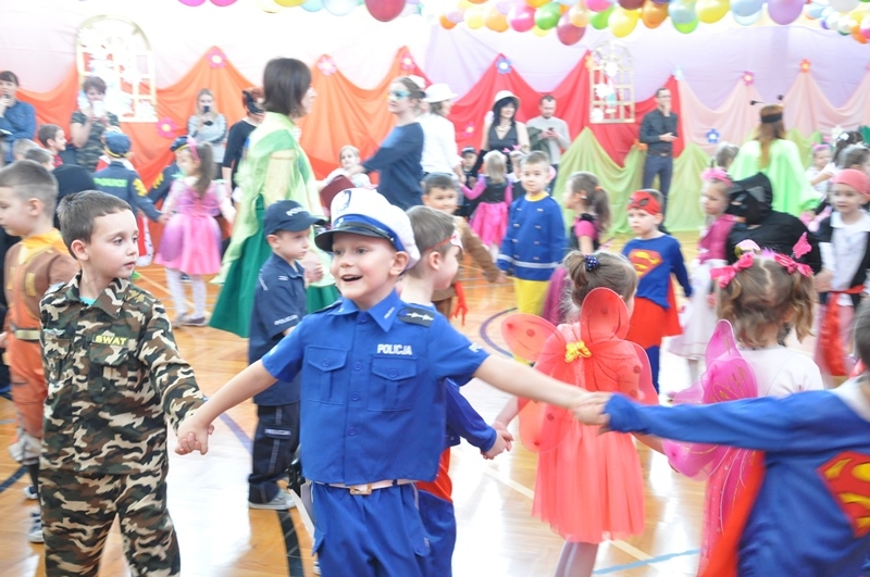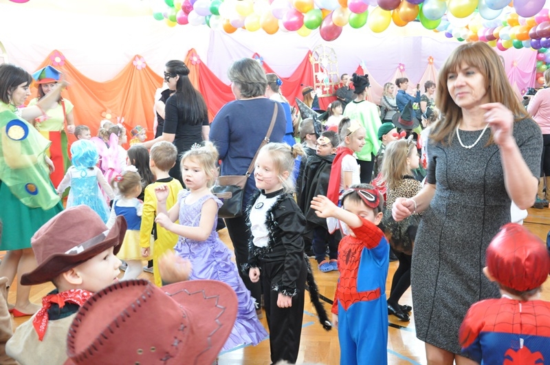 Już pierwsze dźwięki muzycznych hitów pod rozrywkowym okiem Wodzireja z zespołu „Patigo” tak porwały do tańca wszystkie księżniczki, kowbojów, wróżki, zwierzątka…….., że nawet chłopcy przebrani za policjantów (a mundur zobowiązuje) oddali się wesołym pląsom. Nie zabrakło również gościa specjalnego, okazał się nim przyjaciel Kubusia Puchatka - rozbrykany Tygrysek, który w mgnieniu oka przemknął po balowej sali witając się ze wszystkimi przedszkolakami. Tańce – wywijańce wprawiły wszystkich we wspaniały nastrój, na każdej dziecięcej buzi widać było radosne, promienne uśmiechy. Konkursy przygotowane i prowadzone przez Pana Wodzireja oraz sesja zdjęciowa pozwalały złapać oddech i dawały chwilę wytchnienia. Również słodki poczęstunek w postaci oponków i herbatki uczestnicy balu zjedli na wielkiej stołówce, co także okazało się wspaniałą atrakcją. Takie bale mogłyby się odbywać nie tylko w karnawale, więc: Niechaj krzyczą z lewa, z prawa – karnawał w przedszkolu – Super Zabawa!!!!