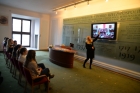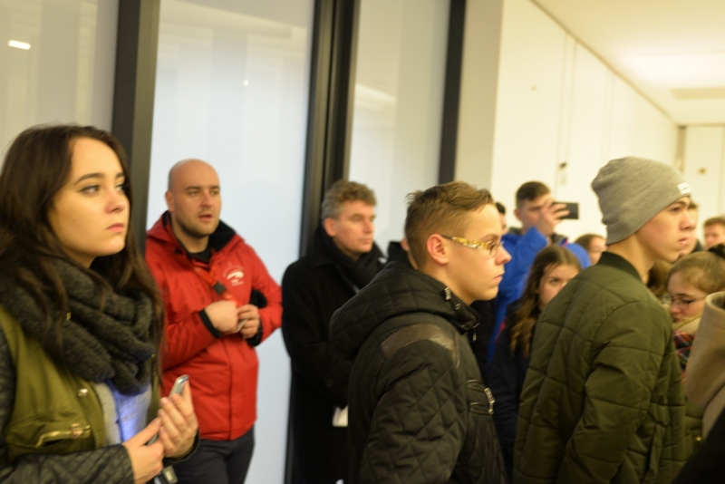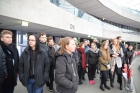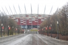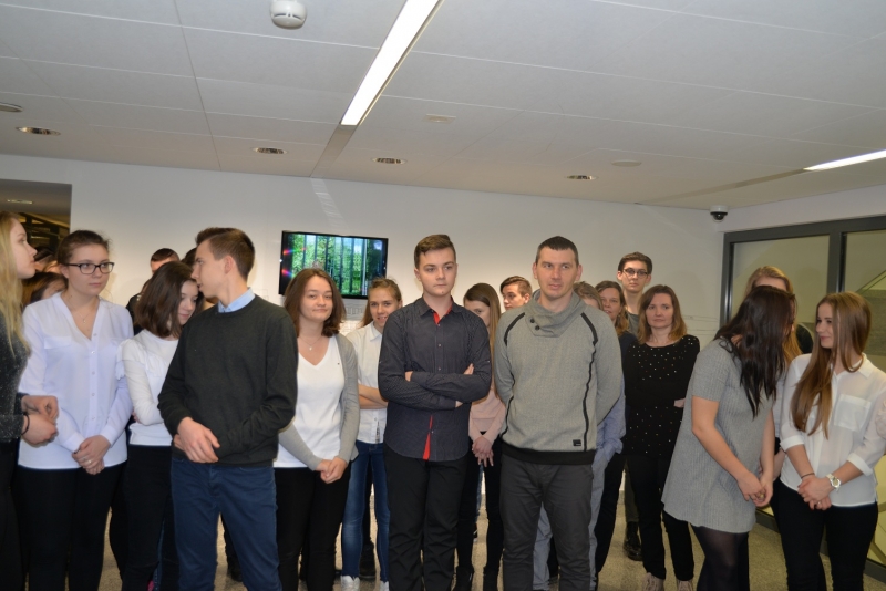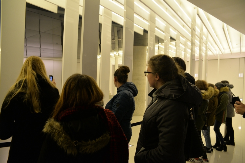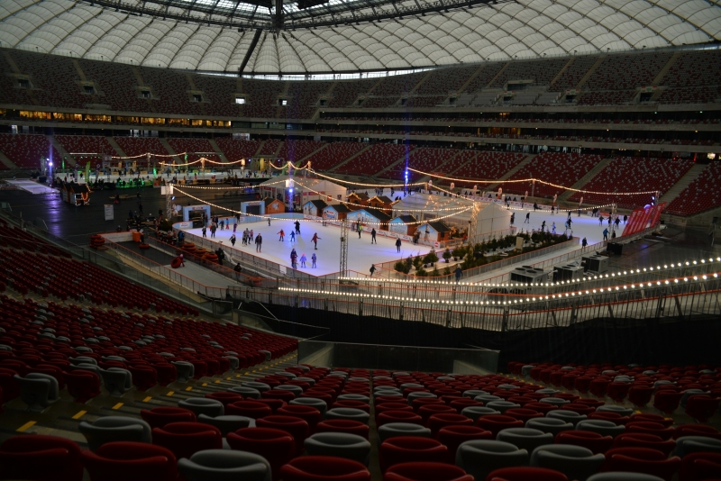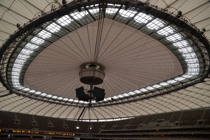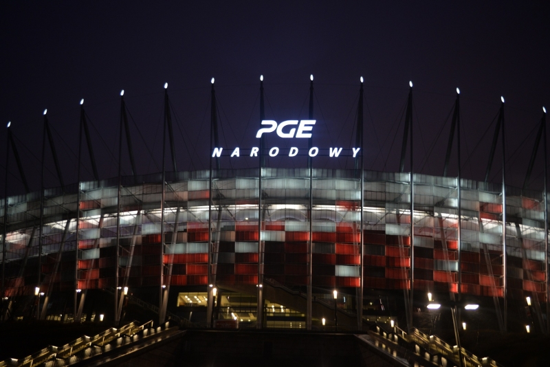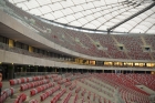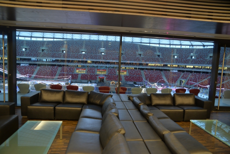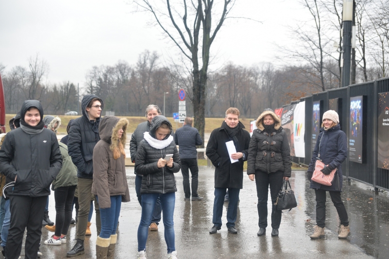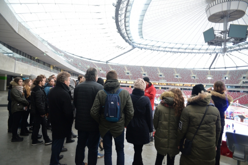 Kolejnym punktem wycieczki była wizyta na Stadionie Narodowym, który wzbudził wśród młodzieży wiele emocji. Mimo niesprzyjających warunków atmosferycznych obiekt zrobił na wszystkich piorunujące wrażenie. Chyba nikt się nie spodziewał, że jest tak ogromny i nowoczesny. PGE Narodowy to jedno z miejsc, w których na żywo można uczestniczyć w wielkich wydarzeniach sportowych i rozrywkowych. Pan przewodnik oprowadził młodzież po pomieszczeniach, w których gwiazdy przygotowują się do swoich występów oraz opowiedział, w jaki sposób Stadion Narodowy przygotowywany jest na przyjęcie artystów. Wszyscy z ciekawością i wielkim zainteresowaniem obejrzeli m. in. szatnie piłkarzy, trybuny, loże VIP, kaplicę wielowyznaniową, miejsca, w których sportowcy relaksują się oraz dbają o kondycję. Młodzież mogła też wcielić się w rolę dziennikarzy sportowych zwiedzając trybunę medialną i salę konferencyjną.