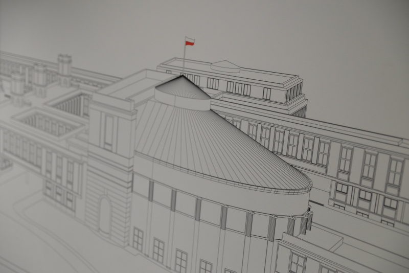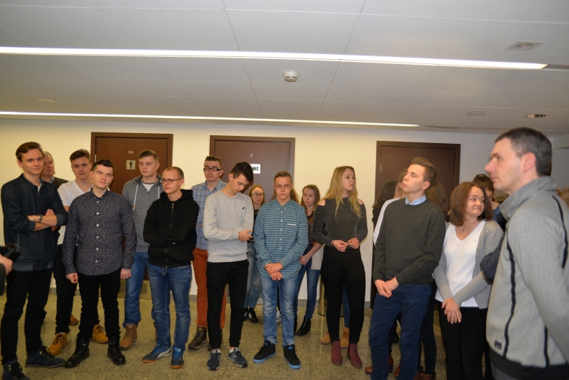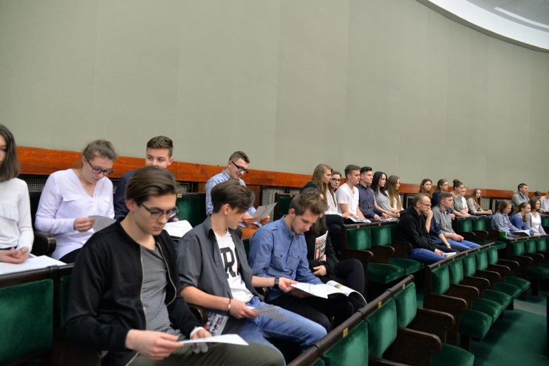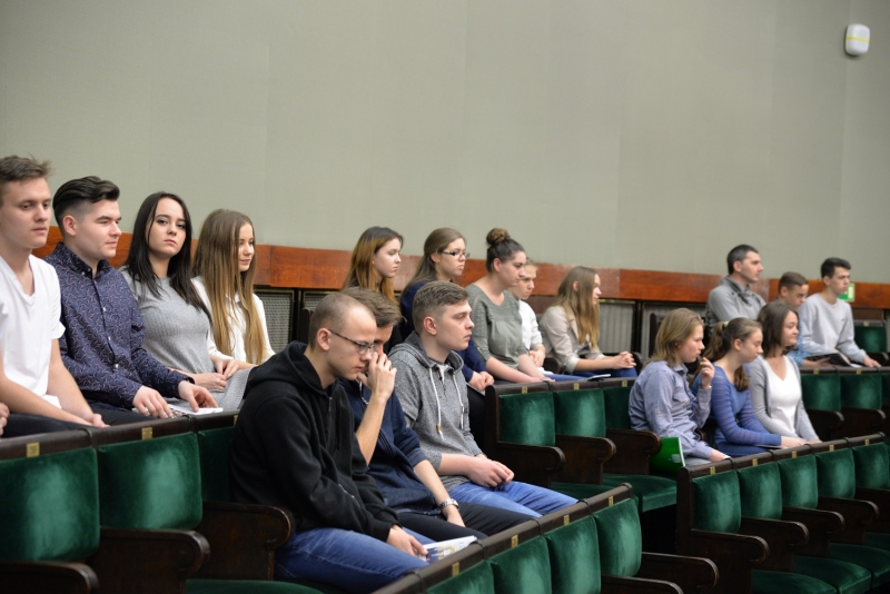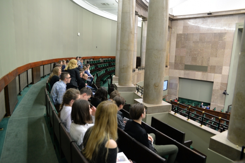 Pierwszym punktem wyjazdu była wizyta w Sejmie RP. Po odebraniu przepustek wszystkich przybyłych gorąco powitał poseł na Sejm RP z regionu świętokrzyskiego – Pan Krystian Jarubas. Po sejmowym gmachu oprowadziła uczniów Pani Przewodnik. Chwile spędzone w budynku sejmowym dostarczyły wielu wrażeń, gdyż wszyscy mogli zobaczyć salę obrad i podążać korytarzami, na których spotykają się polscy politycy widziani w telewizyjnych wydarzeniach. Podczas wykładu w Sali Wszechnicy Sejmowej uczniowie mogli wysłuchać w jaki sposób funkcjonuje współczesny parlament, jak powstaje ustawa oraz zapoznać się z pracą, obowiązkami i prawami parlamentarzystów. Była okazja, by zapoznać się także z historią polskiego parlamentaryzmu. Uczestnicy wyjazdu mieli niepowtarzalną okazję uczestniczyć przez chwilę w obradach sejmowych z perspektywy sejmowej galerii, skąd m. in. wysłuchało wystąpienia posła z regionu świętokrzyskiego – Pana Kazimierza Kotowskiego. Miłym akcentem okazało się publiczne przywitanie grupy z Połańca przez prowadzącego tego dnia obrady Wicemarszałka Sejmu – Joachima Brudzińskiego. Wizyta w sejmie i wykład przewodnika sejmowego pokazały młodzieży, jak ważne jest to, że Polska posiada jedną z najstarszych tradycji parlamentarnych w Europie.