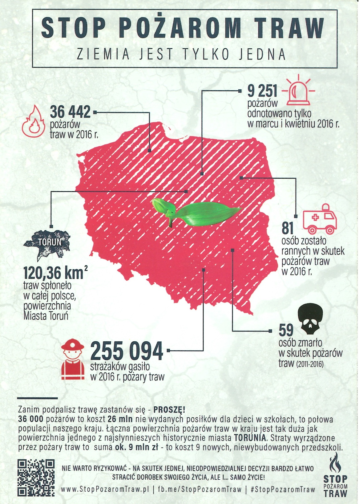 Nadeszła upragniona wiosna, a wraz z nią rozpoczął się czas licznych porządków na naszych działkach, ogrodach, polach uprawnych i niestety także okres bezmyślnego wypalania traw. Zwracamy się do mieszkańców naszej Gminy z apelem o niewypalanie traw. Naszą prośbę kierujemy nie tylko do osób praktykujących ten zwyczaj, ale również do ich rodzin, sąsiadów, wszystkich mieszkańców gminnych miejscowości – naszym obowiązkiem jest uświadamianie innym, jak wiele szkód niesie ze sobą wypalanie traw. Agencja Rozwoju i Modernizacji Rolnictwa również co roku przypomina, że działanie takie jest nie tylko zabronione i karane ale przede wszystkim szkodliwe, niebezpieczne i... nieskuteczne. Proceder ten przynosi wiele szkód - niejednokrotnie jest przyczyną pożarów, stanowiących zagrożenie dla życia i zdrowia ludzi oraz niszczy faunę i florę naszej małej ojczyzny.