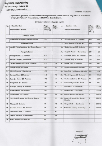 Ideą zawodów, jak zawsze, było pokazanie, że wędkarstwo nie musi iść w parze z zabijaniem ryb, dlatego zawody zorganizowano w formule "no kill" czyli inaczej "złów i wypuść" – tak aby ryba bez uszczerbku wróciła do wody. Zawody prowadził sędzia klasy krajowej Adam Mamuszka. O godzinie 13:30 nastąpiło zakończenie zawodów, a komisja przystąpiła do ważenia ryb, na poszczególnych stanowiskach. Po zawodach zawodnicy w oczekiwaniu na wyniki udali się na pyszną golonkę i kaszankę, a nastepnie wręczenie nagród, zapewnionych przez Miasto i Gminę Połaniec oraz pucharów ufundowanych przez Koło nr 25. Gratulacje zawodnikom składał sędzia – Adam Mamuszka. Całość imprezy przebiegała w miłej i spokojnej atmosferze. Gratulujemy zwycięzcom, a kto nie zdobył nagród nic straconego, bo za rok będzie okazja do rewanżu, a w międzyczasie koło organizuje również inne zawody wędkarskie.