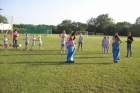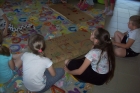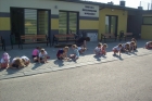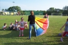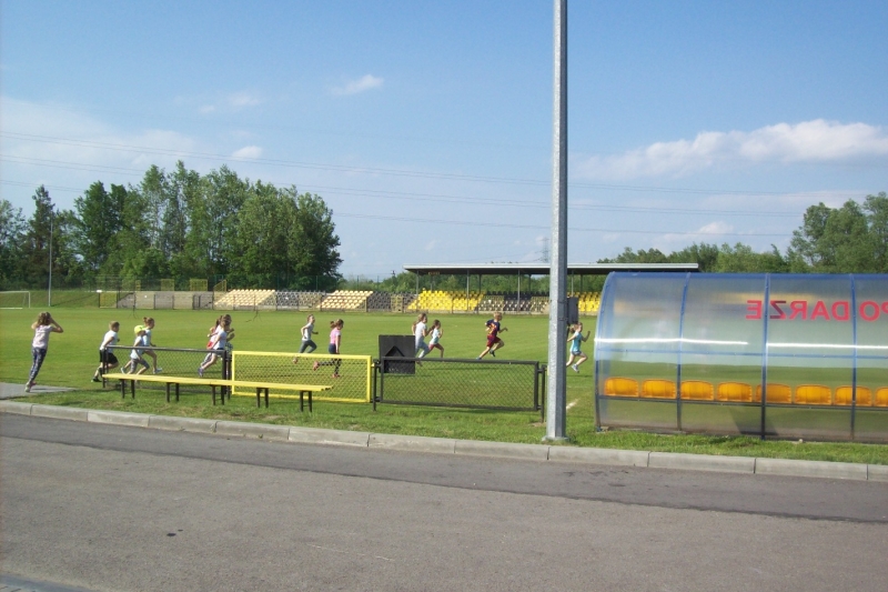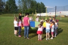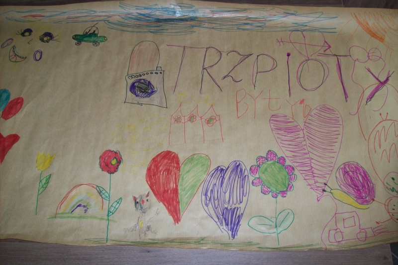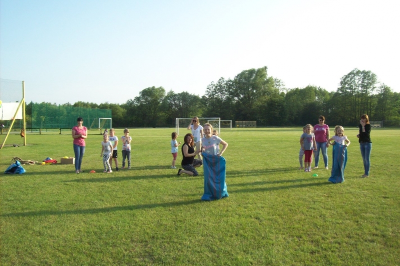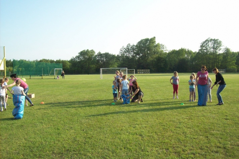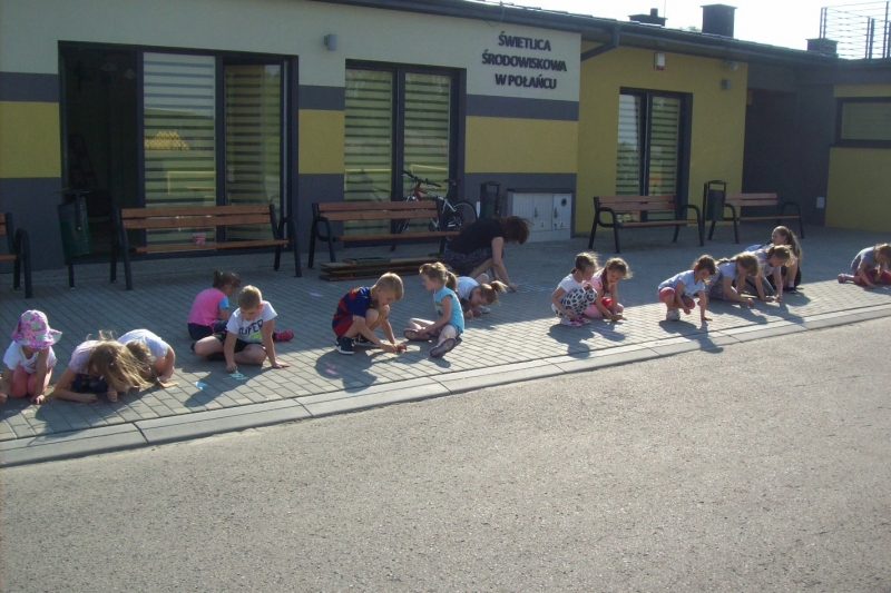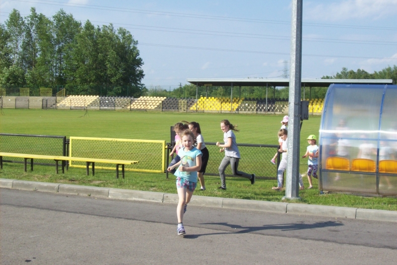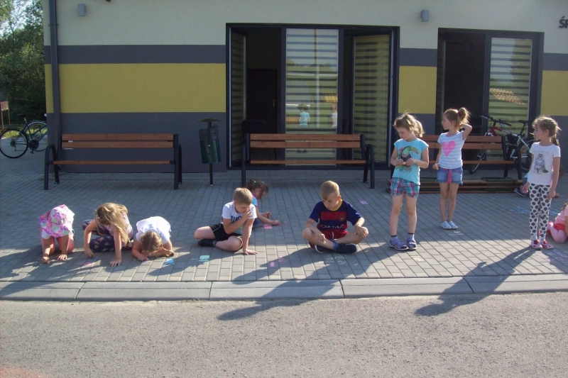 Następnym punktem wizyty była zabawa polegająca na malowaniu kredą. Malując kredą po chodniku dzieci miały prawie nieograniczoną przestrzeń do tworzenia z rozmachem, mogły pozwolić swobodnie działać fantazji. Nie zabrakło też aktywności ruchowej w formie przebieżki po stadionie, przeciągania liny, skoków w workach oraz zabaw z chustą animacyjną.