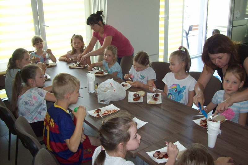 Po tak aktywnych zabawach, dla naszych gości i podopiecznych, przygotowaliśmy kiełbaski z grilla oraz słodki poczęstunek.