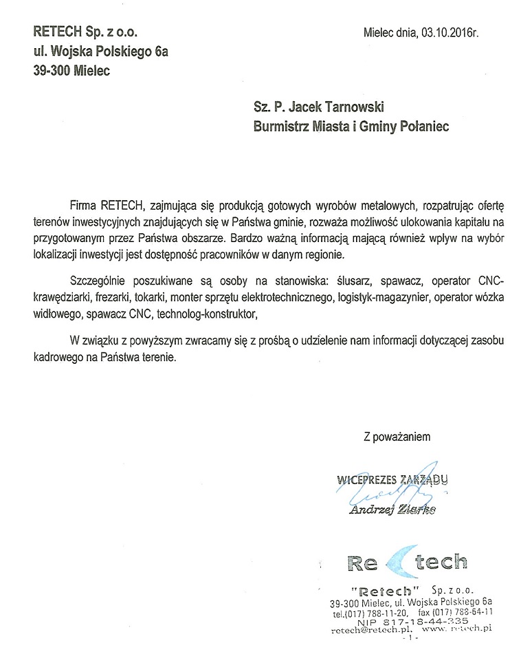 W związku z licznymi zapytaniami firm zainteresowanych ulokowaniem swojego kapitału na terenie Naszej Gminy, powstała potrzeba utworzenia bazy potencjału pracowniczego w naszym regionie. Dwie firmy zwróciły się dodatkowo z zapytaniem o możliwość rozwoju w Połańcu i dostępność pracowników wymaganych specjalności: firma elPLC z Tarnowa zajmująca się wytwarzaniem elementów mechanicznych, produkcją maszyn i stanowisk montażowych oraz firma RETECH zlokalizowana na terenie Specjalnej Strefy Ekonomicznej EURO-PARK MIELEC ukierunkowana na produkcję wysokiej jakości metalowych wyrobów gotowych.