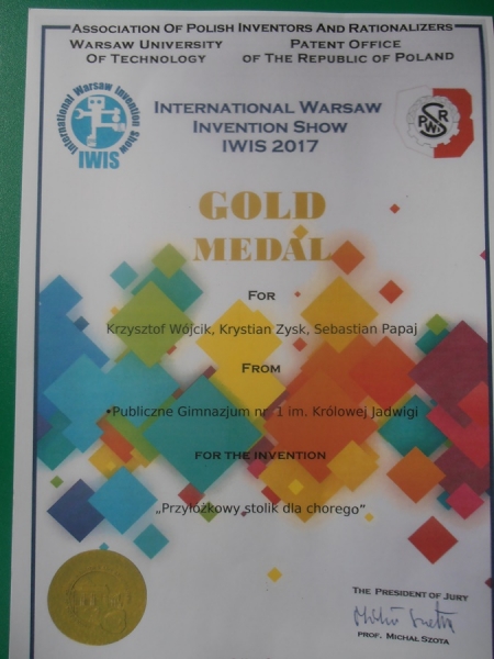 To już drugi z rzędu złoty medal w prestiżowej wystawie wynalazków z udziałem połanieckich uczniów, w której wzięło w tym roku udział 25 państw. W roku 2016 uczniowie Gimnazjum im. Królowej Jadwigi zgłosili do urzędu patentowego wynalazek „Elektroniczny system bezpieczeństwa dla pojazdów mobilnych”, po czym zdobyli złoty medal na Wystawie Wynalazków IWIS 2016.