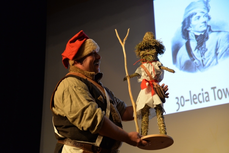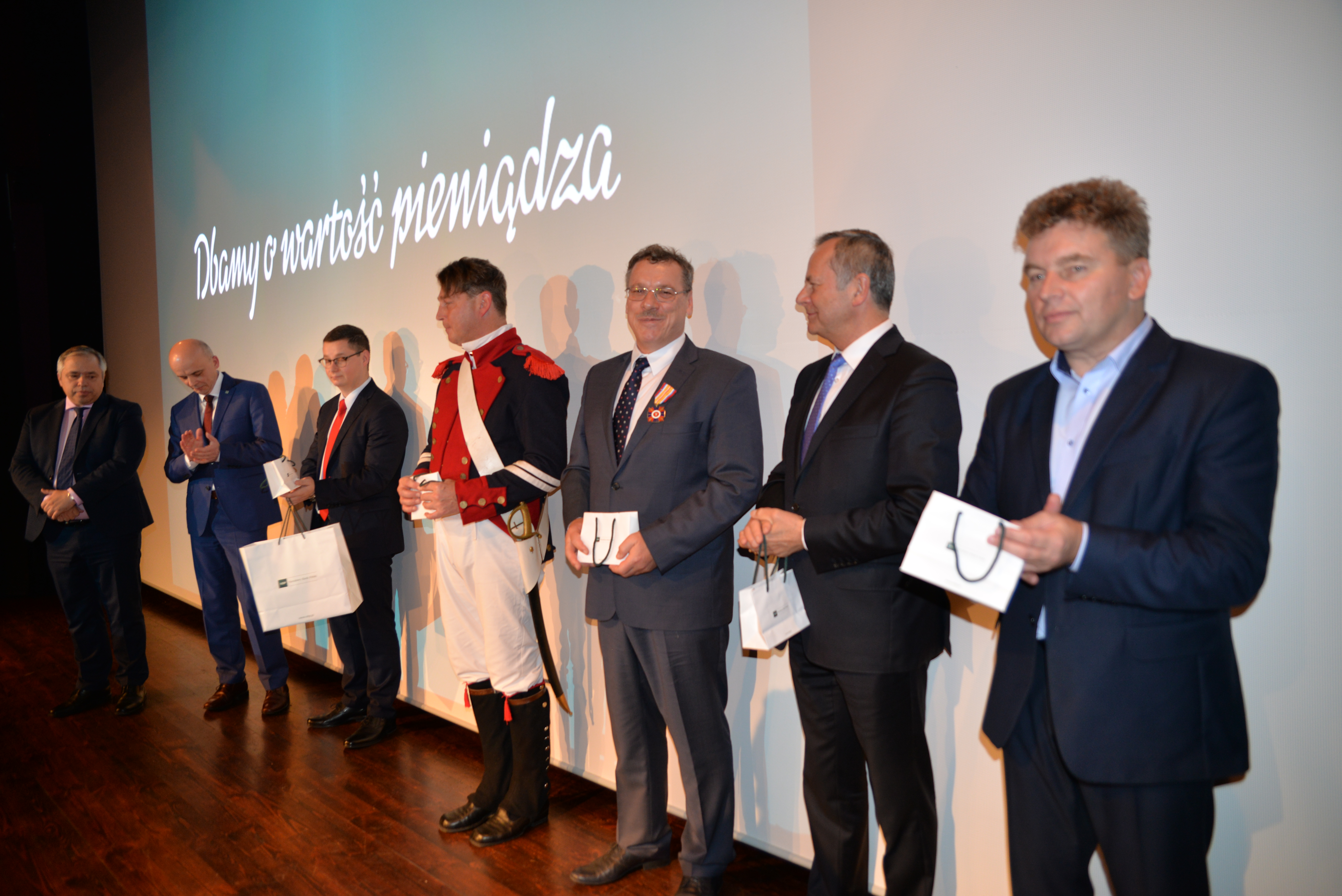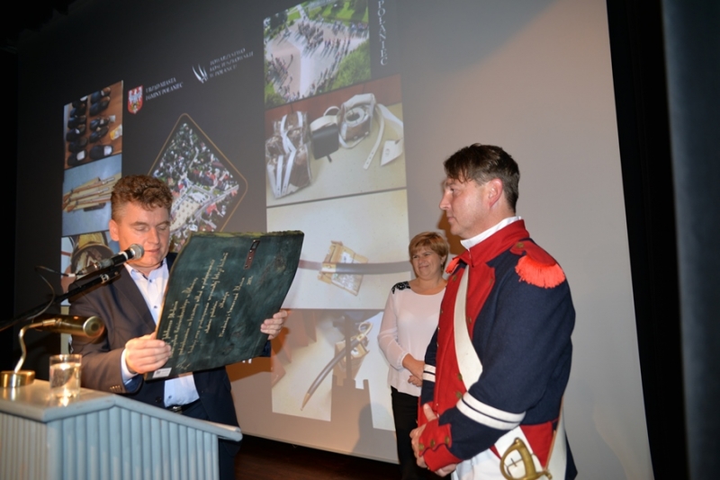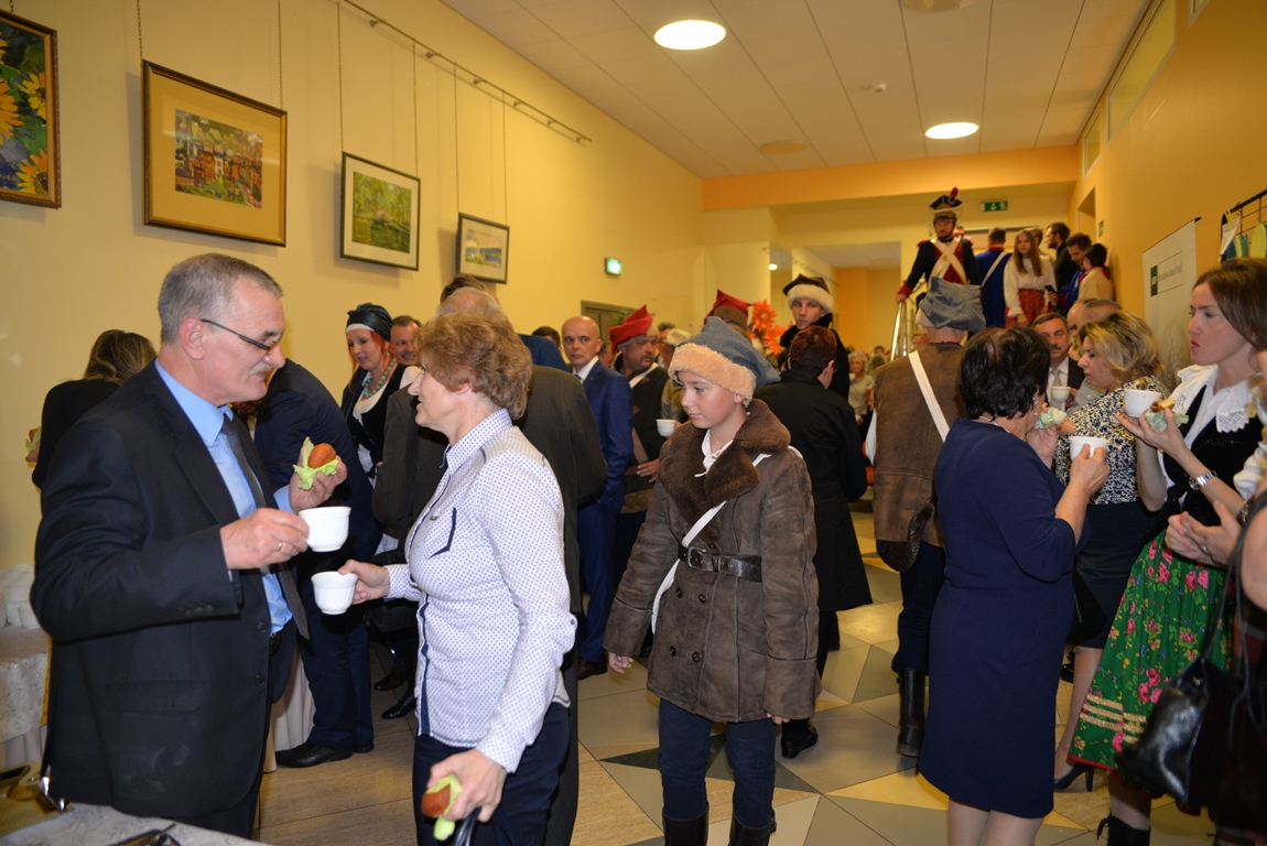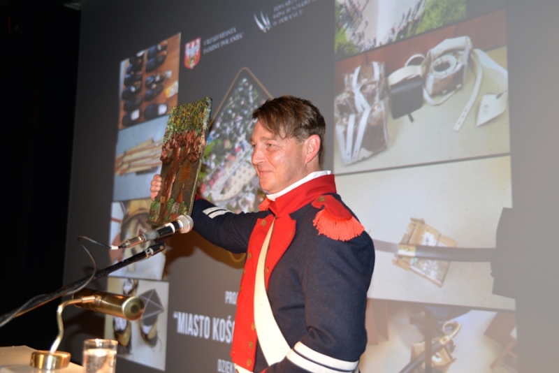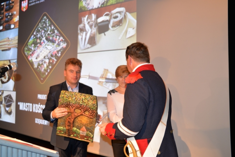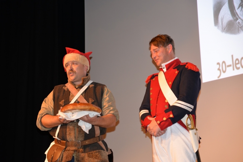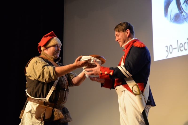 Pamiątkowe monety od dyrektora Oddziału NBP w Kielcach Grzegorza Kłaczkiewicza otrzymali: Burmistrz Połańca Jacek Tarnowski (syn założyciela Towarzystwa Kościuszkowskiego), Lech Żak – Prezes Zarządu ENEA Elektrownia Połaniec SA (największego zakładu wspierającego zawsze nasze stowarzyszenie, Mieczysław Machulak (prezes TK w latach 1999-2007), Radosław Matusiewicz (obecny prezes TK), Konstanty Michorowski (najstarszy „czynny kosynier”, który tym samym powiększył swoją kolekcję numizmatyczną) oraz Towarzystwo Kościuszkowskie (do dyspozycji organizacji). Na zakończenie Towarzystwo Kościuszkowskie otrzymało wiele wspaniałych prezentów i usłyszało mnóstwo ciepłych słów. Burmistrz Jacek Tarnowski dokonał też symbolicznego przekazania rekwizytów i umundurowania zakupionego dla Towarzystwa w ramach projektu „Miasto Kościuszki 2017”. Była też jedna, szczególna niespodzianka. Radosław Matusiewicz otrzymał od swoich Przyjaciół wspaniałą szablę, wzorowaną na oryginalnej „szabli Kościuszki”. Po przemówieniach i prezentach od naszych gości, wszyscy przeszli do Sali kawiarnianej, gdzie czekał niezwykły poczęstunek. Były nim potrawy przyrządzone według staropolskich przepisów, w oparciu o to, co jadał nasz Bohater. Była więc kasza jęczmienna z boczkiem, pierogi litewskie (ze słodką kapustą i mięsem), pierogi białoruski (z kaszą, serem, cebulą i okrasą), pampuchy z żurawiną, pampuchy z mięsem oraz przysmaki połanieckie (zwłaszcza niepowtarzalne Serdelki od Pana Kazimierza Zalińskiego). O tę przepyszną część imprezy zadbali Jerzy Stefaniak, a także panie z Góreckiego Stowarzyszenia Kobiet „Viktoria”. Jubileuszowi towarzyszyły też okolicznościowe wystawy. Pierwszą z nich pn. “30 lat utrwalania tradycji kościuszkowskich” – przygotowała połaniecka Biblioteka. Zaprezentowano na niej dorobek wydawniczy naszego stowarzyszenia, archiwalne artykuły z prasy o naszej działalności oraz kalendarium ważnych wydarzeń z historii Towarzystwa. Druga to wystawa zdjęć realizowana w ramach projektu „Miasto Kościuszki 2017”, pokazująca najciekawsze działania przeprowadzone w bieżącym roku. Goście opuszczali Połaniec zadowoleni i najedzeni. Wszyscy podkreślali udział w uroczystościach grupy naszej wspaniałej młodzieży, w strojach kosynierskich. Takiej młodzieży zazdrości nam cała Polska.