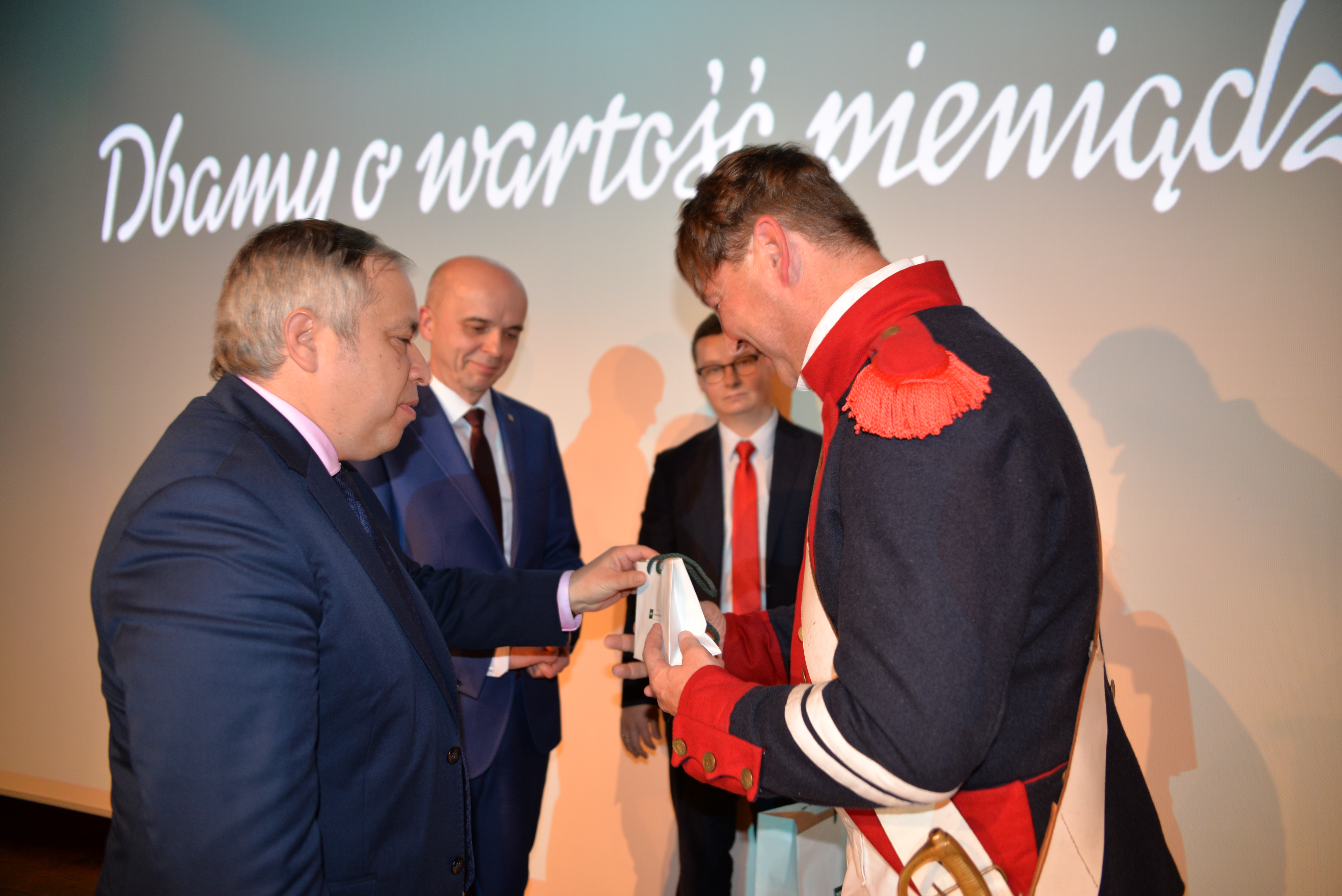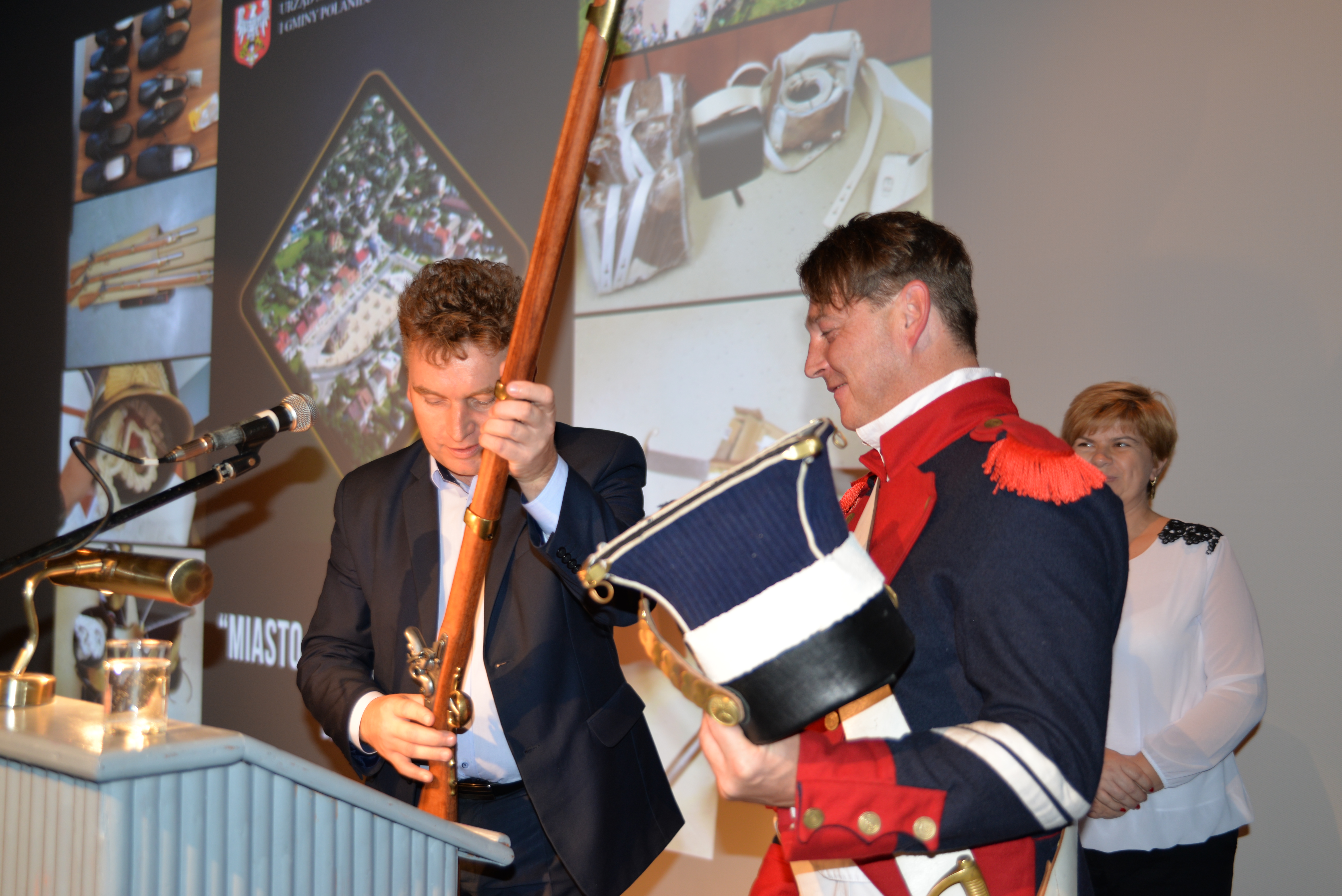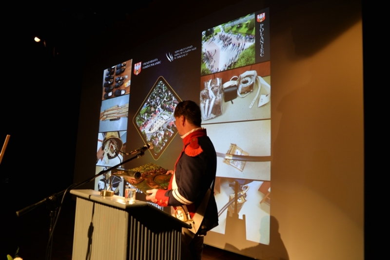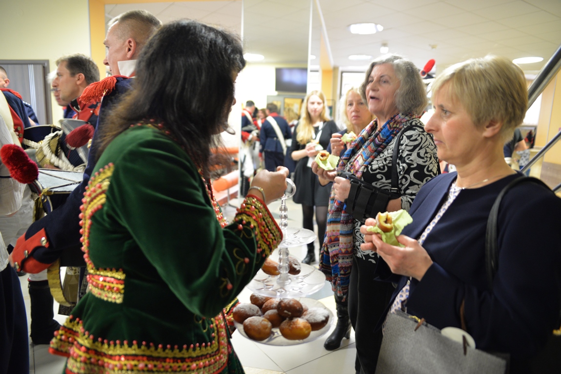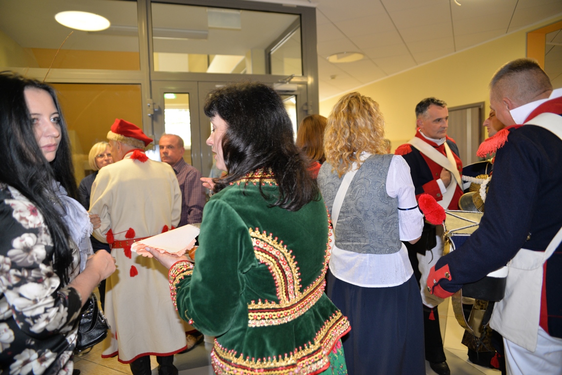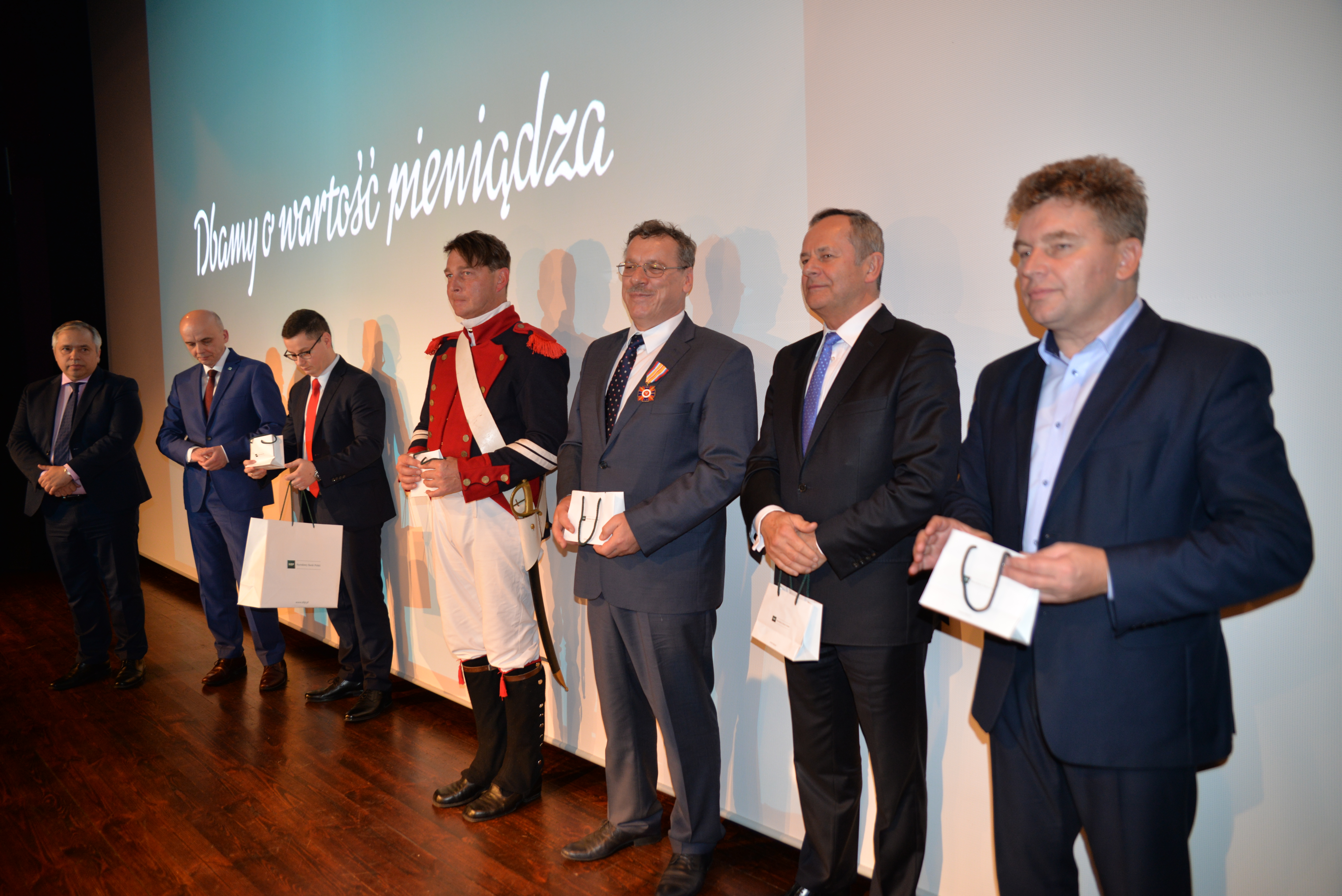Pamiątkowe monety od dyrektora Oddziału NBP w Kielcach Grzegorza Kłaczkiewicza otrzymali: Burmistrz Połańca Jacek Tarnowski (syn założyciela Towarzystwa Kościuszkowskiego), Lech Żak – Prezes Zarządu ENEA Elektrownia Połaniec SA (największego zakładu wspierającego zawsze nasze stowarzyszenie, Mieczysław Machulak (prezes TK w latach 1999-2007), Radosław Matusiewicz (obecny prezes TK), Konstanty Michorowski (najstarszy „czynny kosynier”, który tym samym powiększył swoją kolekcję numizmatyczną) oraz Towarzystwo Kościuszkowskie (do dyspozycji organizacji). Na zakończenie Towarzystwo Kościuszkowskie otrzymało wiele wspaniałych prezentów i usłyszało mnóstwo ciepłych słów. Burmistrz Jacek Tarnowski dokonał też symbolicznego przekazania rekwizytów i umundurowania zakupionego dla Towarzystwa w ramach projektu „Miasto Kościuszki 2017”. Była też jedna, szczególna niespodzianka. Radosław Matusiewicz otrzymał od swoich Przyjaciół wspaniałą szablę, wzorowaną na oryginalnej „szabli Kościuszki”. Po przemówieniach i prezentach od naszych gości, wszyscy przeszli do Sali kawiarnianej, gdzie czekał niezwykły poczęstunek. Były nim potrawy przyrządzone według staropolskich przepisów, w oparciu o to, co jadał nasz Bohater. Była więc kasza jęczmienna z boczkiem, pierogi litewskie (ze słodką kapustą i mięsem), pierogi białoruski (z kaszą, serem, cebulą i okrasą), pampuchy z żurawiną, pampuchy z mięsem oraz przysmaki połanieckie (zwłaszcza niepowtarzalne Serdelki od Pana Kazimierza Zalińskiego). O tę przepyszną część imprezy zadbali Jerzy Stefaniak, a także panie z Góreckiego Stowarzyszenia Kobiet „Viktoria”. Jubileuszowi towarzyszyły też okolicznościowe wystawy. Pierwszą z nich pn. “30 lat utrwalania tradycji kościuszkowskich” – przygotowała połaniecka Biblioteka. Zaprezentowano na niej dorobek wydawniczy naszego stowarzyszenia, archiwalne artykuły z prasy o naszej działalności oraz kalendarium ważnych wydarzeń z historii Towarzystwa. Druga to wystawa zdjęć realizowana w ramach projektu „Miasto Kościuszki 2017”, pokazująca najciekawsze działania przeprowadzone w bieżącym roku. Goście opuszczali Połaniec zadowoleni i najedzeni. Wszyscy podkreślali udział w uroczystościach grupy naszej wspaniałej młodzieży, w strojach kosynierskich. Takiej młodzieży zazdrości nam cała Polska.