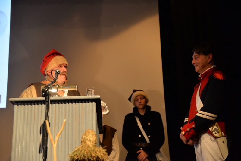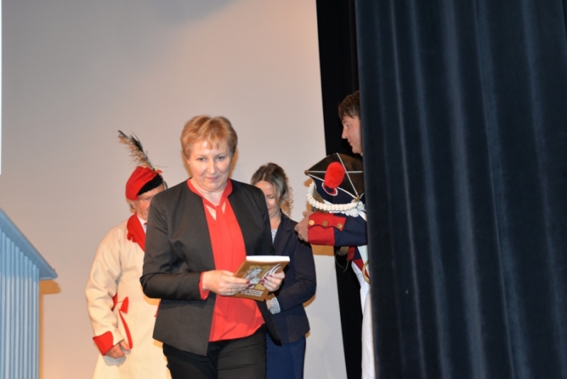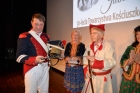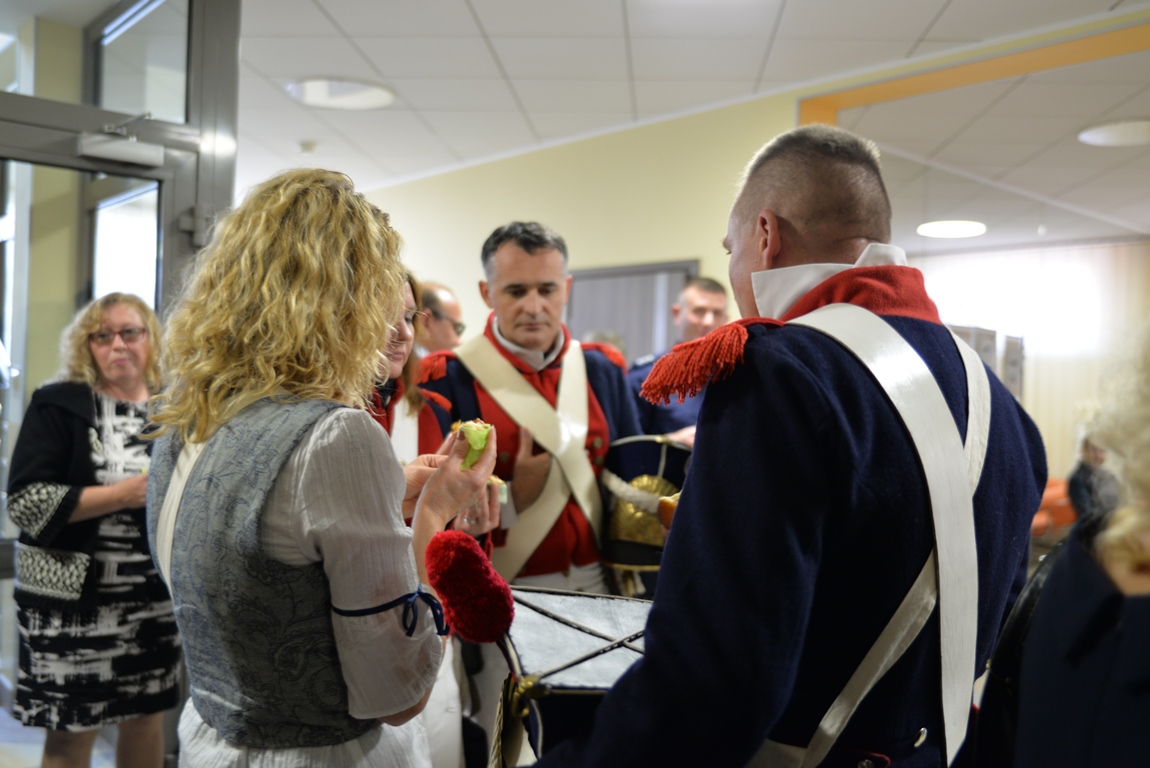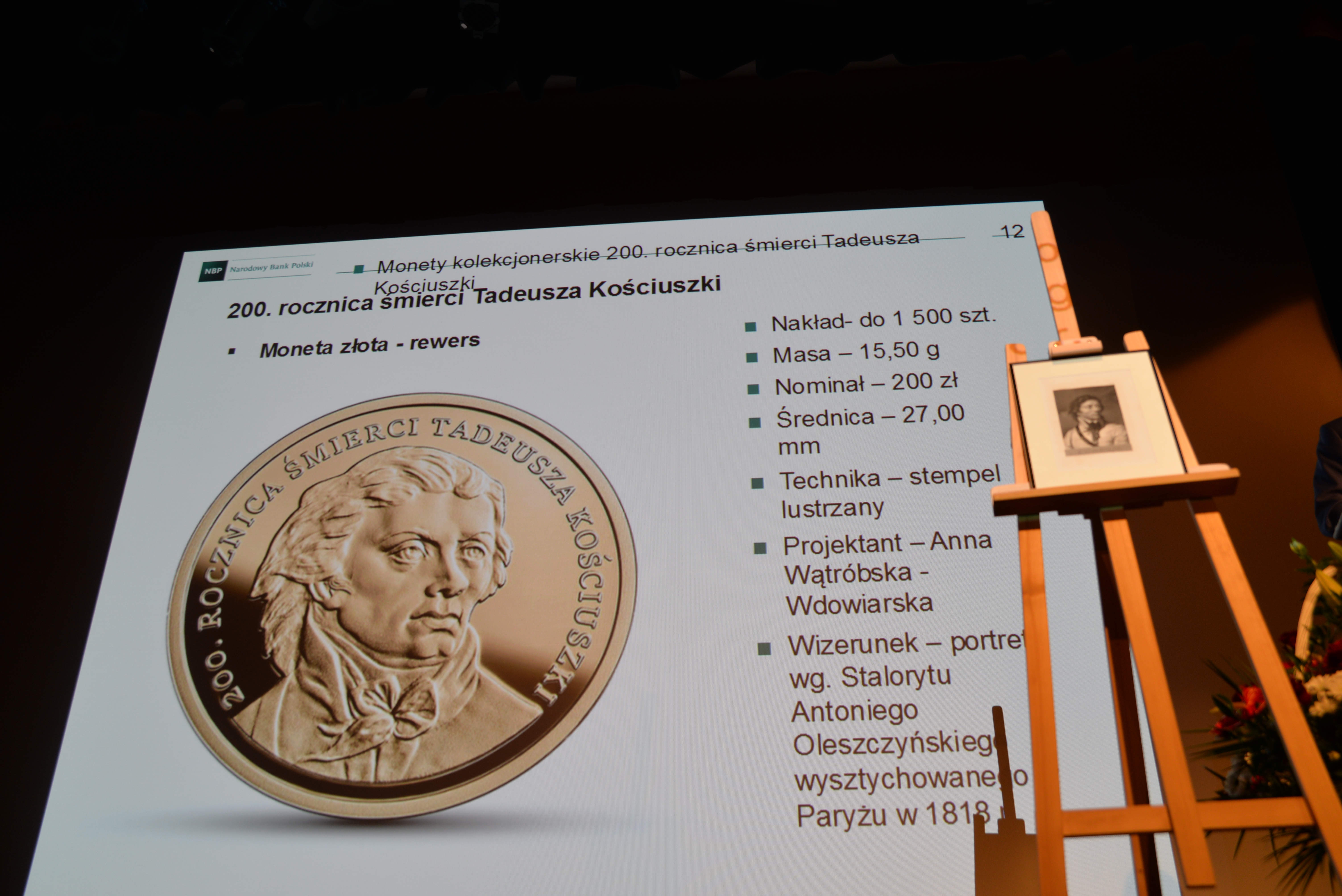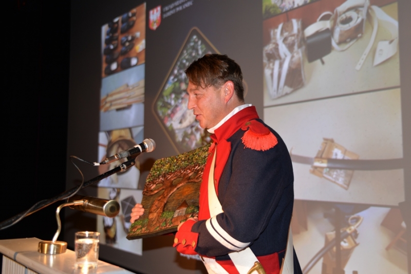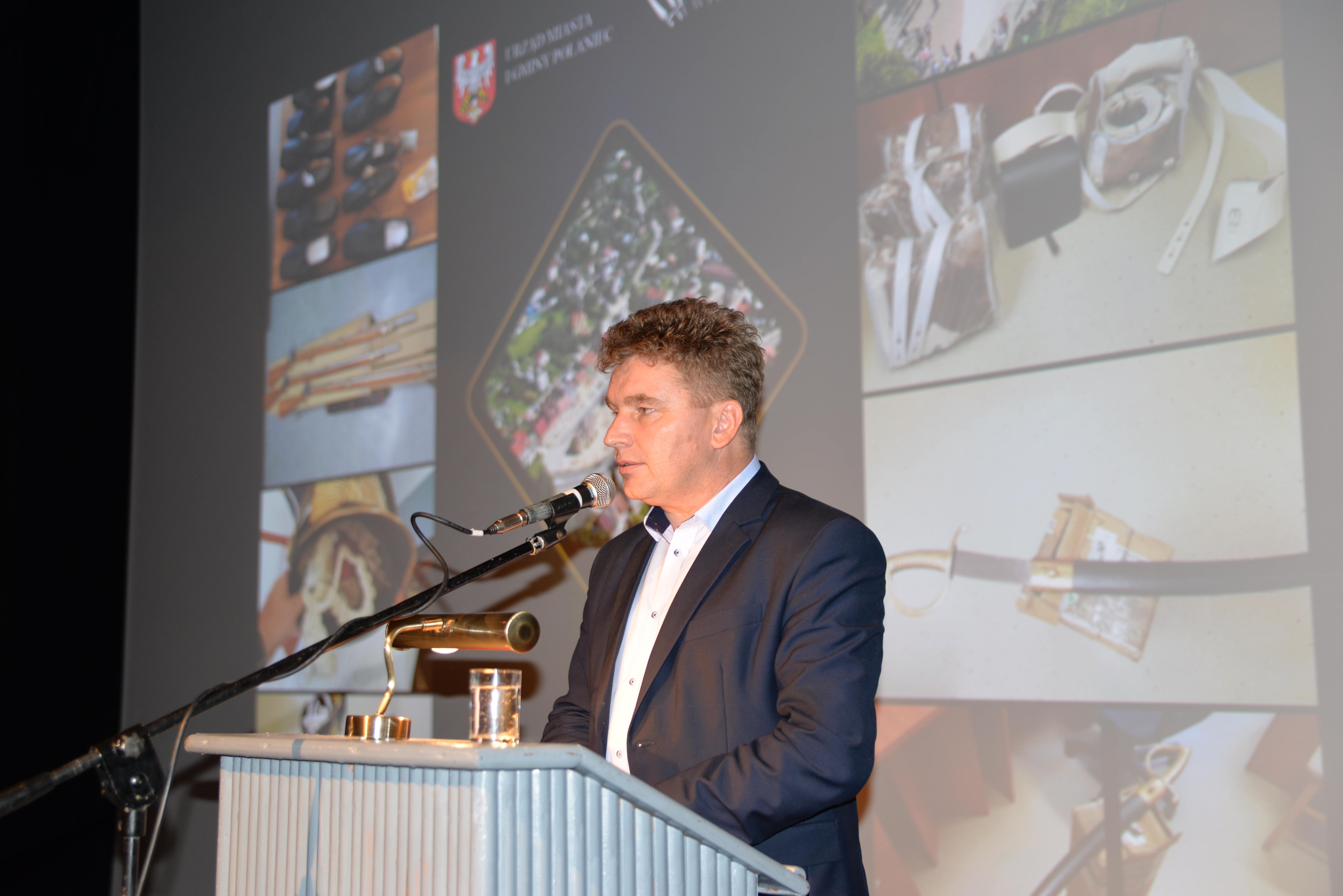 Pamiątkowe monety od dyrektora Oddziału NBP w Kielcach Grzegorza Kłaczkiewicza otrzymali: Burmistrz Połańca Jacek Tarnowski (syn założyciela Towarzystwa Kościuszkowskiego), Lech Żak – Prezes Zarządu ENEA Elektrownia Połaniec SA (największego zakładu wspierającego zawsze nasze stowarzyszenie, Mieczysław Machulak (prezes TK w latach 1999-2007), Radosław Matusiewicz (obecny prezes TK), Konstanty Michorowski (najstarszy „czynny kosynier”, który tym samym powiększył swoją kolekcję numizmatyczną) oraz Towarzystwo Kościuszkowskie (do dyspozycji organizacji). Na zakończenie Towarzystwo Kościuszkowskie otrzymało wiele wspaniałych prezentów i usłyszało mnóstwo ciepłych słów. Burmistrz Jacek Tarnowski dokonał też symbolicznego przekazania rekwizytów i umundurowania zakupionego dla Towarzystwa w ramach projektu „Miasto Kościuszki 2017”. Była też jedna, szczególna niespodzianka. Radosław Matusiewicz otrzymał od swoich Przyjaciół wspaniałą szablę, wzorowaną na oryginalnej „szabli Kościuszki”. Po przemówieniach i prezentach od naszych gości, wszyscy przeszli do Sali kawiarnianej, gdzie czekał niezwykły poczęstunek. Były nim potrawy przyrządzone według staropolskich przepisów, w oparciu o to, co jadał nasz Bohater. Była więc kasza jęczmienna z boczkiem, pierogi litewskie (ze słodką kapustą i mięsem), pierogi białoruski (z kaszą, serem, cebulą i okrasą), pampuchy z żurawiną, pampuchy z mięsem oraz przysmaki połanieckie (zwłaszcza niepowtarzalne Serdelki od Pana Kazimierza Zalińskiego). O tę przepyszną część imprezy zadbali Jerzy Stefaniak, a także panie z Góreckiego Stowarzyszenia Kobiet „Viktoria”. Jubileuszowi towarzyszyły też okolicznościowe wystawy. Pierwszą z nich pn. “30 lat utrwalania tradycji kościuszkowskich” – przygotowała połaniecka Biblioteka. Zaprezentowano na niej dorobek wydawniczy naszego stowarzyszenia, archiwalne artykuły z prasy o naszej działalności oraz kalendarium ważnych wydarzeń z historii Towarzystwa. Druga to wystawa zdjęć realizowana w ramach projektu „Miasto Kościuszki 2017”, pokazująca najciekawsze działania przeprowadzone w bieżącym roku. Goście opuszczali Połaniec zadowoleni i najedzeni. Wszyscy podkreślali udział w uroczystościach grupy naszej wspaniałej młodzieży, w strojach kosynierskich. Takiej młodzieży zazdrości nam cała Polska.