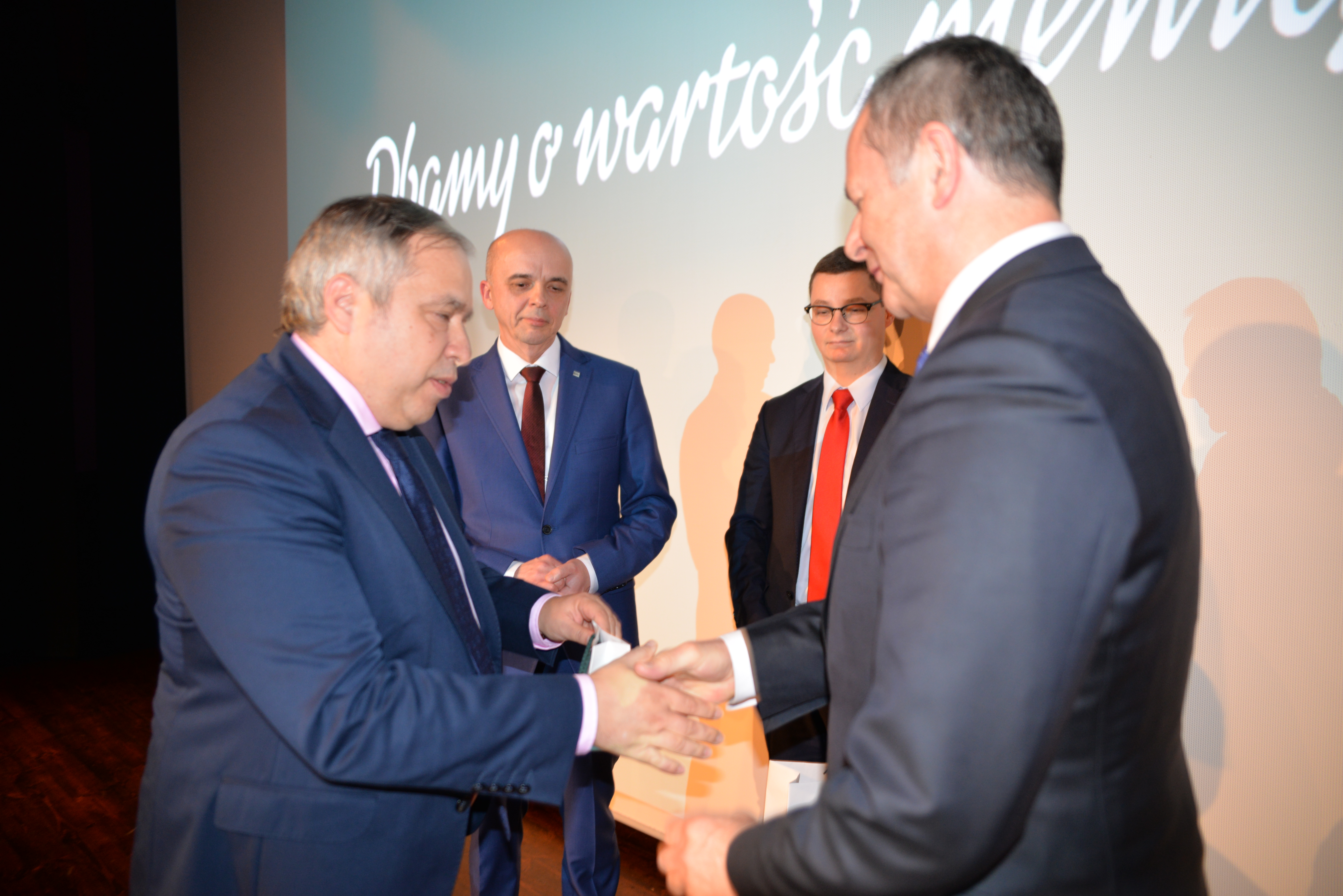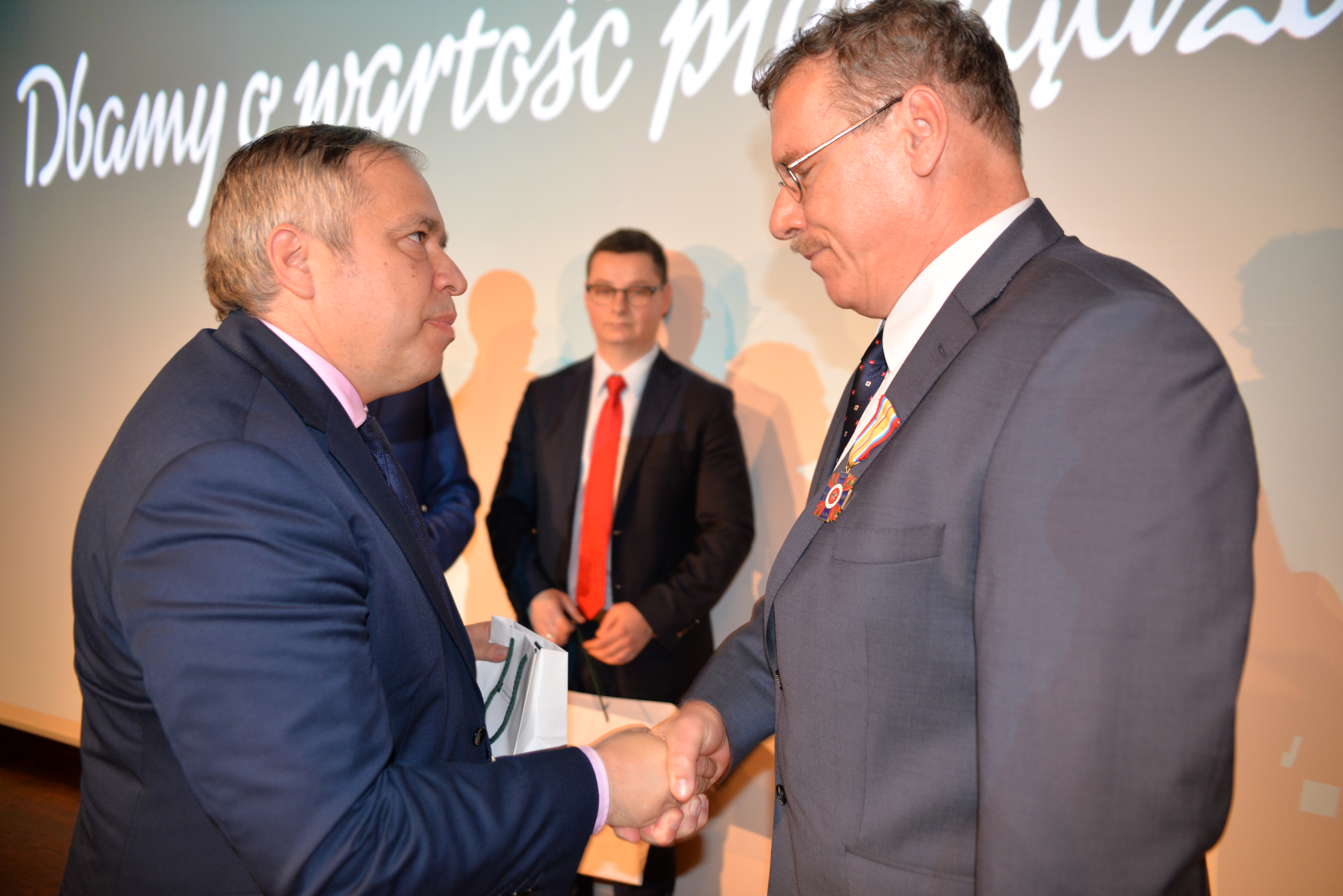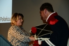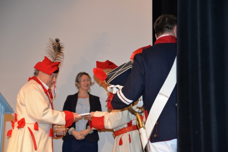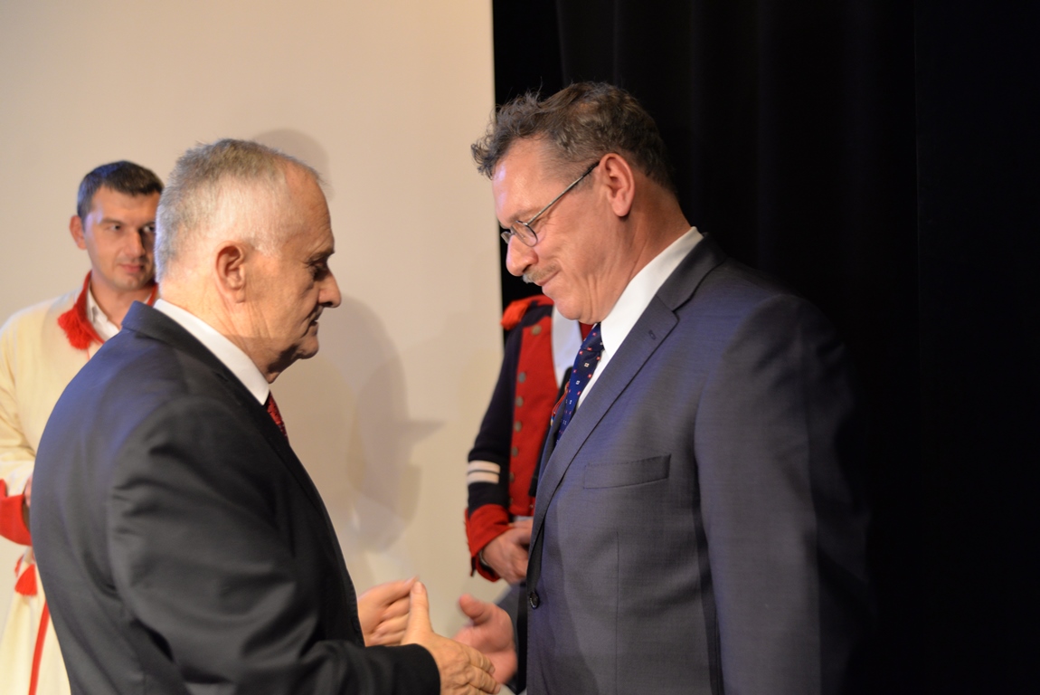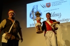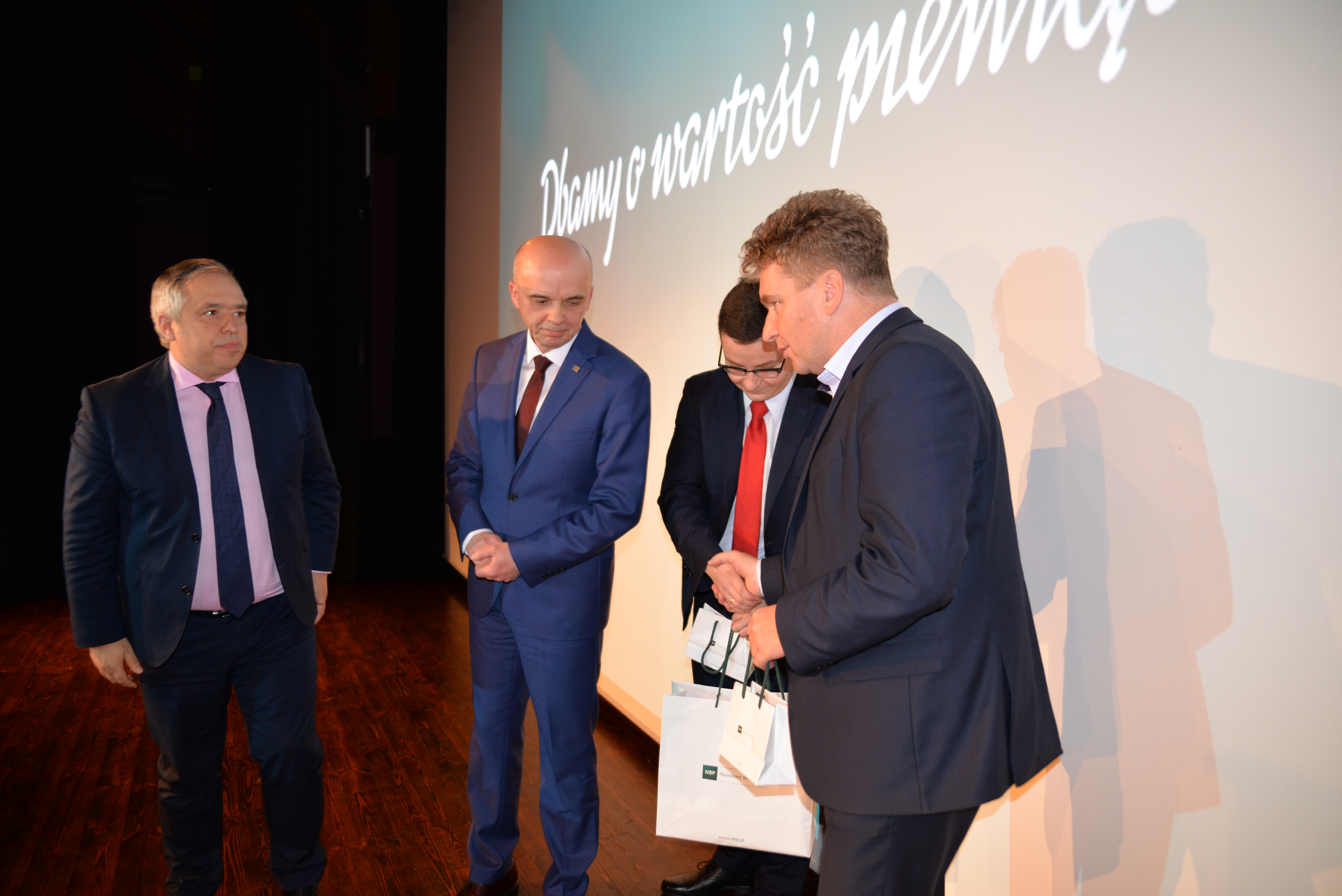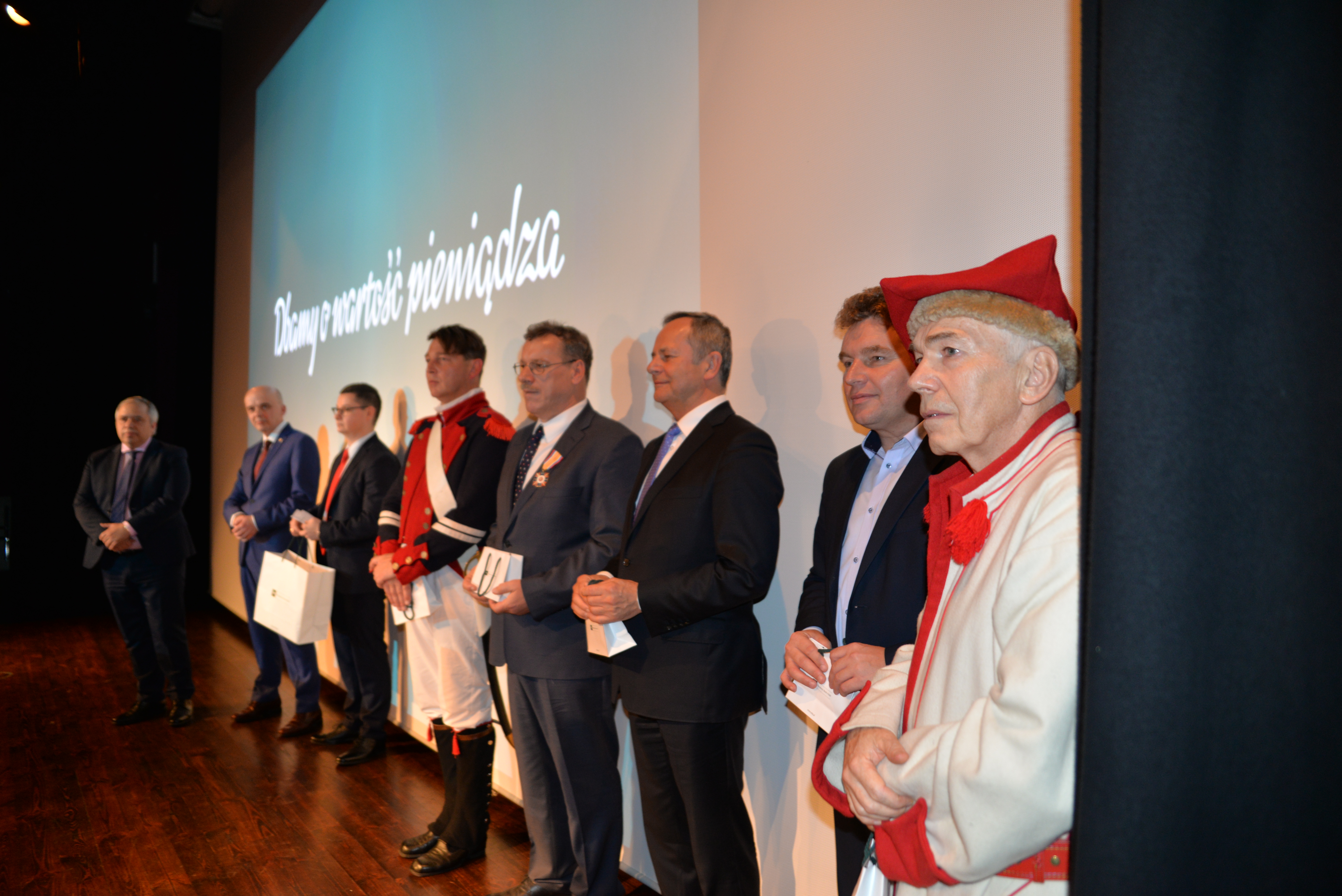 Pamiątkowe monety od dyrektora Oddziału NBP w Kielcach Grzegorza Kłaczkiewicza otrzymali: Burmistrz Połańca Jacek Tarnowski (syn założyciela Towarzystwa Kościuszkowskiego), Lech Żak – Prezes Zarządu ENEA Elektrownia Połaniec SA (największego zakładu wspierającego zawsze nasze stowarzyszenie, Mieczysław Machulak (prezes TK w latach 1999-2007), Radosław Matusiewicz (obecny prezes TK), Konstanty Michorowski (najstarszy „czynny kosynier”, który tym samym powiększył swoją kolekcję numizmatyczną) oraz Towarzystwo Kościuszkowskie (do dyspozycji organizacji). Na zakończenie Towarzystwo Kościuszkowskie otrzymało wiele wspaniałych prezentów i usłyszało mnóstwo ciepłych słów. Burmistrz Jacek Tarnowski dokonał też symbolicznego przekazania rekwizytów i umundurowania zakupionego dla Towarzystwa w ramach projektu „Miasto Kościuszki 2017”. Była też jedna, szczególna niespodzianka. Radosław Matusiewicz otrzymał od swoich Przyjaciół wspaniałą szablę, wzorowaną na oryginalnej „szabli Kościuszki”. Po przemówieniach i prezentach od naszych gości, wszyscy przeszli do Sali kawiarnianej, gdzie czekał niezwykły poczęstunek. Były nim potrawy przyrządzone według staropolskich przepisów, w oparciu o to, co jadał nasz Bohater. Była więc kasza jęczmienna z boczkiem, pierogi litewskie (ze słodką kapustą i mięsem), pierogi białoruski (z kaszą, serem, cebulą i okrasą), pampuchy z żurawiną, pampuchy z mięsem oraz przysmaki połanieckie (zwłaszcza niepowtarzalne Serdelki od Pana Kazimierza Zalińskiego). O tę przepyszną część imprezy zadbali Jerzy Stefaniak, a także panie z Góreckiego Stowarzyszenia Kobiet „Viktoria”. Jubileuszowi towarzyszyły też okolicznościowe wystawy. Pierwszą z nich pn. “30 lat utrwalania tradycji kościuszkowskich” – przygotowała połaniecka Biblioteka. Zaprezentowano na niej dorobek wydawniczy naszego stowarzyszenia, archiwalne artykuły z prasy o naszej działalności oraz kalendarium ważnych wydarzeń z historii Towarzystwa. Druga to wystawa zdjęć realizowana w ramach projektu „Miasto Kościuszki 2017”, pokazująca najciekawsze działania przeprowadzone w bieżącym roku. Goście opuszczali Połaniec zadowoleni i najedzeni. Wszyscy podkreślali udział w uroczystościach grupy naszej wspaniałej młodzieży, w strojach kosynierskich. Takiej młodzieży zazdrości nam cała Polska.