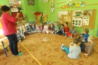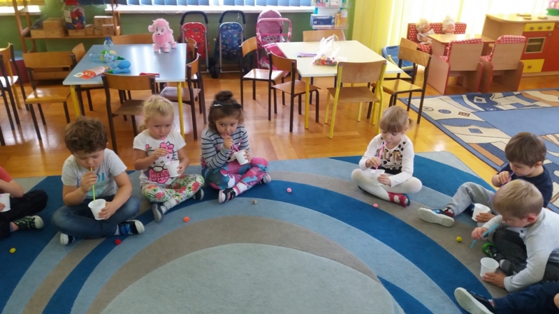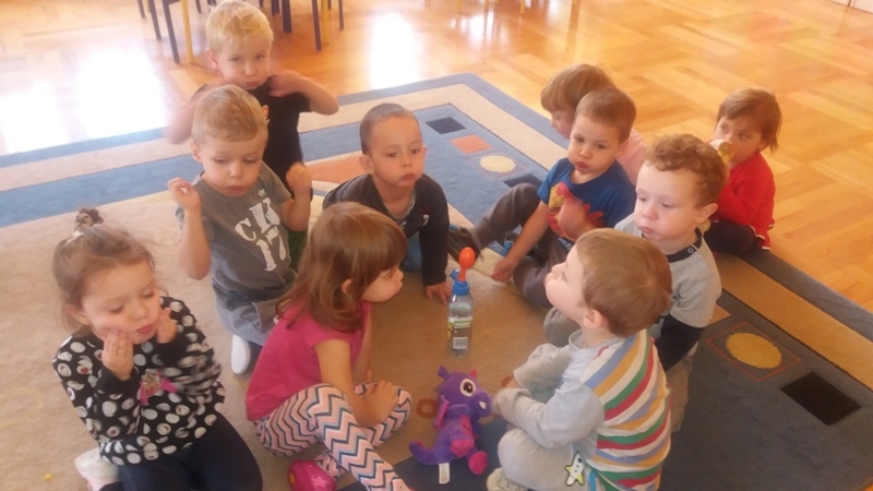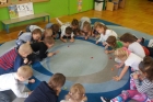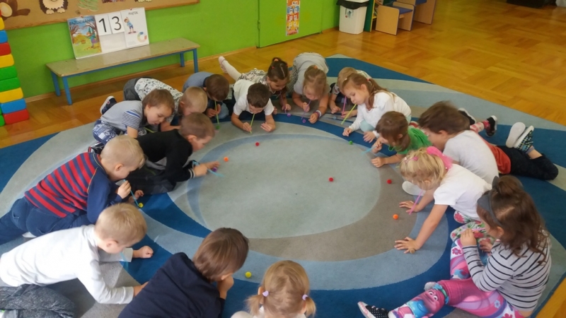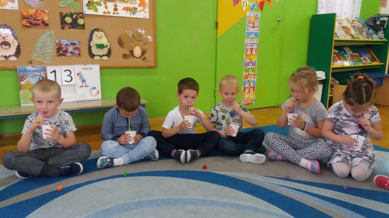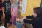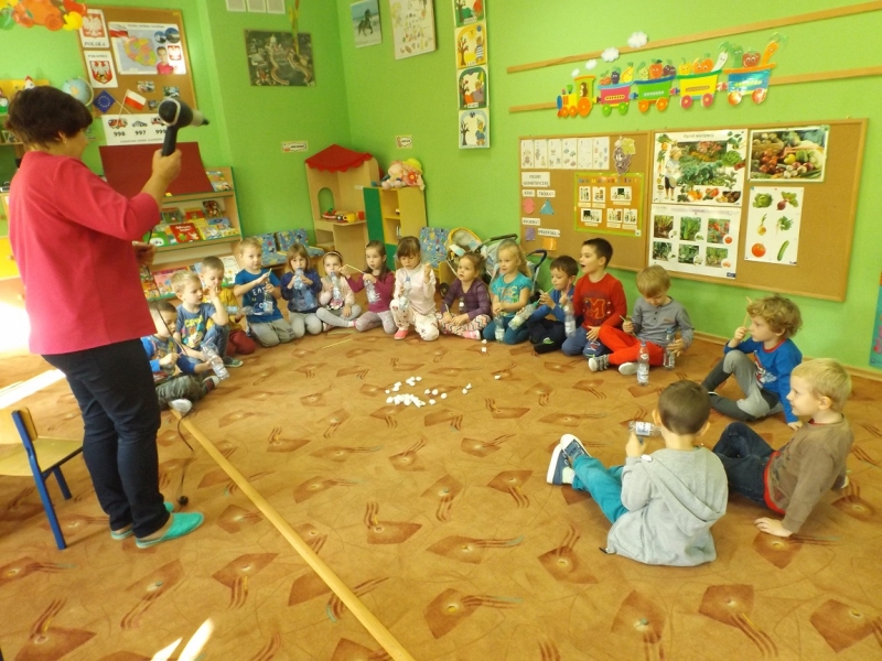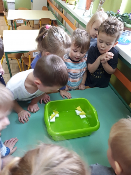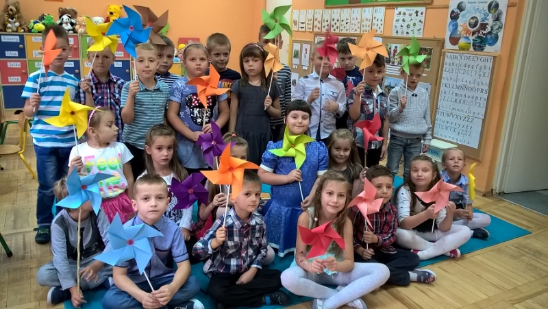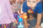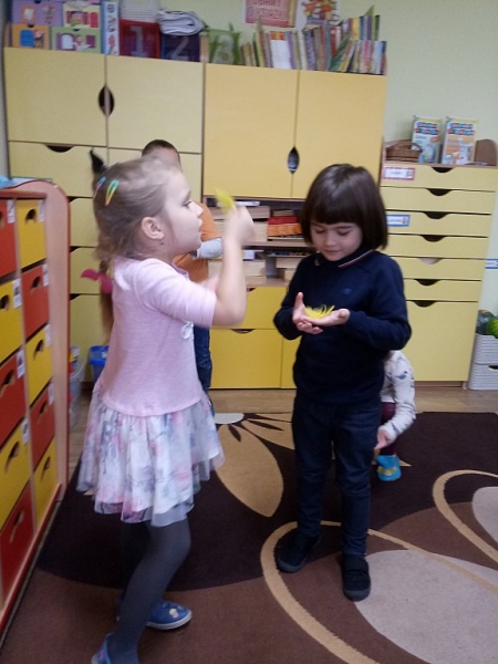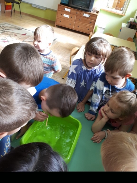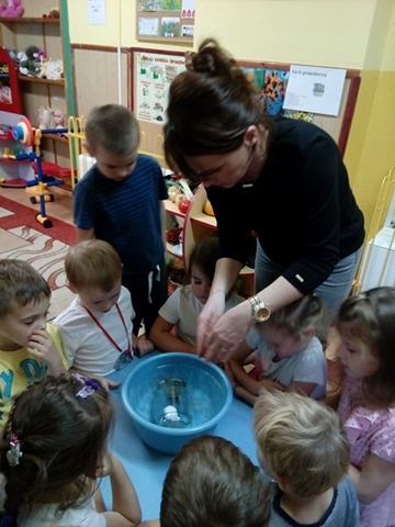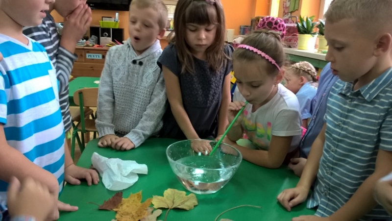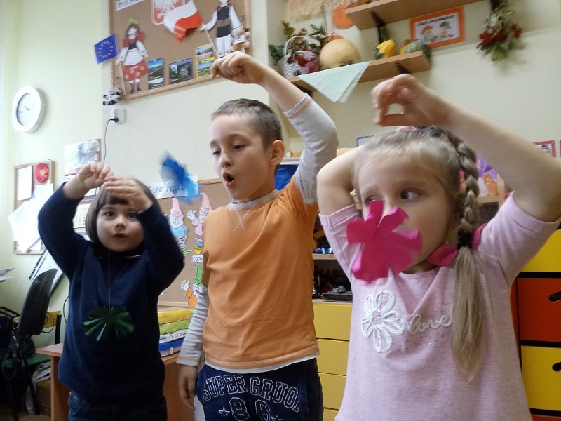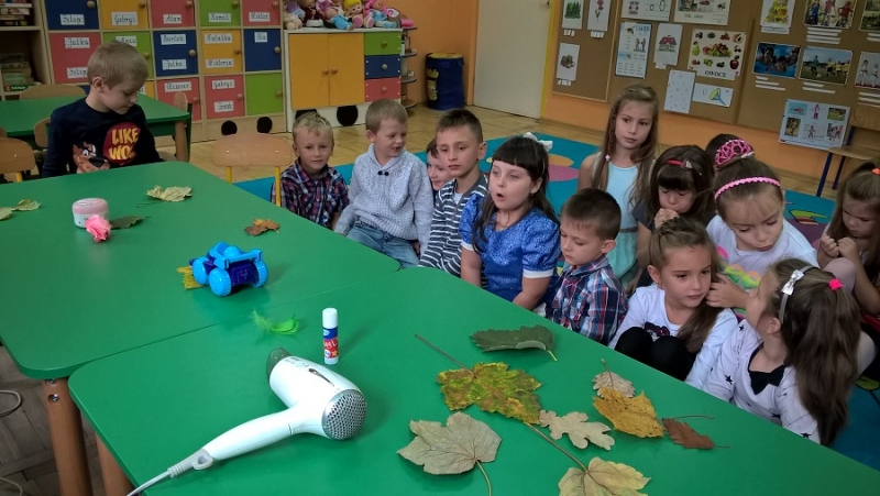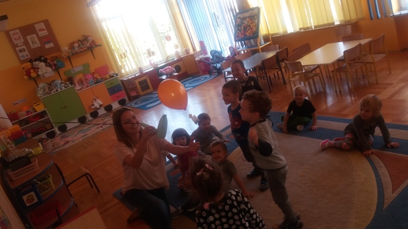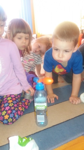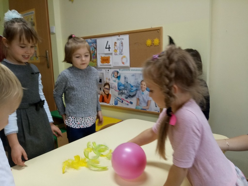 W ostatnim czasie Mali badacze mieli okazję przeprowadzać doświadczenia i eksperymenty z powietrzem i wiatrem. Na wstępie nauczyciele zapoznali dzieci z żywiołem, jakim jest powietrze. Przedszkolaki słuchały literatury dziecięcej np. L. J. Kern „Piotruś i powietrze”, „Jak Piotruś chciał być powietrzem”. Ułatwiło to przedstawienie dzieciom praktycznego wykorzystania powietrza przez człowieka. Wszyscy chętnie słuchali ciekawostek: „Dlaczego samoloty mają skrzydła?”, „Dlaczego balony unoszą się na ogrzanym powietrzu?” itp. Następnie dzieci z dużym zainteresowaniem i w skupieniu, pod czujnym okiem nauczycieli wykonały wiele doświadczeń, które pozwoliły odkryć niektóre właściwości powietrza. Sprawdzały „Gdzie jest powietrze?” oraz „Czy powietrze coś waży?”, odtwarzały dźwięki wiatru z użyciem różnego rodzaju pustych butelek. Same wprowadzały w ruch lekkie przedmioty (piórka, chusteczki, piłeczki, kawałki bibuły) dmuchając na nie. Dużo radości sprawiła dzieciom zabawa „Balony odrzutowe” – puszczanie nadmuchanych ale nie zawiązanych balonów. Obserwowały jak powietrze wylatuje z balonów i powoduje ich ruch. Mali badacze próbowali również napompować balon przy pomocy butelki i ciepłej wody. Podczas wykonywania doświadczeń pomocne okazały się urządzenia elektryczne: wiatrak i suszarka do włosów. Dzięki nim dzieci zaobserwowały, że podmuch powoduje przesunięcie lekkich przedmiotów jak pióro czy piłeczka pingpongowa.