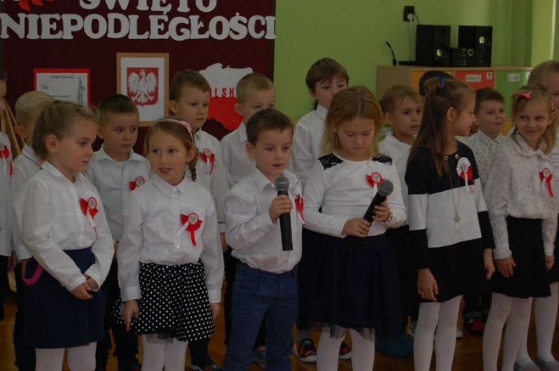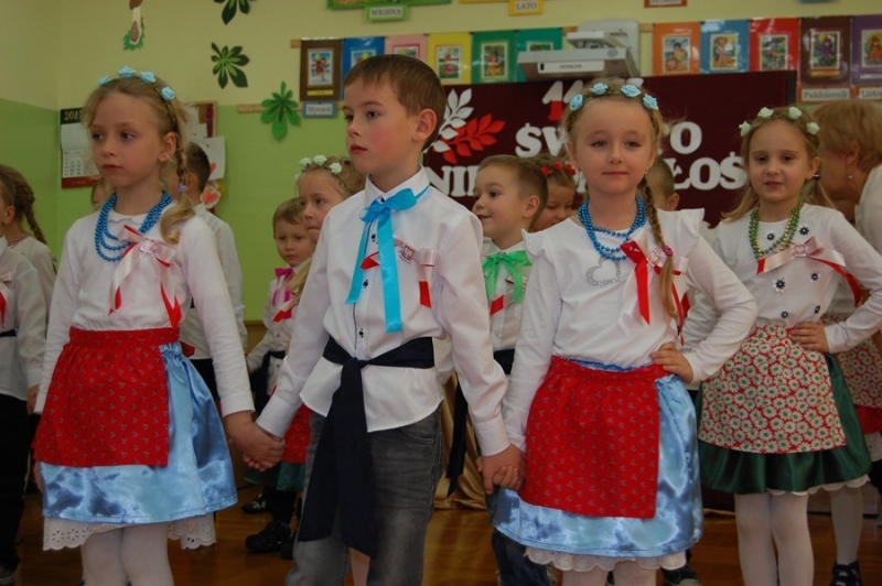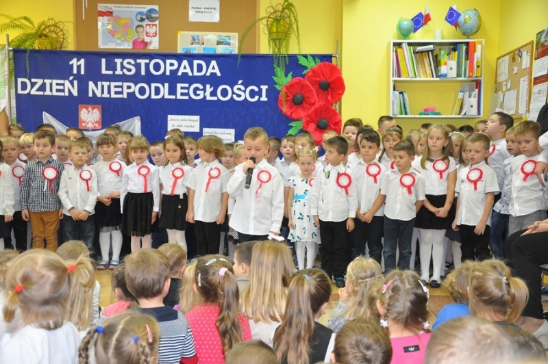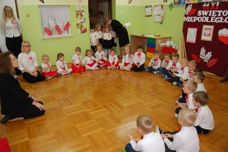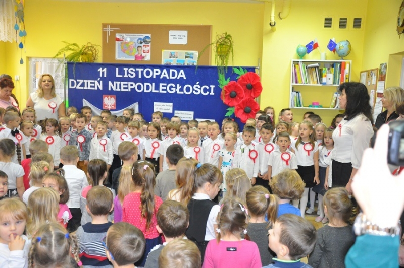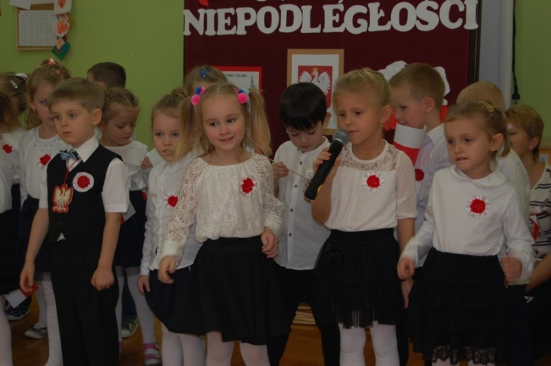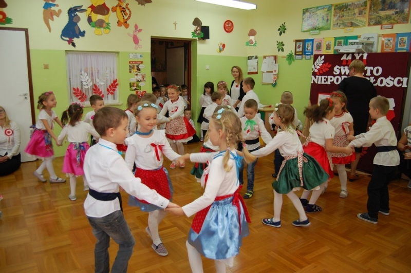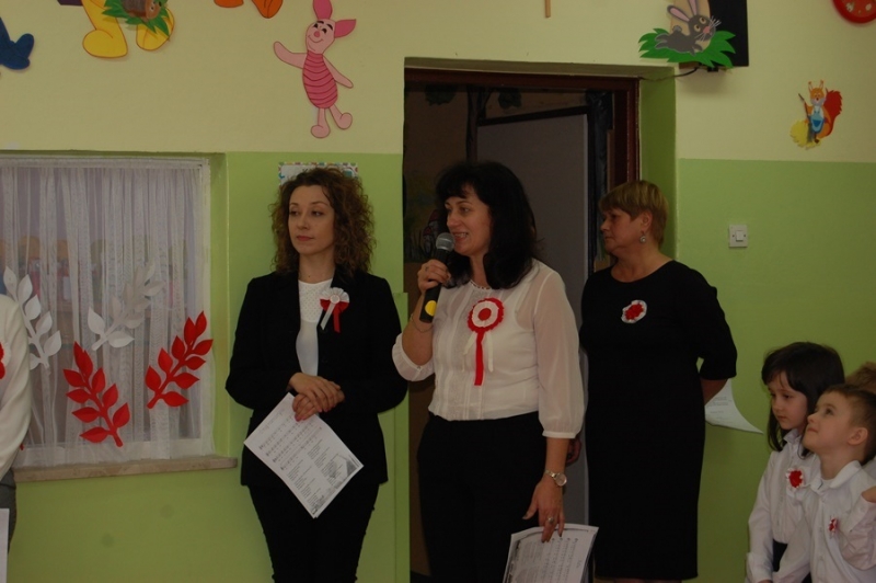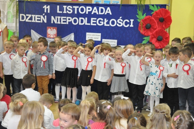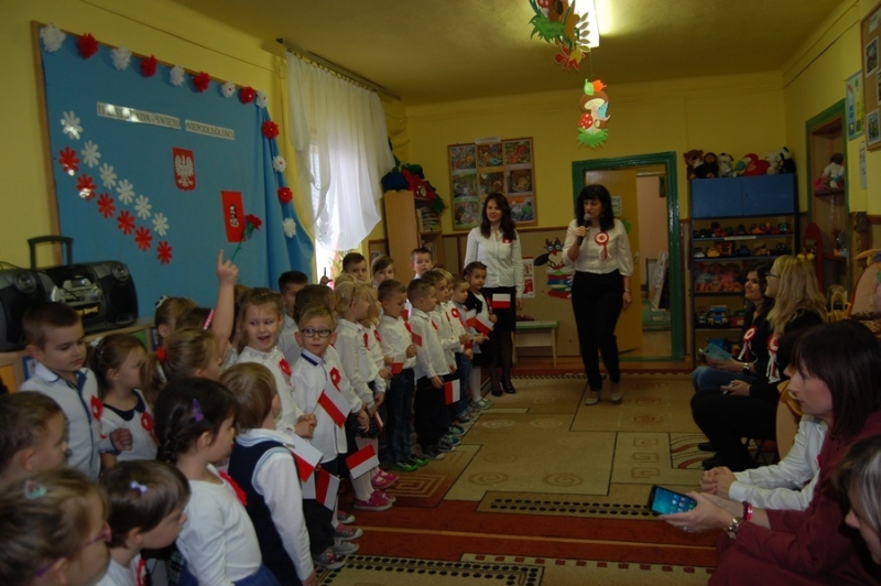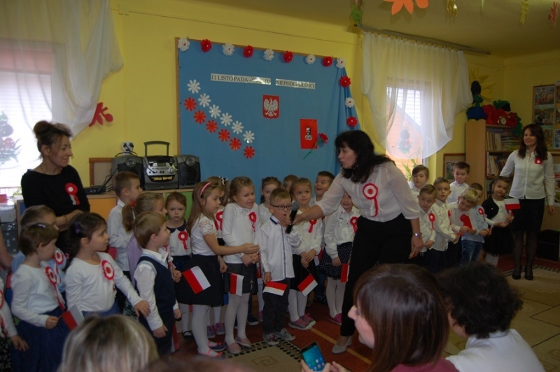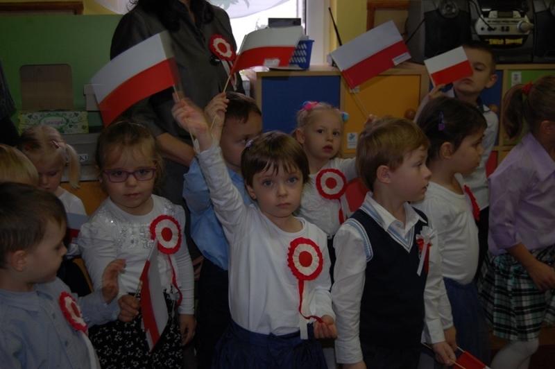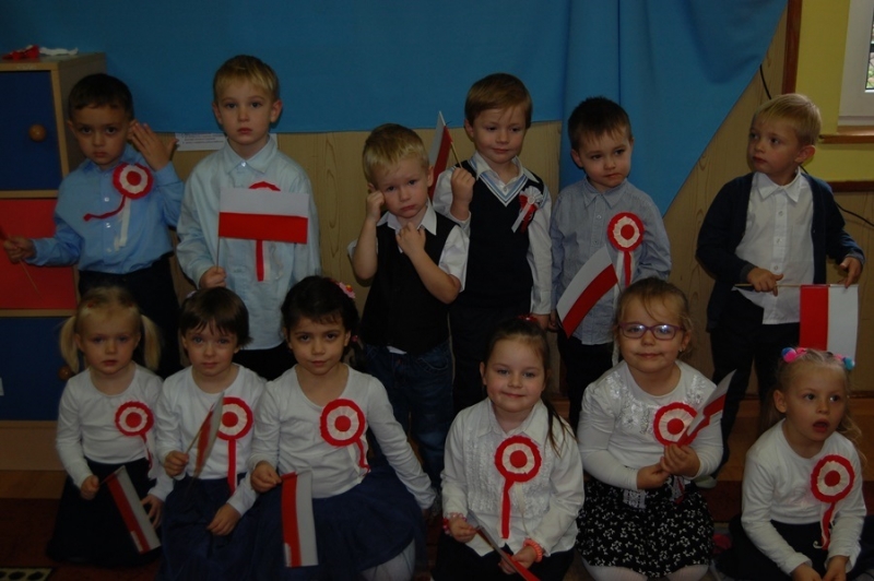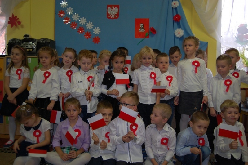 Serca biły mocno, w oku łza błysnęła, głos się czasem łamał, gdy po całym przedszkolu rozbrzmiewał „Mazurek Dąbrowskiego” zaintonowany przez Panią Dyrektor Annę Kaniszewską, a wszystkie dzieci - maluszki, starszaki - na baczność stali i nasz Ojczysty Hymn śpiewali.