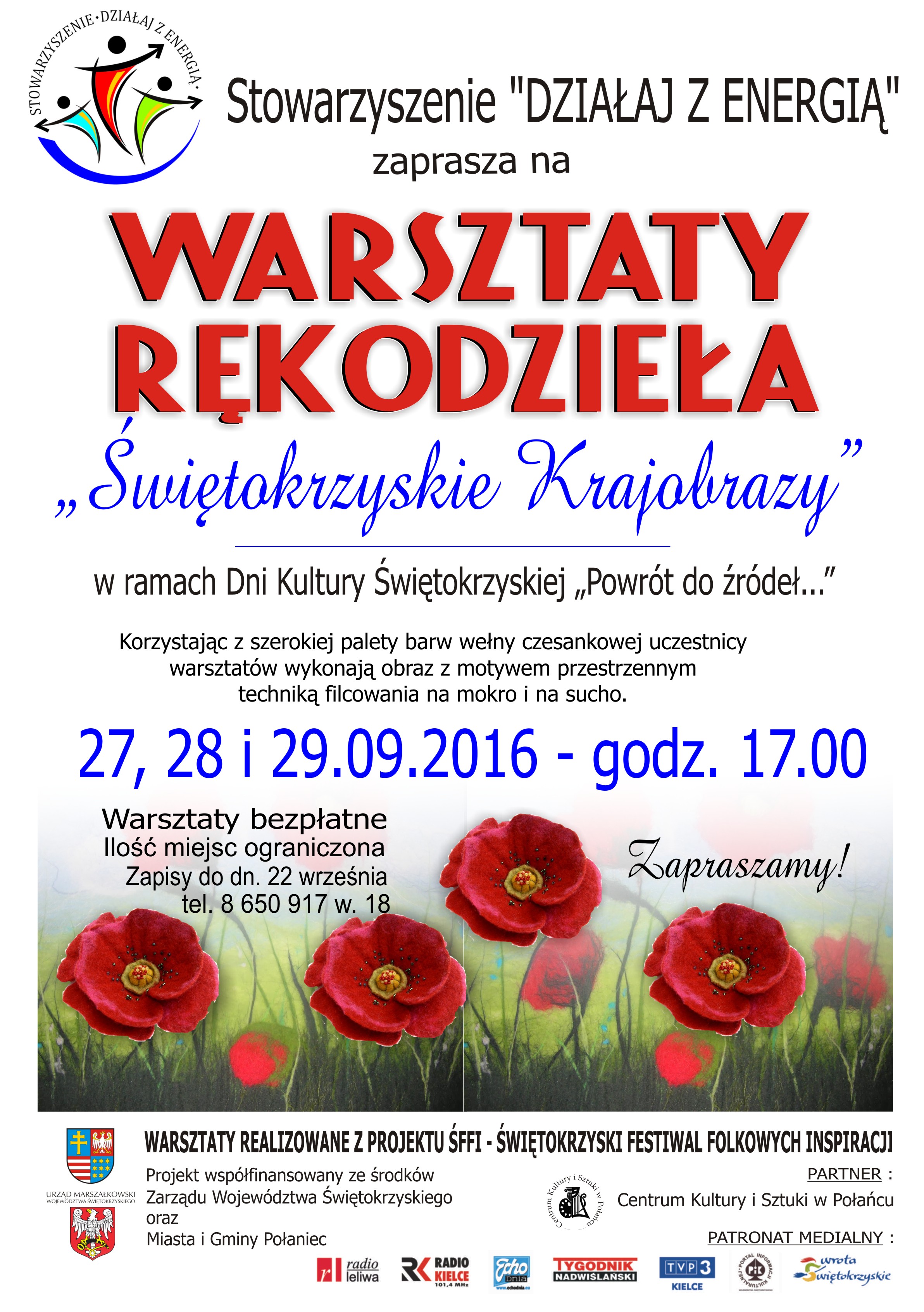 Stowarzyszenie "Działaj z Energią" z Połańca to grupa pasjonatów działających w lokalnym środowisku. Po sukcesie pierwszego zrealizowanego wspólnie projektu przyszedł czas na następne działania. 27 września ruszamy z kolejnym, tym razem artystycznym projektem. Zapraszamy do udziału w ŚFFI - Świętokrzyskim Festiwalu Folkowych Inspiracji w ramach Dni Kultury Połanieckiej "Powrót do źródeł". W dniach 27 - 29 września odbędą się w Centrum Kultury i Sztuki w Połańcu pierwsze bezpłatne warsztaty rękodzieła artystycznego. Efekt warsztatów to wspaniałe "Świętokrzyskie Krajobrazy" z wełny czesankowej filcowane na mokro i sucho.