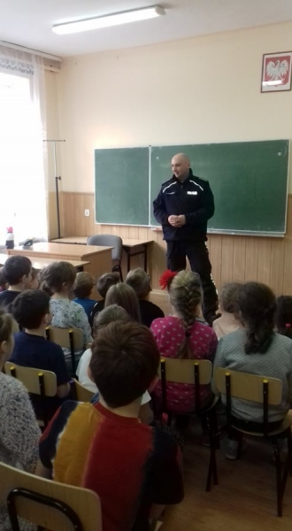 Dbając o bezpieczeństwo naszych dzieci w czasie wolnym od zajęć dydaktycznych w dniu 5.02.2018r. odbyło się spotkanie profilaktyczno-edukacyjne z udziałem przedstawiciela Policji, pana Sławomira Młodzińskiego w Szkole w Zrębinie.
