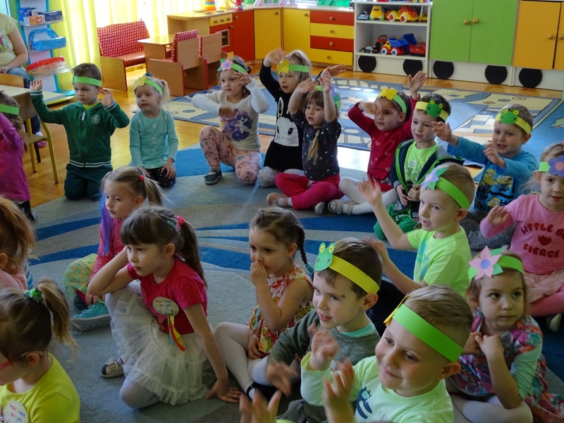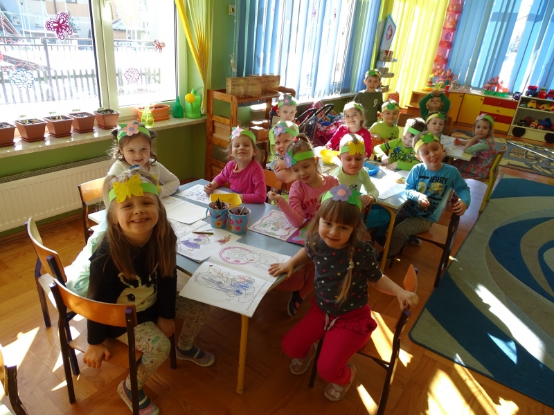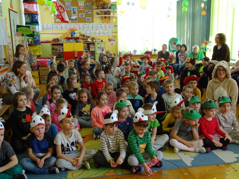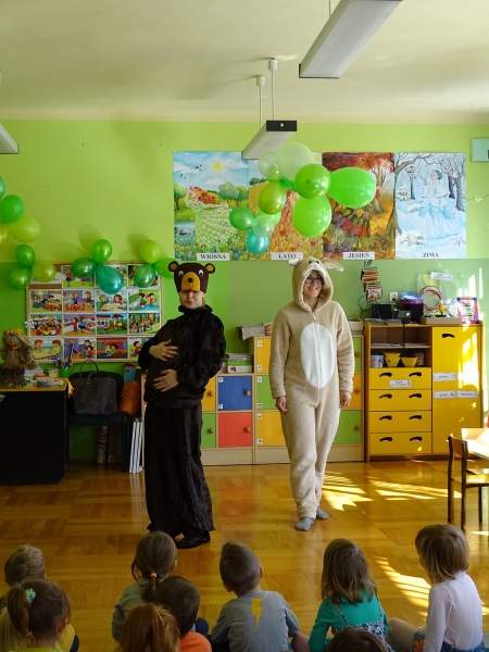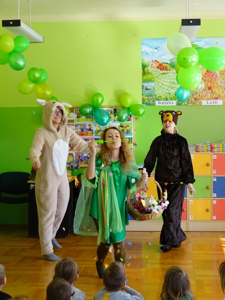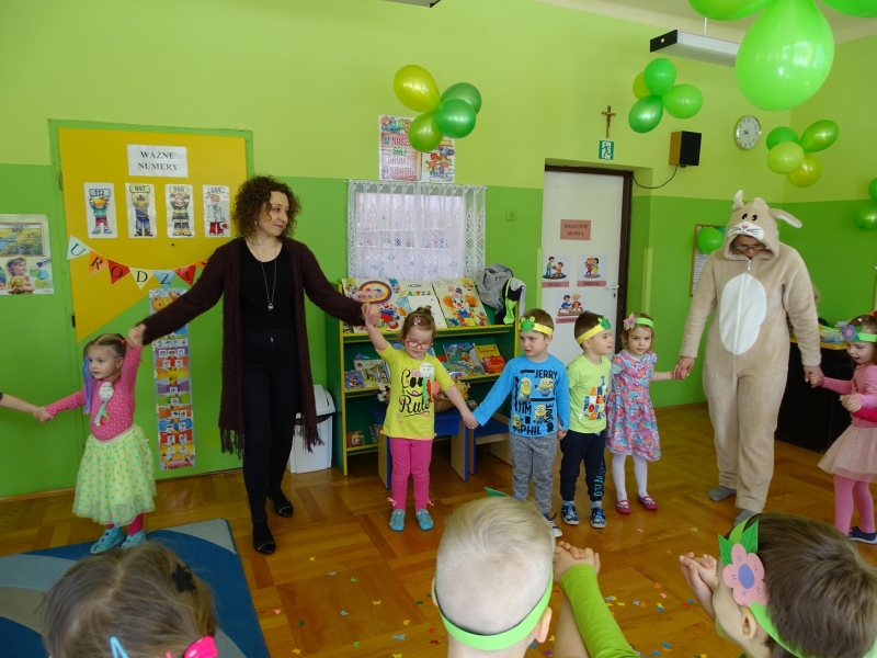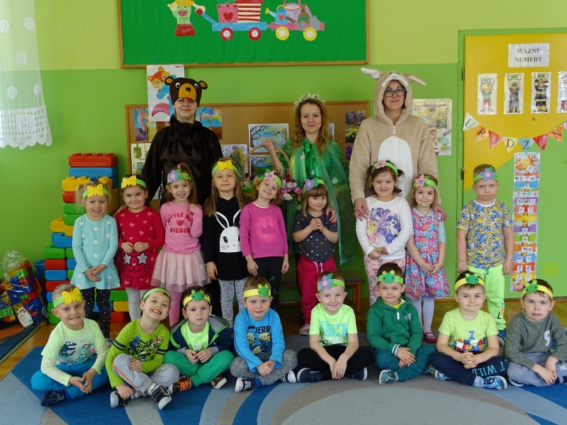 Wraz z przedszkolakami, wiosnę witały także zwierzątka: zajączek i niedźwiadek, którym tez znudziła się zima i z niecierpliwością czekają na słoneczko. Po wspólnym powitaniu wiosny nadszedł czas na zabawy, konkursy oraz wiosenne prace plastyczne na salach. Pani Wiosna, która do nas przyszła była zachwycona. Mamy nadzieję, że zostanie z nami na dobre dając nam wszystkim, słoneczne i ciepłe dni oraz zazieleni drzewa i trawy. Wiosenna atmosfera udzieliła się wszystkim a radosne nastroje będą nam towarzyszyły jeszcze przez długi czas.