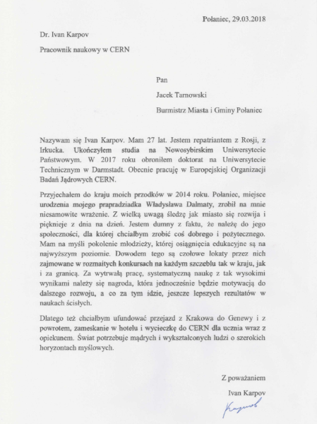 Podczas wizyty pan Ivan Karpov wyszedł z piękną inicjatywą w kierunku młodzieży wykazującej wybitne osiągnięcia i chęć docenienia osiągnięć edukacyjnych. Za wytrwałą pracę, systematyczną naukę z wysokimi wynikami w przedmiotach ścisłych popartą czołowymi lokatami jako nagrodę i motywację do dalszego rozwoju pan Ivan Karpov ufunduje wycieczkę do Genewy dla ucznia w wieku gimnazjalnym wykazującego wybitne osiągnięcia wraz z opiekunem. Pan Ivan obecnie pracuje w Europejskiej Organizacji Badań Jądrowych CERN. Podczas rozmowy mieliśmy okazję usłyszeć o tradycji, kulturze, świecie biznesu innych krajów. Nasz gość zadeklarował również promocję gospodarczą oferty terenów inwestycyjnych w Połańcu.