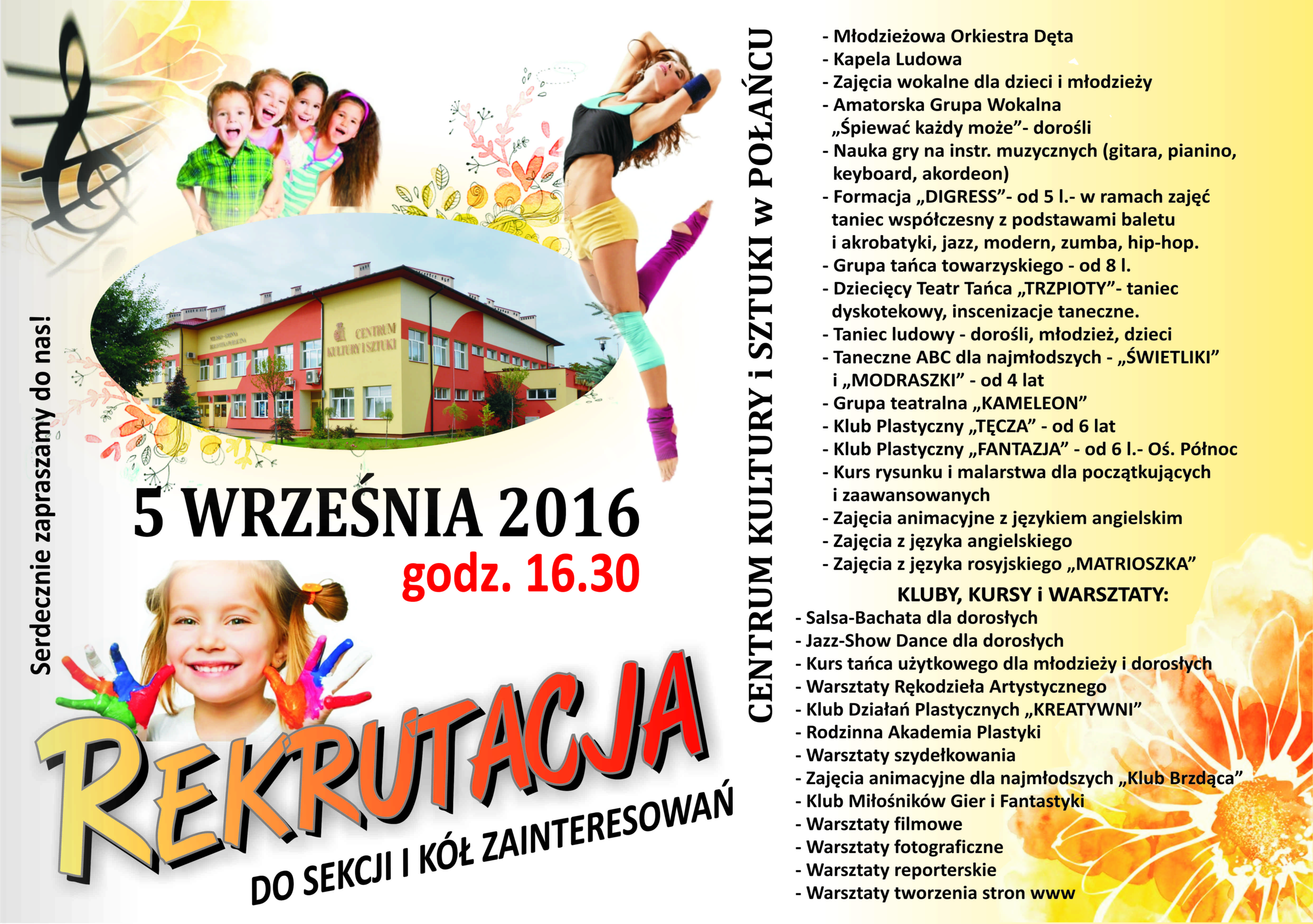5 września (poniedziałek) o godz. 16.30 w Centrum Kultury i Sztuki rusza nabór do sekcji kół i zainteresowań. Zapraszamy wszystkich zainteresowanych: dzieci, młodzież i dorosłych.