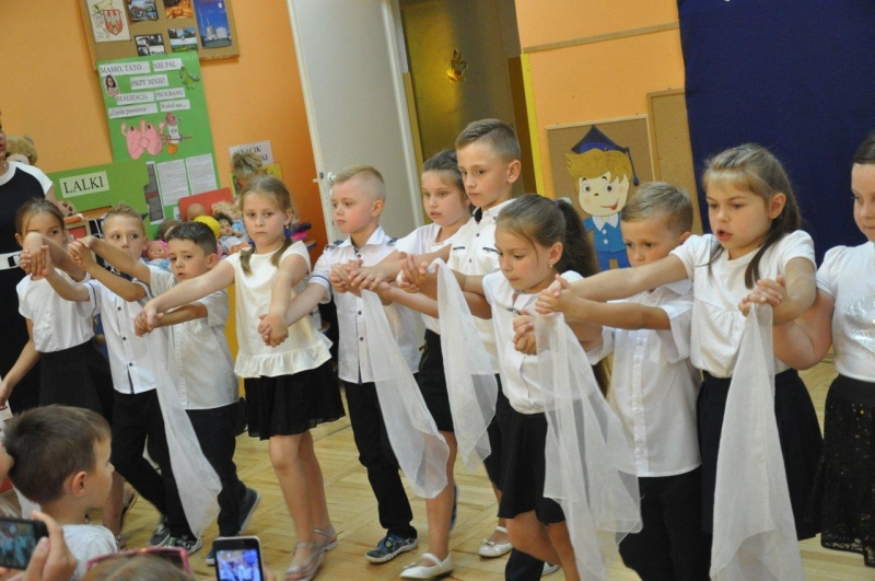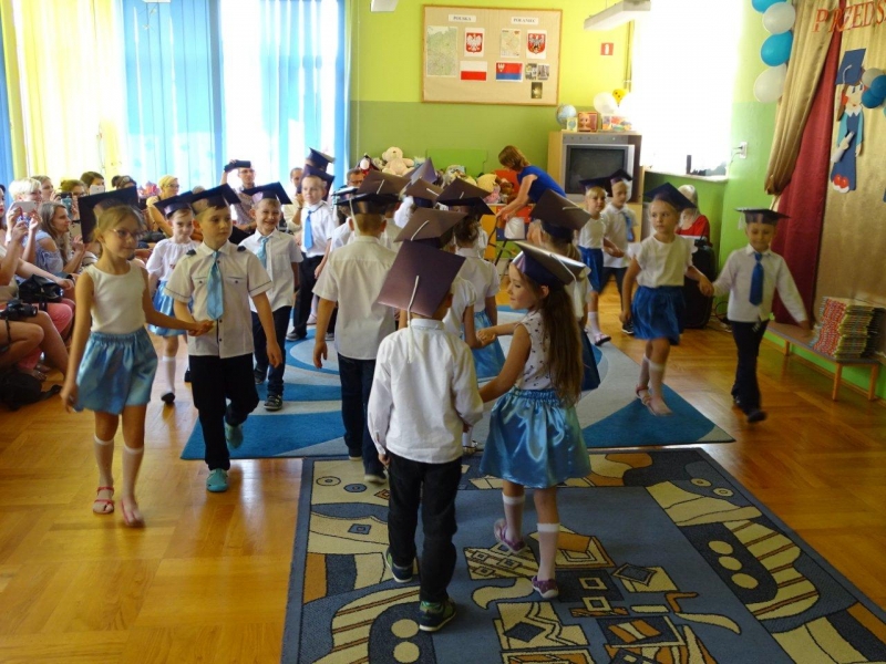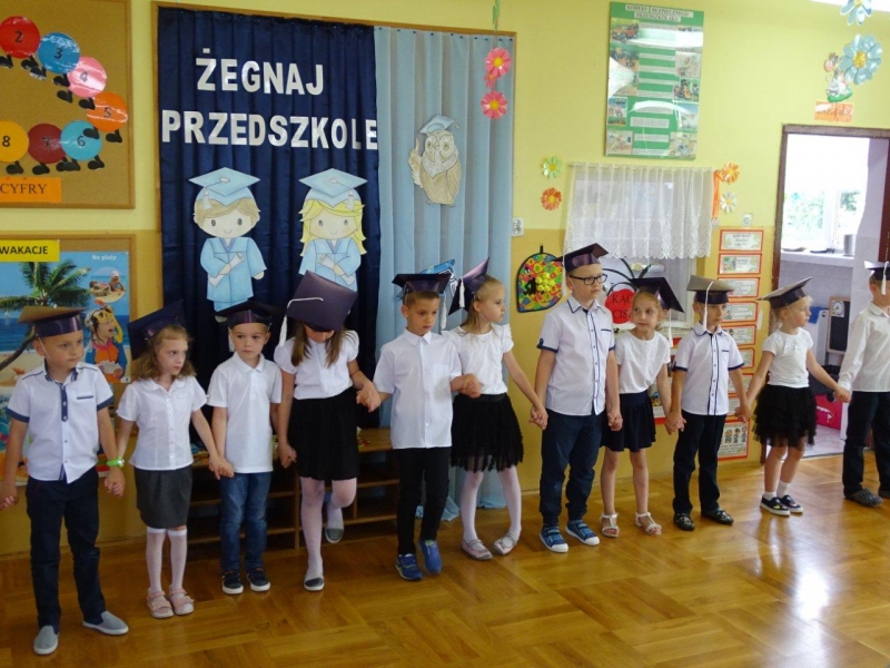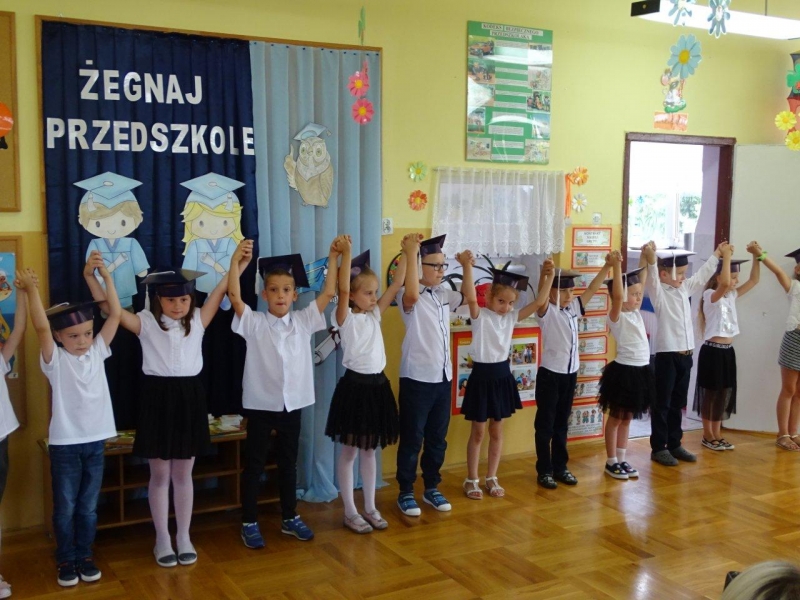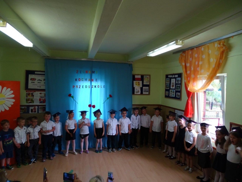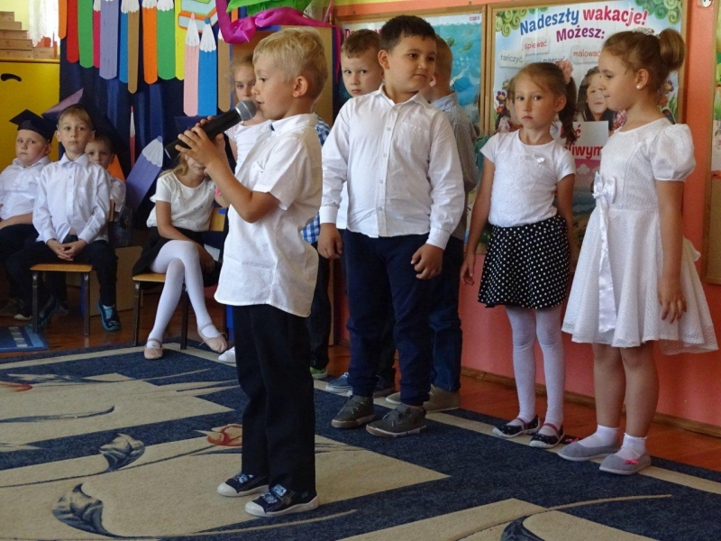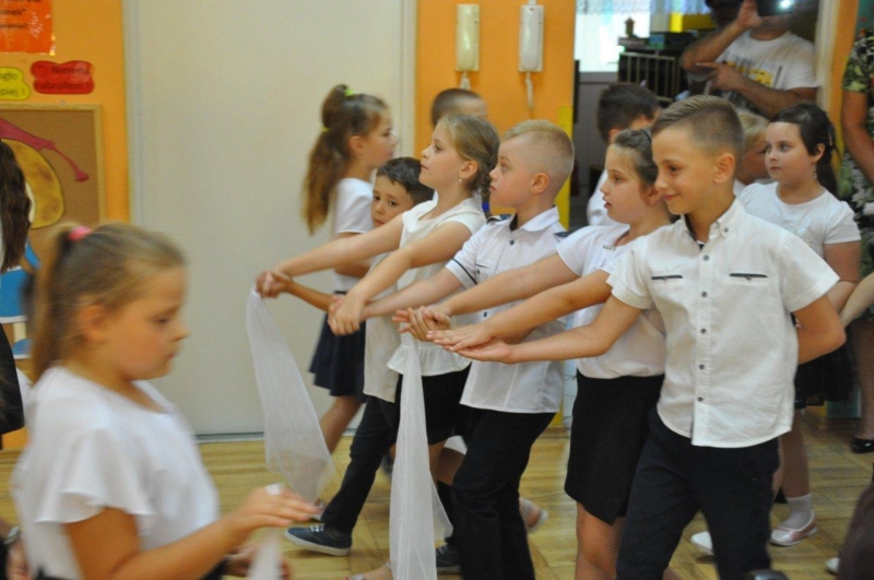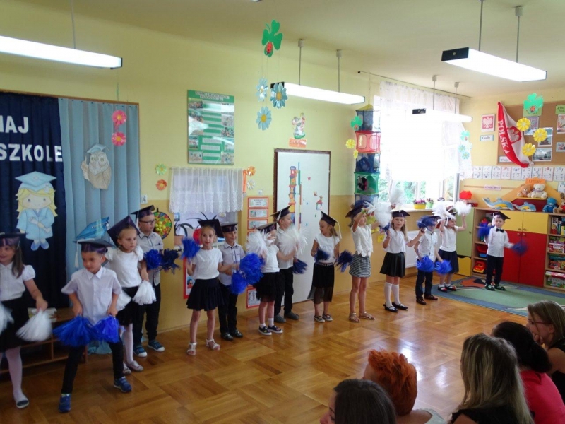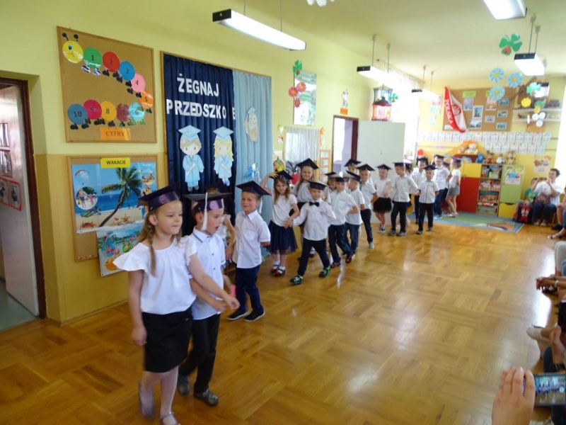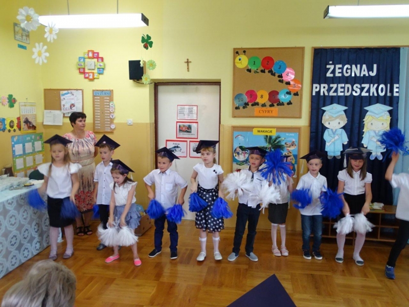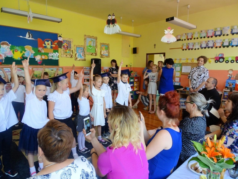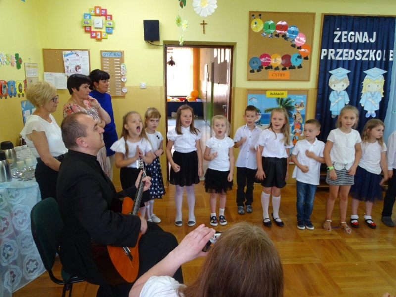 Szczególnymi gośćmi tego dnia byli Rodzice, Panie Dyrektorki, Nauczycielki oraz Ksiądz Wojtek. Programy artystyczne rozpoczęły się podniosłym polonezem, następnie recytując i śpiewając dzieci opowiadały o ważnych wydarzeniach z życia przedszkolnego, tęsknocie, ale i nowych zadaniach czekających ich w szkole. Dziękowały wychowawcom, dyrektorkom oraz wszystkim pracownikom przedszkola, z którymi przebywały w ciągu całego pobytu w przedszkolu. W każdej grupie odbył się też koncert piosenek religijnych przy akompaniamencie gitarowym Księdza Wojtka.