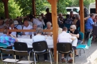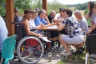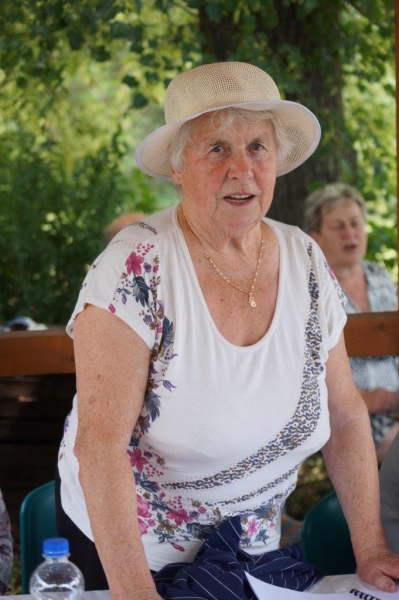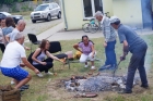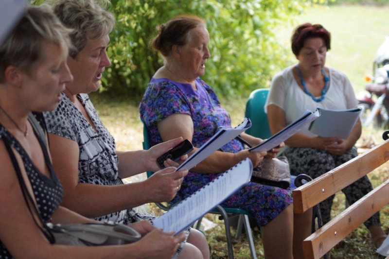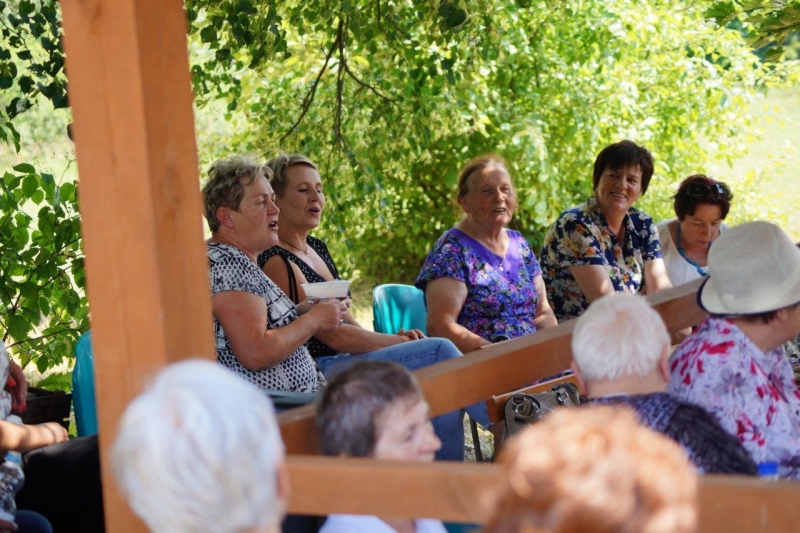 Później wyruszyliśmy do Świetlicy Środowiskowej w Życinach, gdzie czekało na nas rozpalone ognisko przez pracownika z tamtejszej Gminy, w którym piekły się ziemiaczki. Po atrakcjach zwiedzania każdy był już głodny, więc posililiśmy się kiełbaską z ogniska lub grila i mile spędzaliśmy czas w otoczeniu przyrody. Byli z nami również gospodarze: pani wójt, radna gmninna, ksiądz proboszcz, pan Dariusz Jóźwik. Mogliśmy także zetknąć się z tamtejszym oryginalnym folklorem a to dzięki obecności pań z Koła Gospodyń Wiejskich, które umilały czas śpiewem.