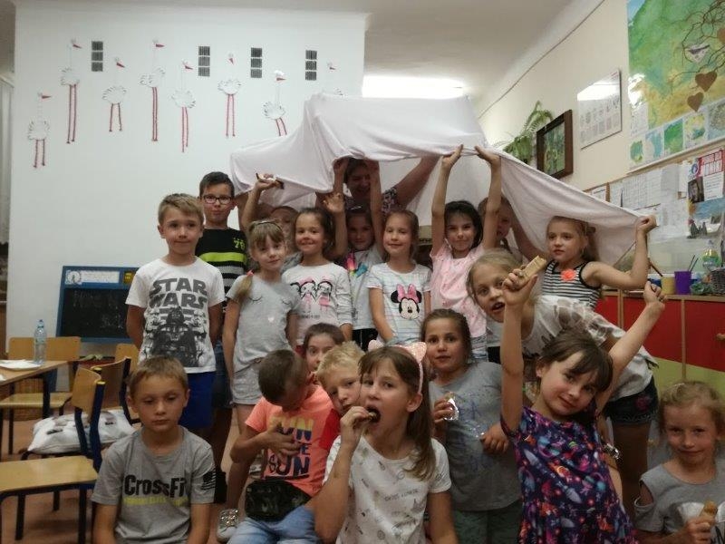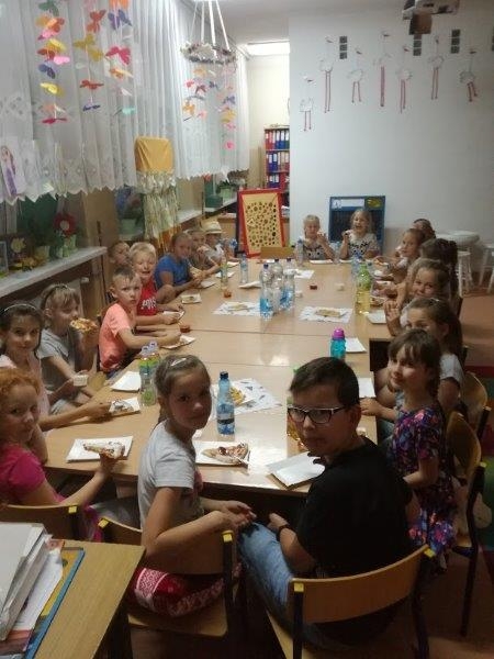 Z 8 na 9 czerwca w świetlicy szkolnej odbyło się "Czerwcowe nocowanie w szkole". Po przybyciu do szkoły uczniowie pożegnali się z rodzicami i udali do świetlicy, gdzie pozostawili swoje rzeczy. Pierwszym punktem programu były zabawy z chustą animacyjna na boisku szkolnym, następnie rozegraliśmy mecz w dwa ognie, po czym zadowoleni wróciliśmy do świetlicy. Tam w oczekiwaniu na kolację, którą miała być ulubiona pizza, graliśmy w kalambury, malowaliśmy wymarzone wakacje na dużym, szarym papierze. Nareszcie nadszedł czas kolacji. Wspólnie zasiedliśmy do stołu i zaczęliśmy ucztę. Nagle zgasło światło na korytarzu i z oddali słychać było jakieś straszne dźwięki. Naszą świetlicę nawiedził Duch. Jak się jednak okazało był to dobry duch świetlicy, który przyniósł dzieciom słodki upominek i życzył dobrej zabawy. Po kolacji przyszedł czas na podchody z latarkami. Zwycięską drużyna miała mieć przywilej wybrania filmu na seansie filmowym. W drodze losowania podzieliliśmy na dwie grupy. W szkole były pochowane zadania matematyczne, które trzeba było rozwiązać, aby dostać się dalej. Po drodze musieliśmy również odnaleźć 3 tulipany. Emocje towarzyszyły nam przez całą drogę. Szkołę oświetlały tylko nasze latarki. Zadania jak się później okazało były ukryte na stołówce, pod gabinetem pani dyrektor, w szatni, przy szkolnym pomniku Tadeusza Kościuszki. Wybraliśmy film pt. "Balerina", rozłożyliśmy nasze śpiwory, każdy znalazł miejsce dla siebie, przebraliśmy się w piżamy, umyliśmy zęby. Wpadliśmy jednak na pomysł, żeby jeszcze raz, na spokojnie zwiedzić szkołę z latarkami. Odwiedziliśmy część gimnazjalna, gdzie nikt z nas wcześniej nie był. Po zwiedzaniu udaliśmy się na film. Nadal pełni emocji zaczęliśmy oglądać film. Część z nas zasnęła od razu, a część obejrzała piękny film o spełnianiu marzeń do końca. Przespaliśmy spokojnie całą noc. O 6 była pobudka, zjedliśmy śniadanie, posprzątaliśmy nasze rzeczy i udaliśmy się przed szkołę, gdzie czekali na nas z utęsknieniem rodzice.