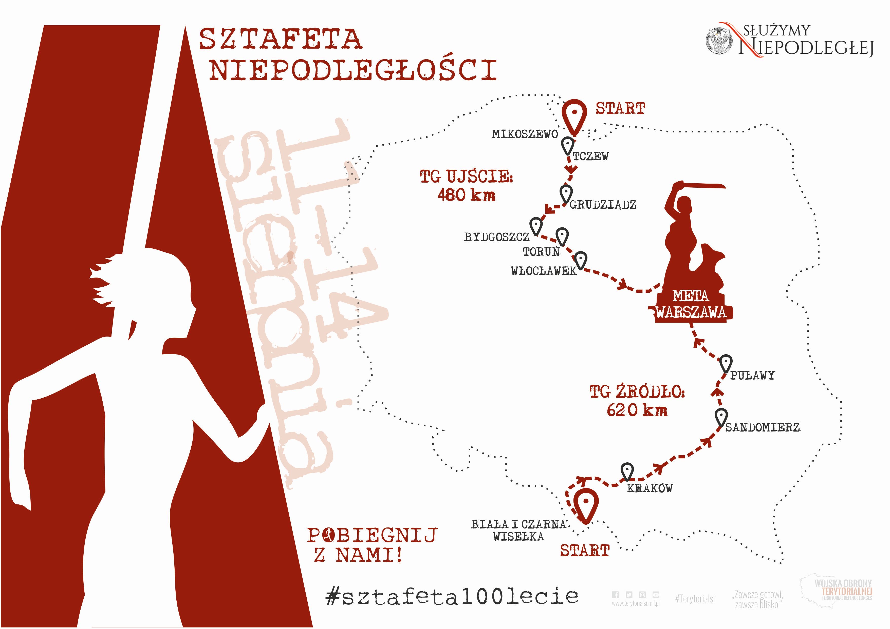 Dwa 24-osobowe zespoły złożone z żołnierzy i pracowników Wojsk Obrony Terytorialnej pobiegną w sztafecie niepodległości wzdłuż królowej polskich rzek. Startując ze źródeł i ujścia Wisły, po przebiegnięciu blisko 1 100 kilometrów zespoły spotkają się w Warszawie, by w ten sposób uczcić setną rocznicę odzyskania niepodległości.