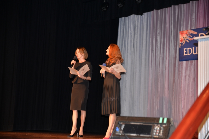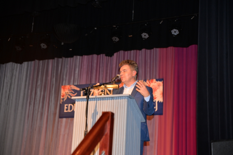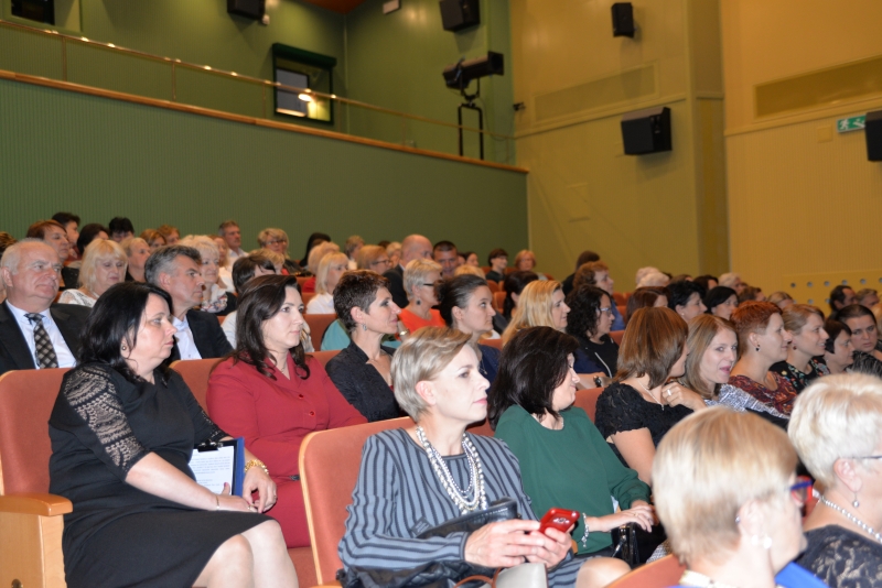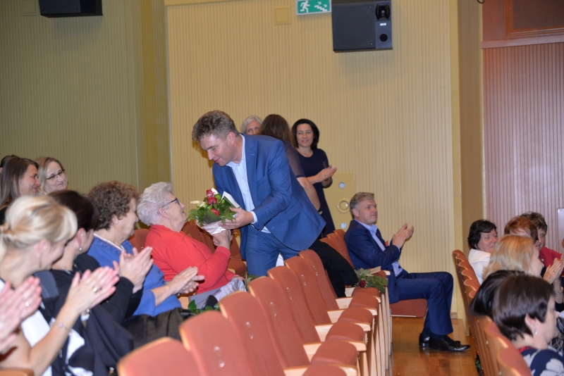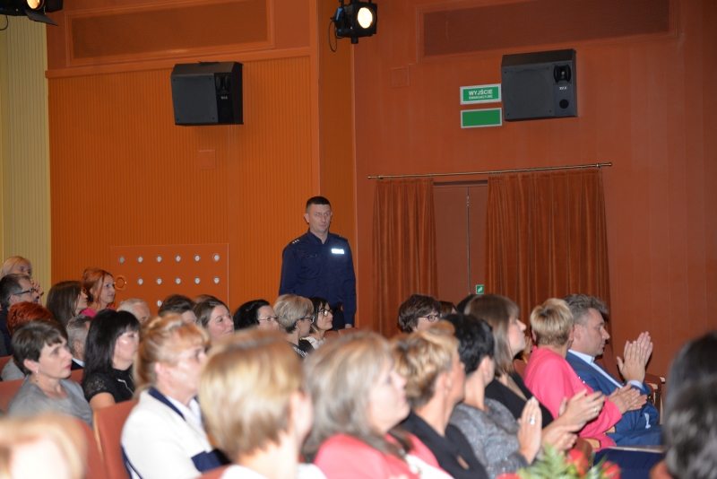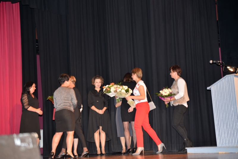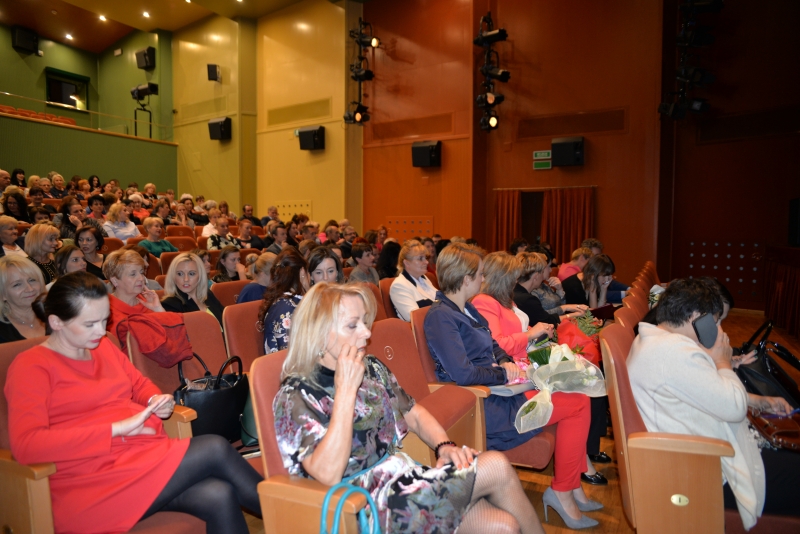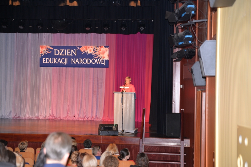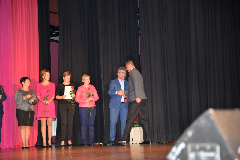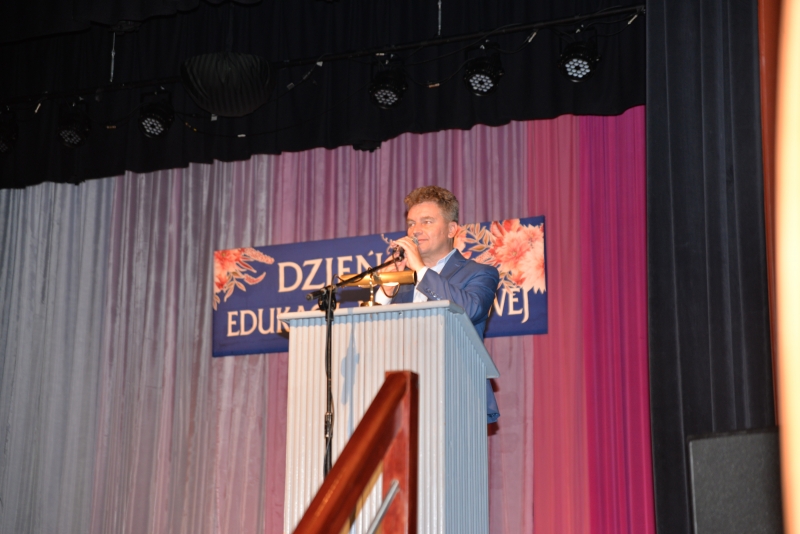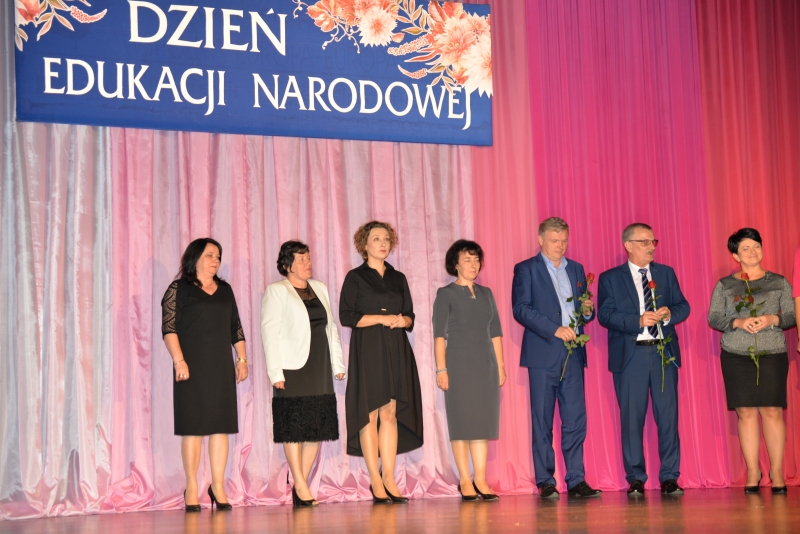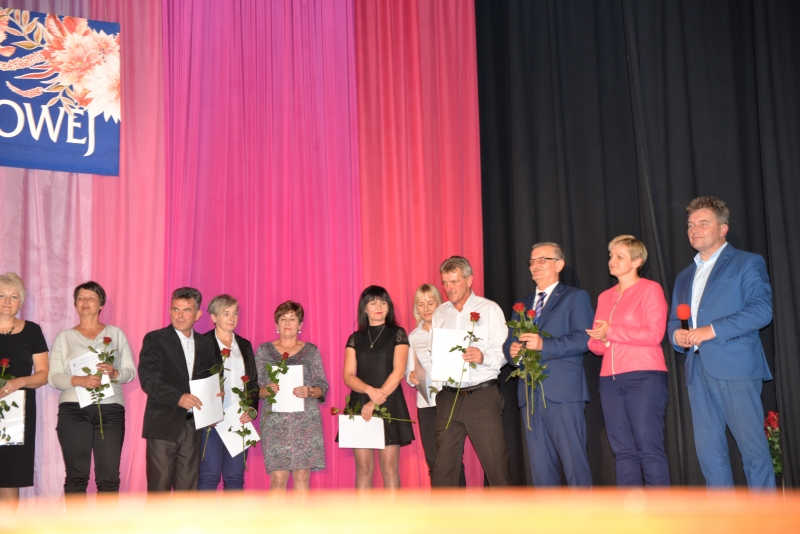 Nagrody swoim pracownikom przyznali również Dyrektorzy Szkół. Przy tej okazji Dyrektor Szkoły Podstawowej w Zrębinie, Pani Elżbieta Adaś złożyła na ręce Pana Burmistrza i Przewodniczącego Rady ogromne podziękowania za termomodernizację Szkoły w Zrębinie, która miała miejsce w wakacje. Jak zaznaczyła Dyrektor dzięki przeprowadzonemu remontowi Zrębin zyskał nowoczesną, energooszczędną szkołę na wysokim poziomie. Następnie wszyscy zgromadzeni mogli obejrzeć występ taneczny dzieci z CKiSz. W tym ważnym dniu nie zapomniano również o emerytowanych nauczycielach. Jak powiedział Burmistrz Jacek Tarnowski bez nich dzisiejsza szkoła wyglądałaby całkiem inaczej. Byłaby uboższa w ich doświadczenie i wiedzę, które pozostawili w murach szkoły. Na zakończenie części oficjalnej wystąpiła ponownie młodzież z utworem muzycznym. Dla wszystkich obecnych przygotowano również karaoke. Przez kilka chwil sala widowiskowa tętniła śpiewem, radością i dobrą zabawą. Po zakończeniu wszystkich wystąpień obecnych zaproszono na drobny poczęstunek. Rozmów, wymiany doświadczeń i planów nie było końca...