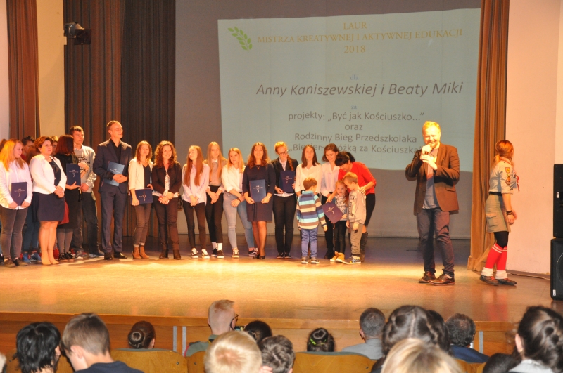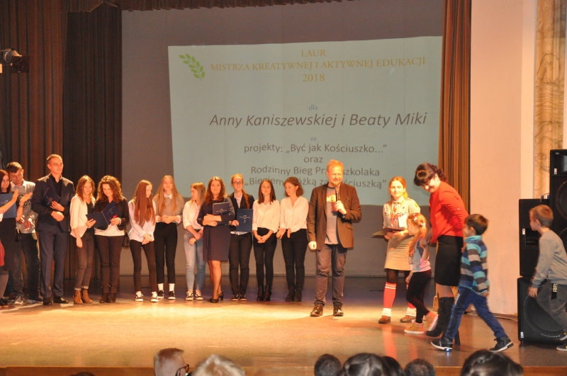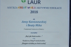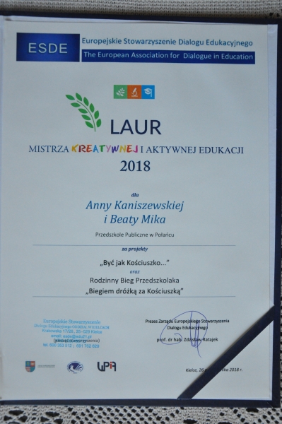 W tym dniu na uroczystej gali Pani dyrektor Anna Kaniszewska z przedstawicielami przedszkolaków odebrała Laur Mistrza Kreatywnej i Aktywnej Edukacji dla Przedszkola Publicznego w Połańcu. Wyróżnienie to nasza placówka otrzymała za realizację projektów „Być jak Kościuszko” – żywe lekcje historii przedszkolaków i Rodzinny Bieg Przedszkolny „Biegiem dróżką za Kościuszką” .