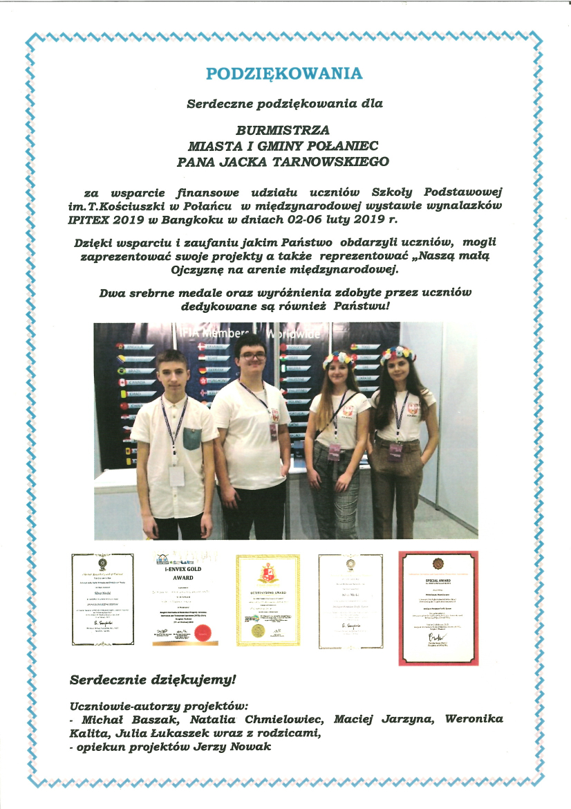 Rodzice, uczniowie i opiekun projektu reprezentujący nasz kraj na wystawie w Bangkoku składają szczególne podziękowania dla UMiG, Rady Rodziców, Pani dyrektor, nauczycieli, sponsorów i wszystkich osób, które miały udział w tym sukcesie. Składam serdeczne gratulacje nagrodzonym, wyróżnionym uczniom i rodzicom oraz życzenia dalszego wszechstronnego rozwoju.