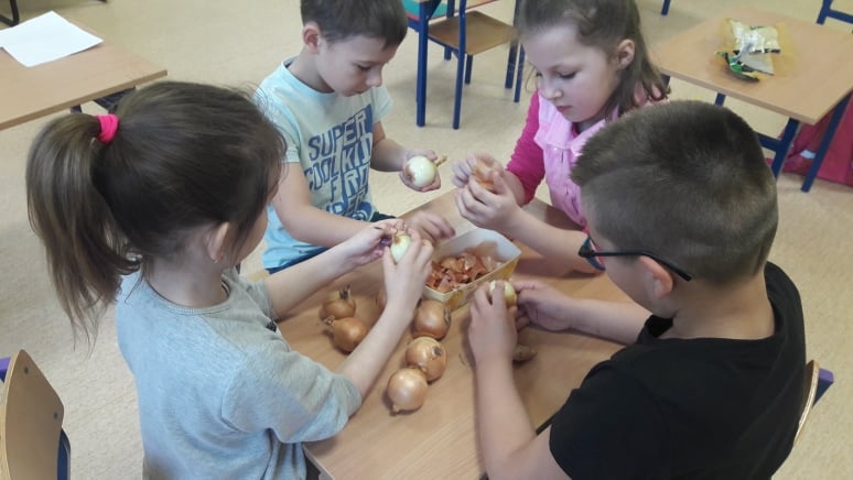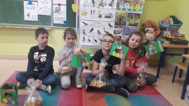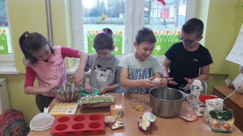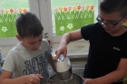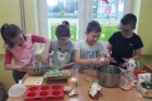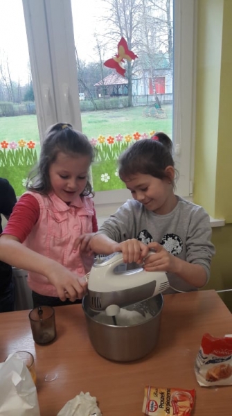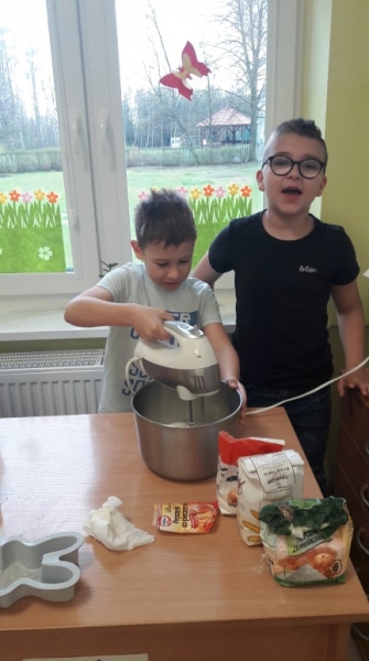 Święta wielkanocne to czas, kiedy na stołach oprócz święconki goszczą mazurki i puszyste babki. Pyszne świąteczne smaki i zapachy towarzyszyły również uczniom klasy I. W piątek 12 kwietnia dzieci aktywnie uczestniczyły w przygotowaniu i wypieku bab, zrobienie ich nie jest wielką sztuką. Wystarczy kilka jajek, mąka, cukier, proszek do pieczenia, majonez, cytryna i chęci do pracy, których pierwszakom nigdy nie brakuje. Dzieci same ucierały ciasto, a następnie wypełniały formy do pieczenia. W całej szkole unosił się aromatyczny zapach, który wprawił wszystkich w dobry, świąteczny nastrój. Uczniowie wykazali się dużą pomysłowością, wszystkie wypieki miały swój indywidualny charakter i wyjątkowy smak. Wspólne pieczenie i kolorowanie jajek było doskonałym pretekstem do rozmów o świętach, zwyczajach i tradycji.